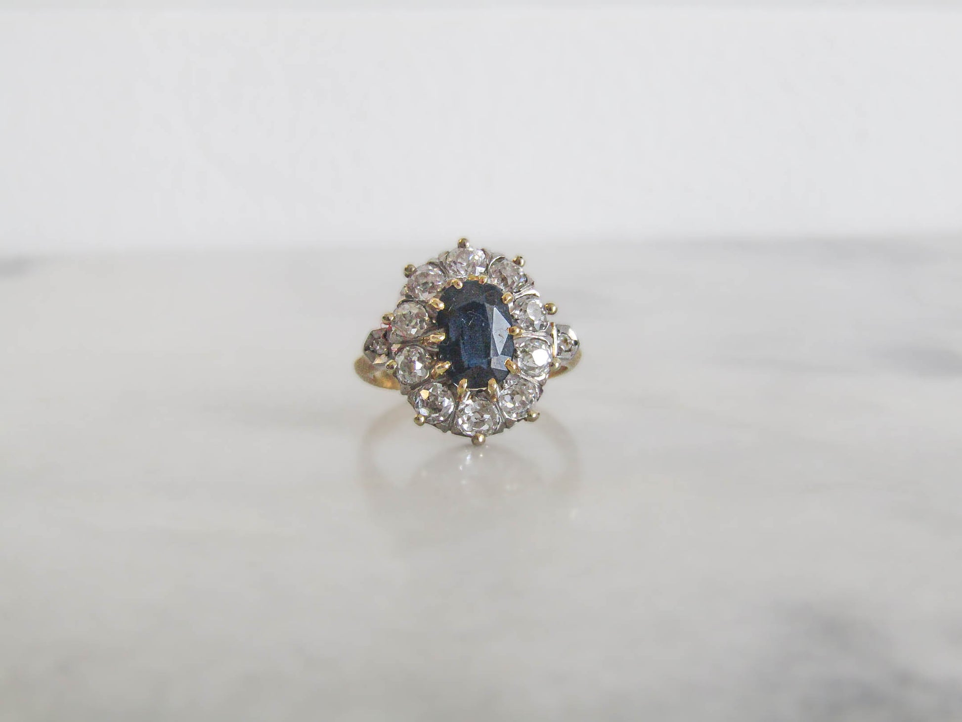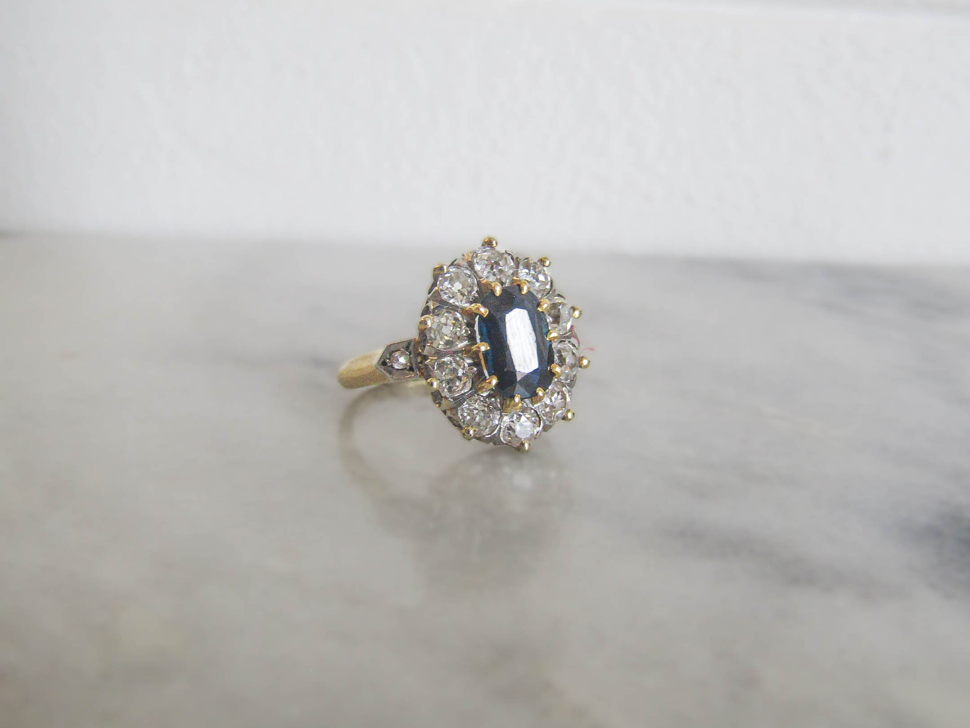 The ring showcases a classic French design with its halo setting, raised shoulders and diamonds set in white gold. This element was typical of the period to help reflect the light around the diamonds and enhance their brilliance. Atypically, white gold prongs reach up to cradle the center of the stones, making for a very pretty contrast. This style is very popular in France, where sapphires are perceived as a subtle and chic choice. The ring, found at a reputable estate seller in Paris, bears hallmarks for 18k gold. The ring face measures 15 mm by 12.8 mm, with a height of 6 mm off the finger.