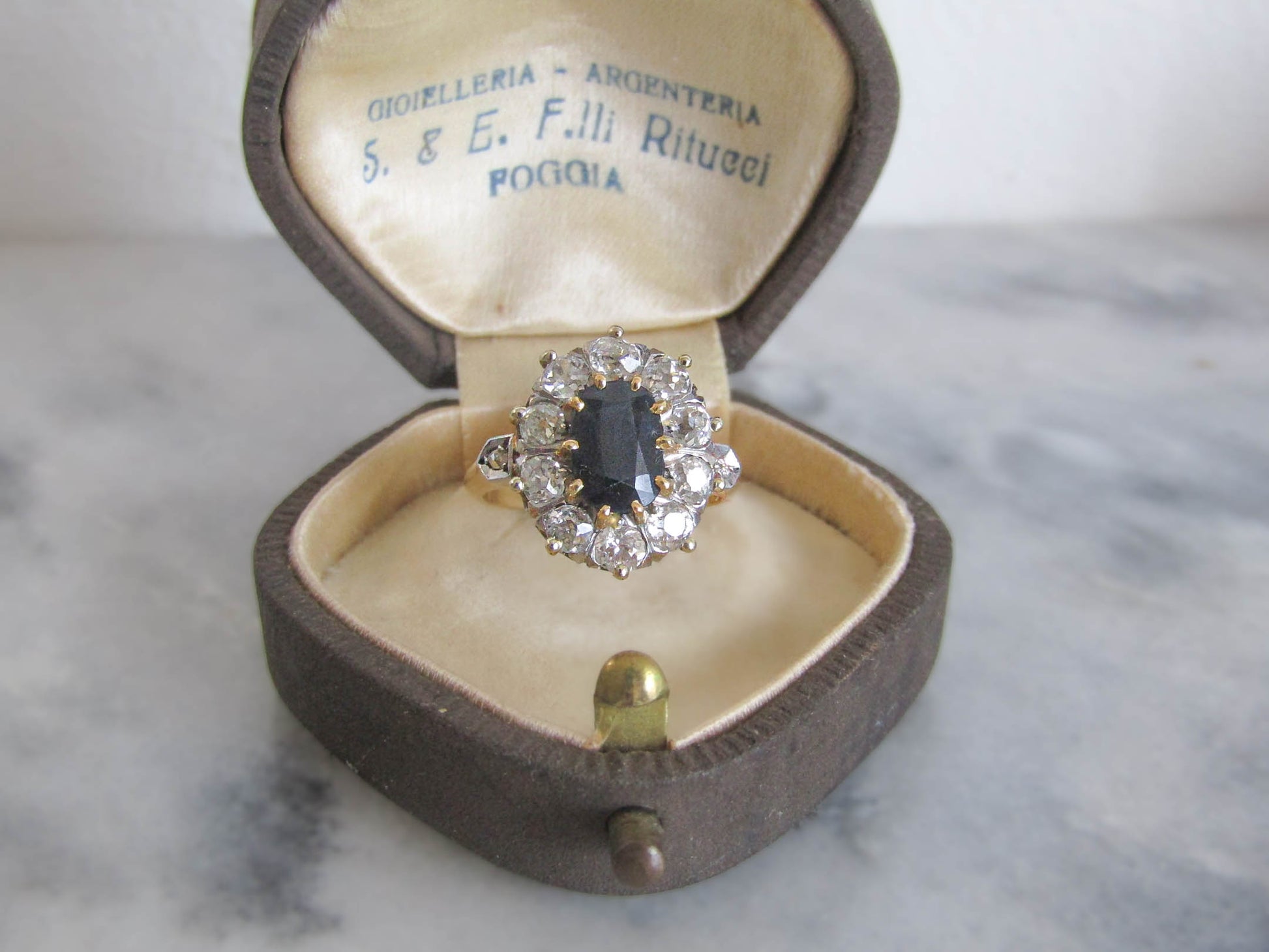 The ring is in excellent antique condition with very light wear to the facets visible under magnification. The sapphire is a deep blue and shines very beautifully in the light. The diamonds are in excellent condition with no wear to the facets. The ring has not visibly been resized.