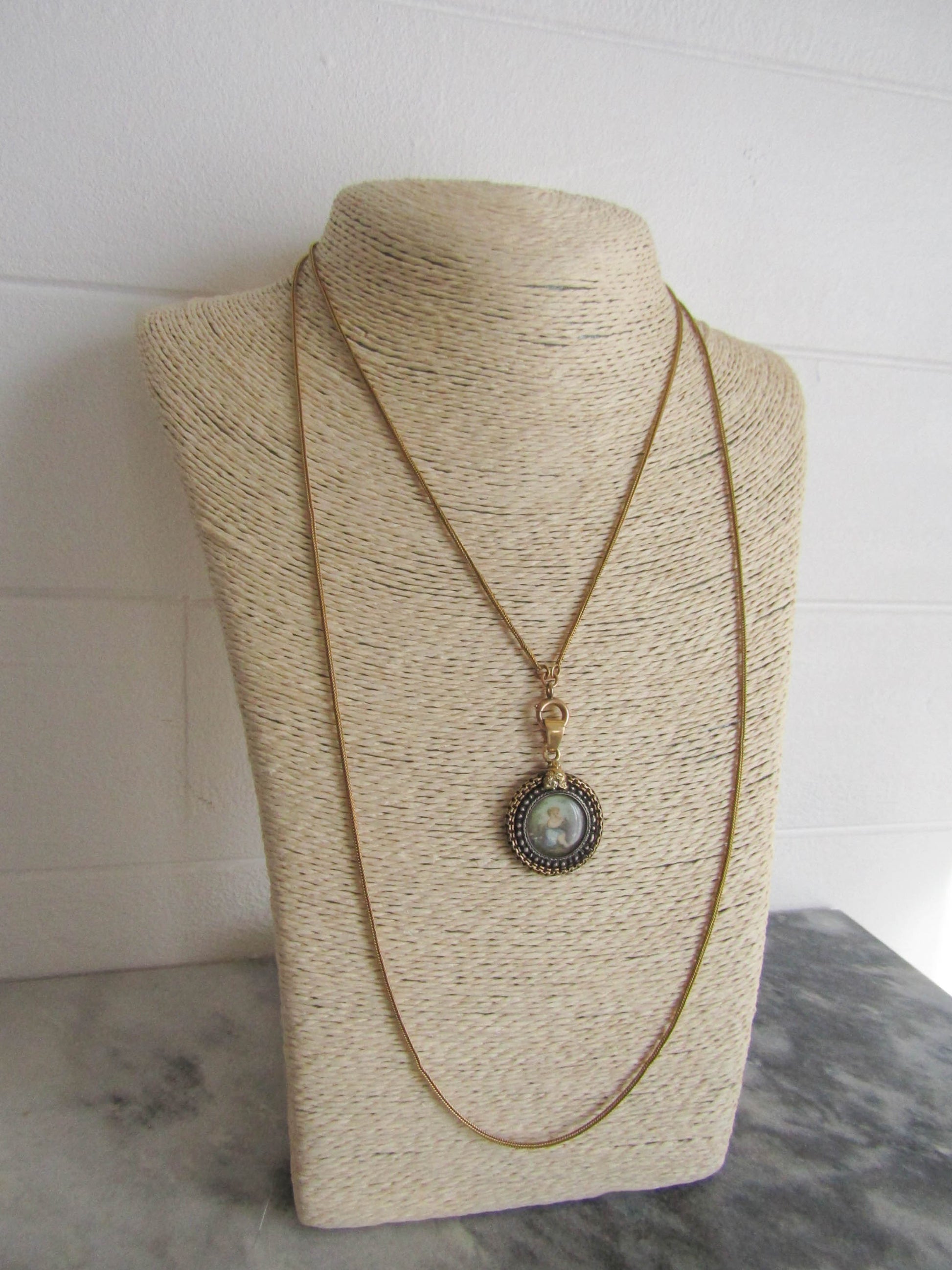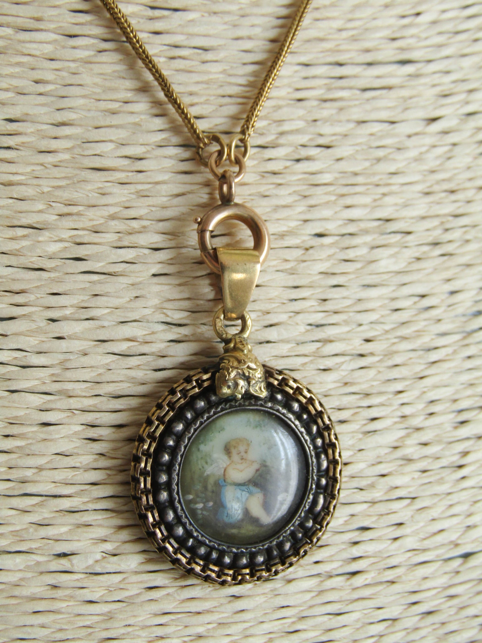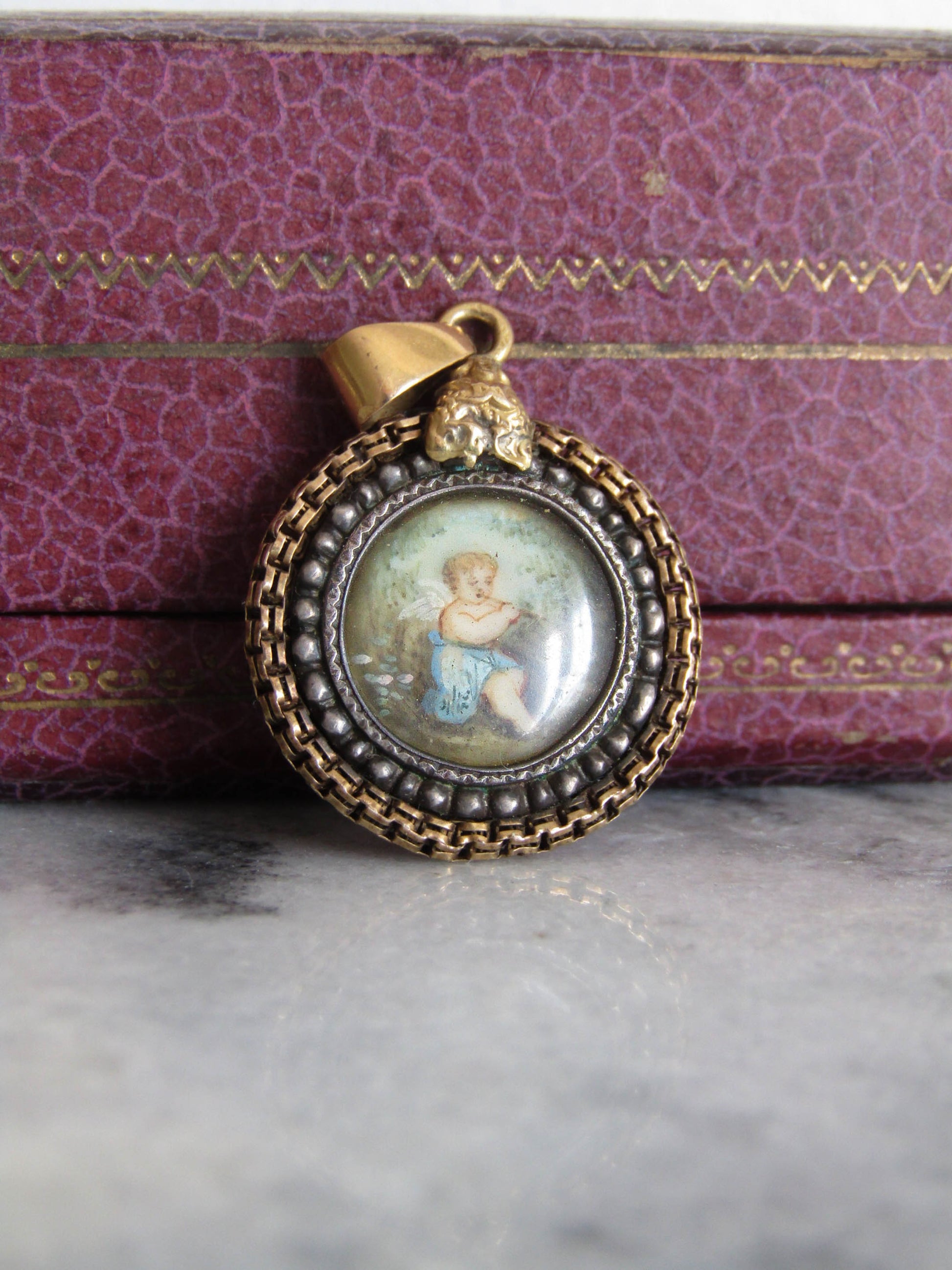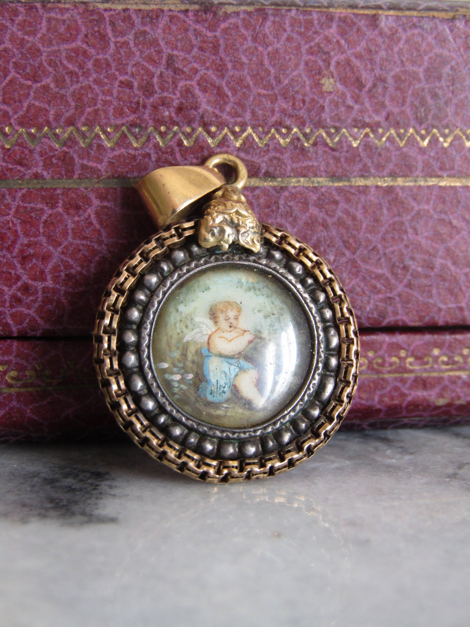 This beautifully crafted pendant features a central hand-painted cherub which has been carefully placed behind glass and inserted into an intricate silver and gold frame. The bail is hallmarked with an owl guaranteeing minimum 18k gold purity. A unique and sweet addition to any collection, the style quite literally allows you to wear a work of art.