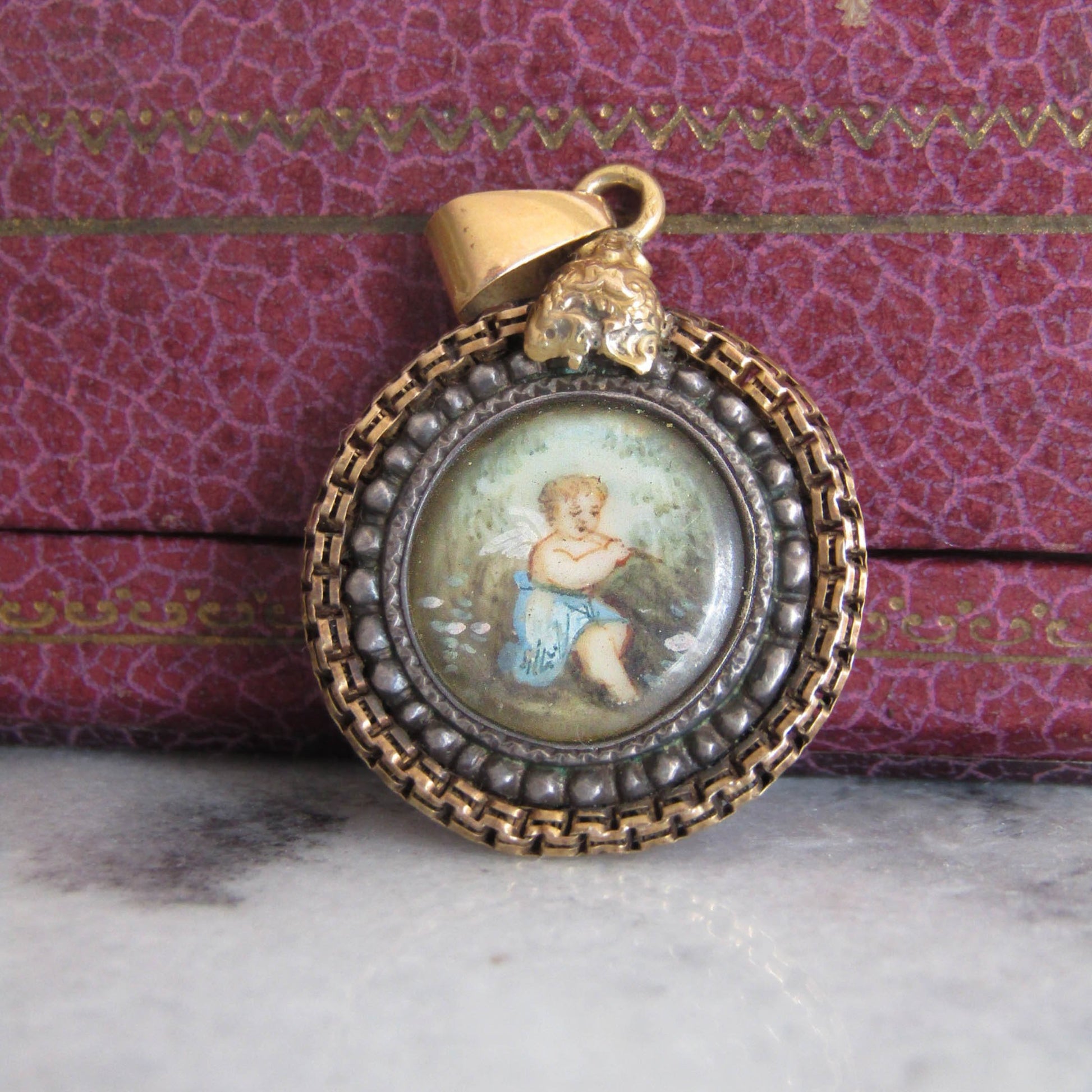 18K Gold and Silver Painted Cherub Pendant