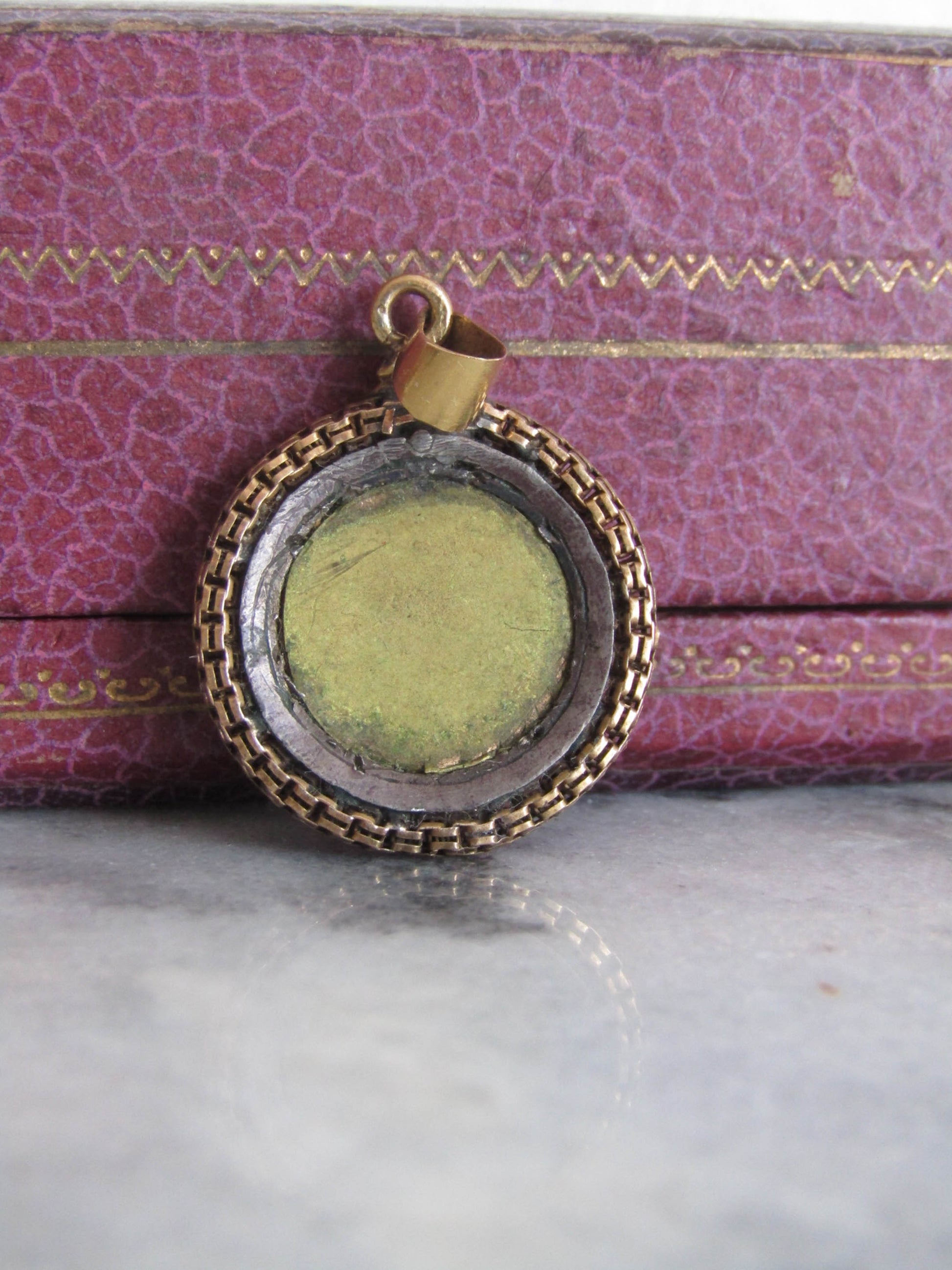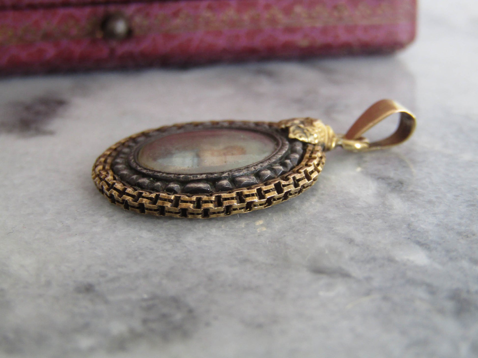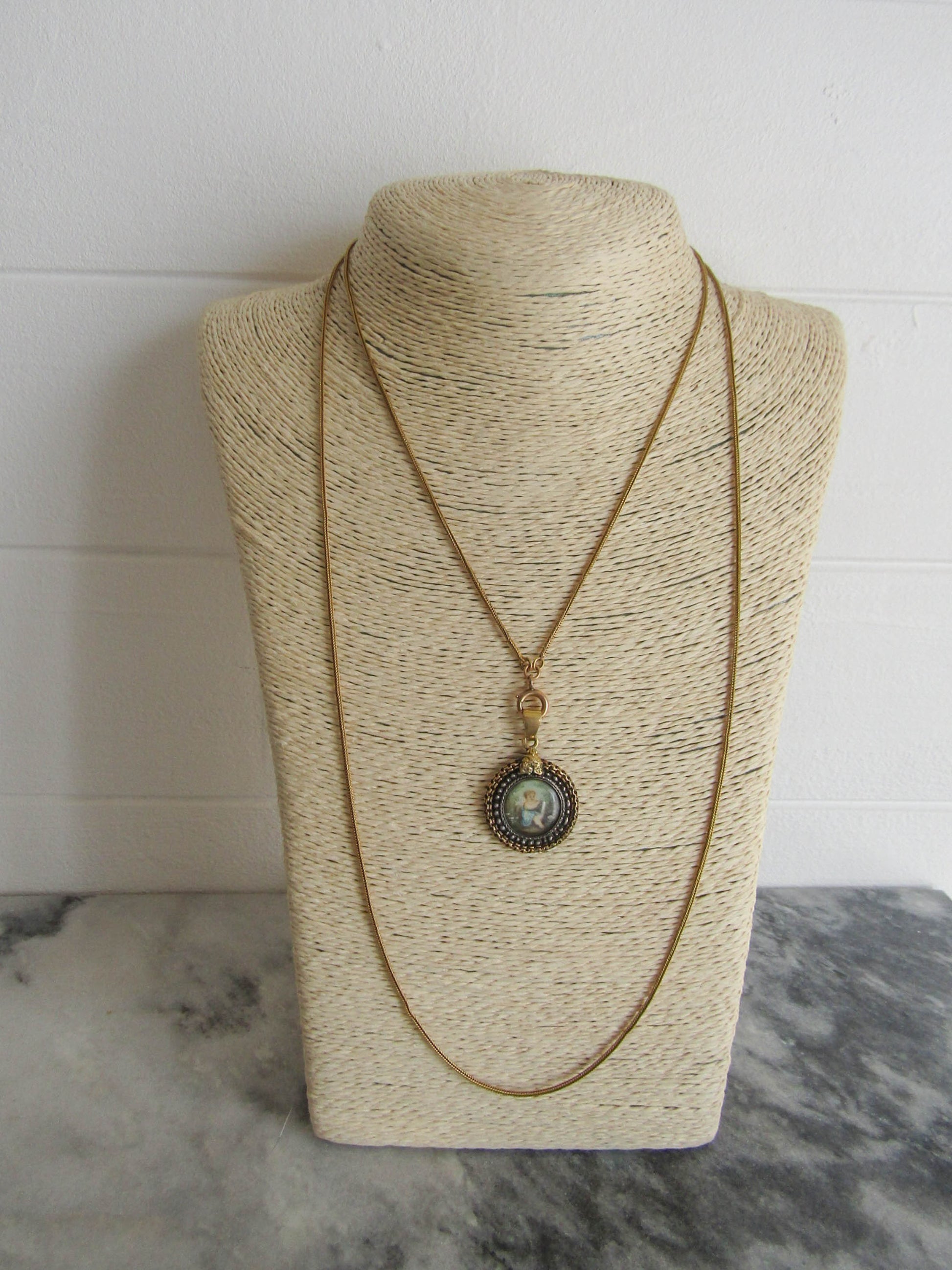 The pendant is in very good condition for age. The bail is strong and works well. The painting is in good condition but you will need to avoid water to avoid damaging it.