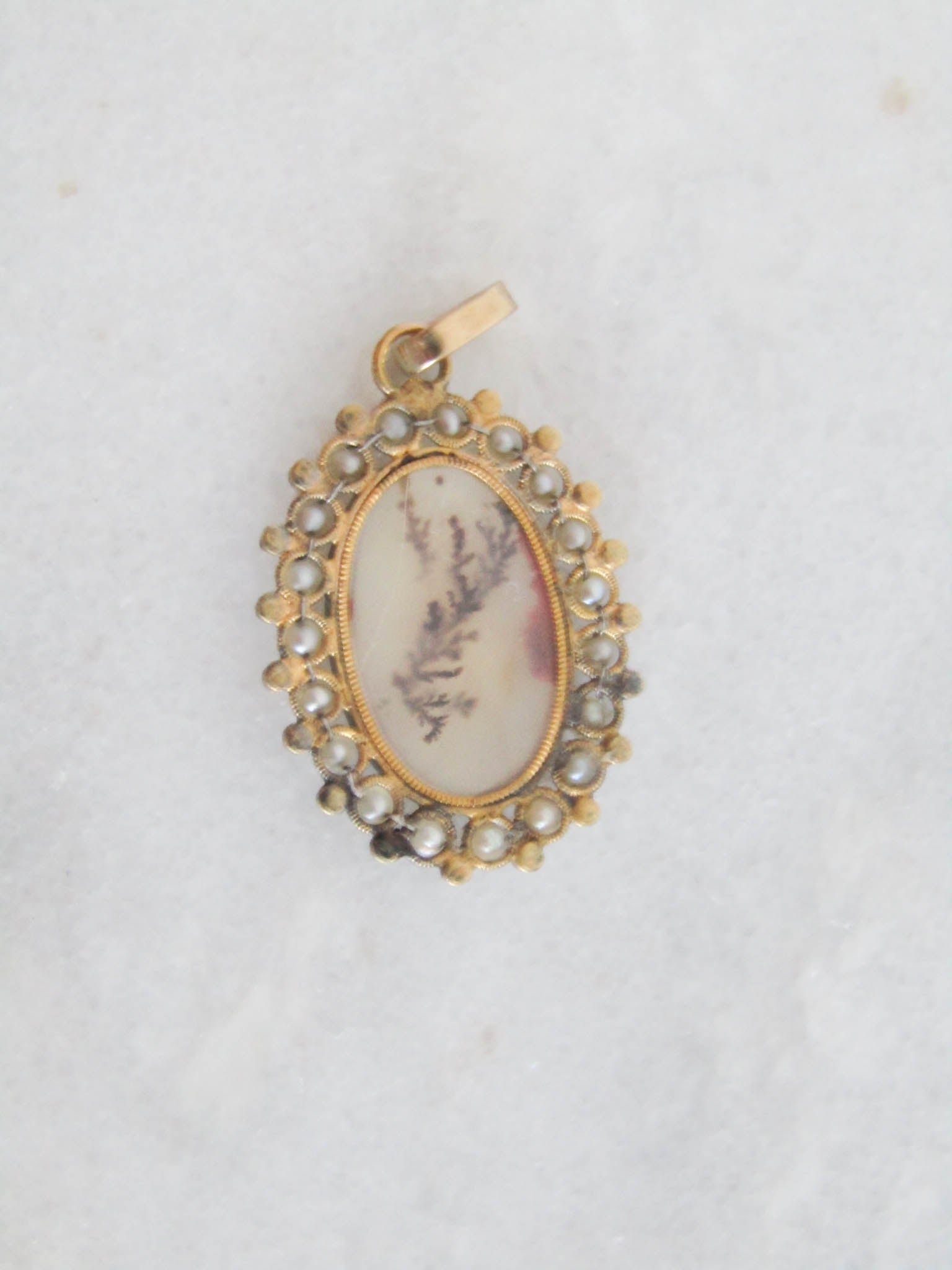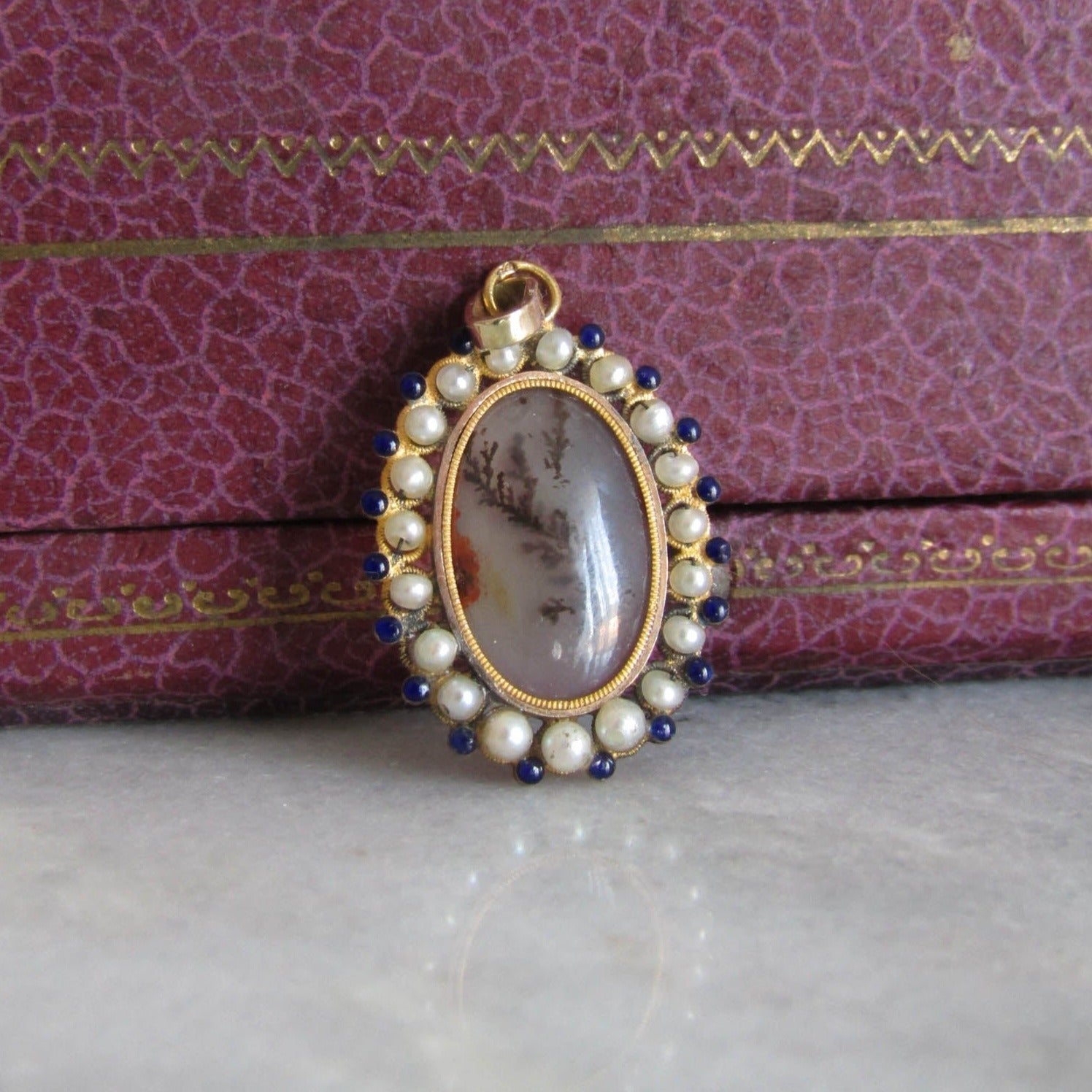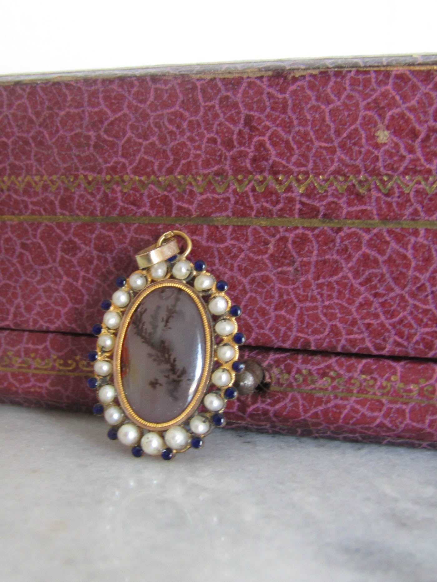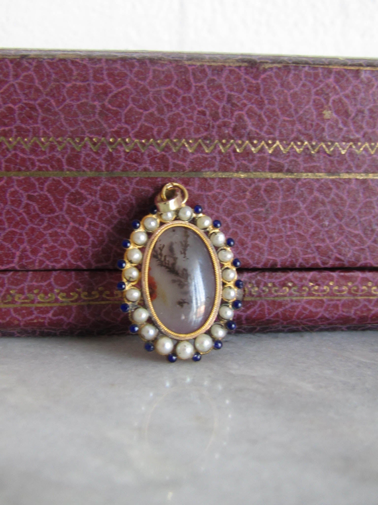 18K Rare Georgian Dendritic Moss Agate, Pearl, and Enamel pendant c. 1815