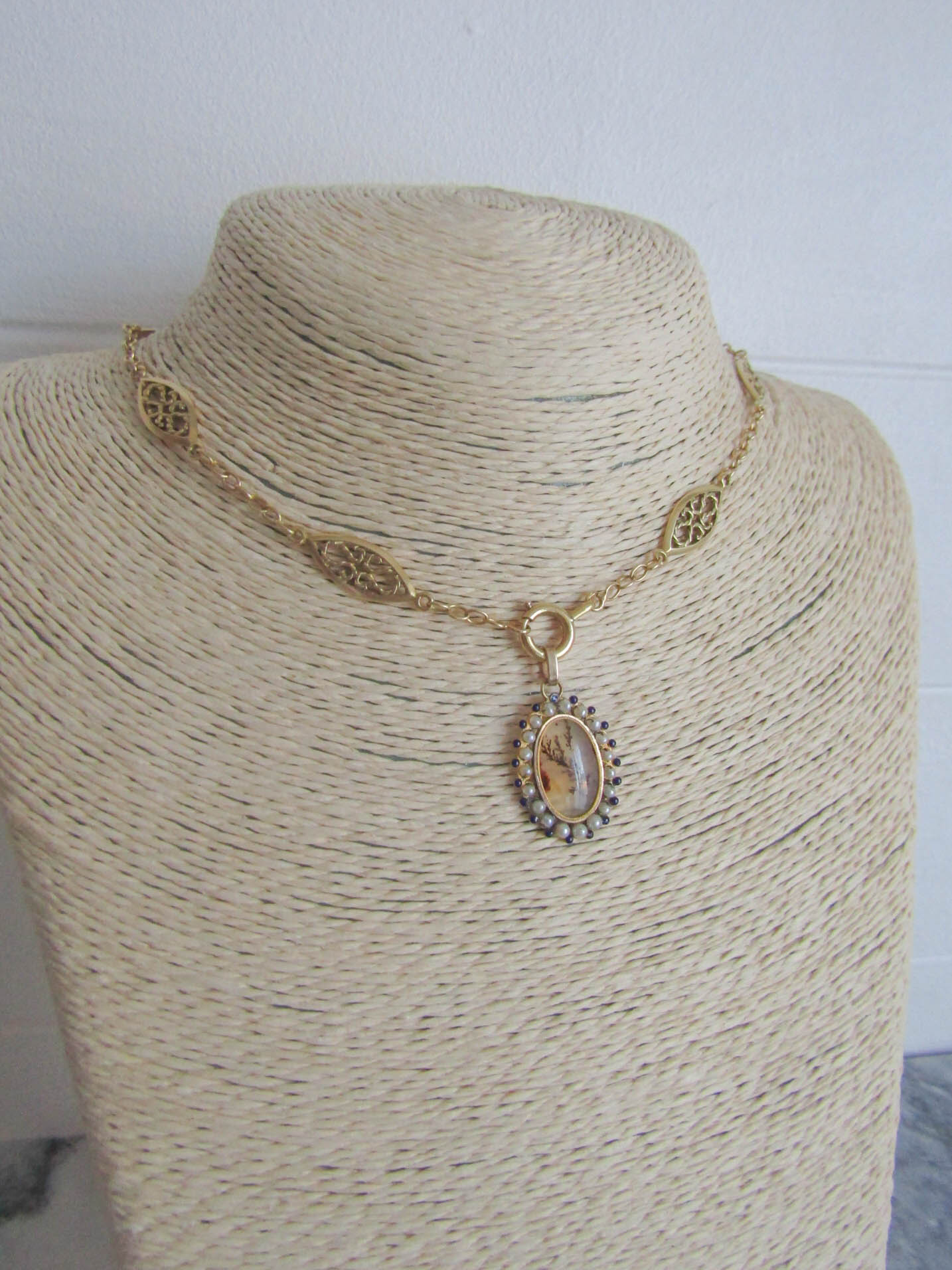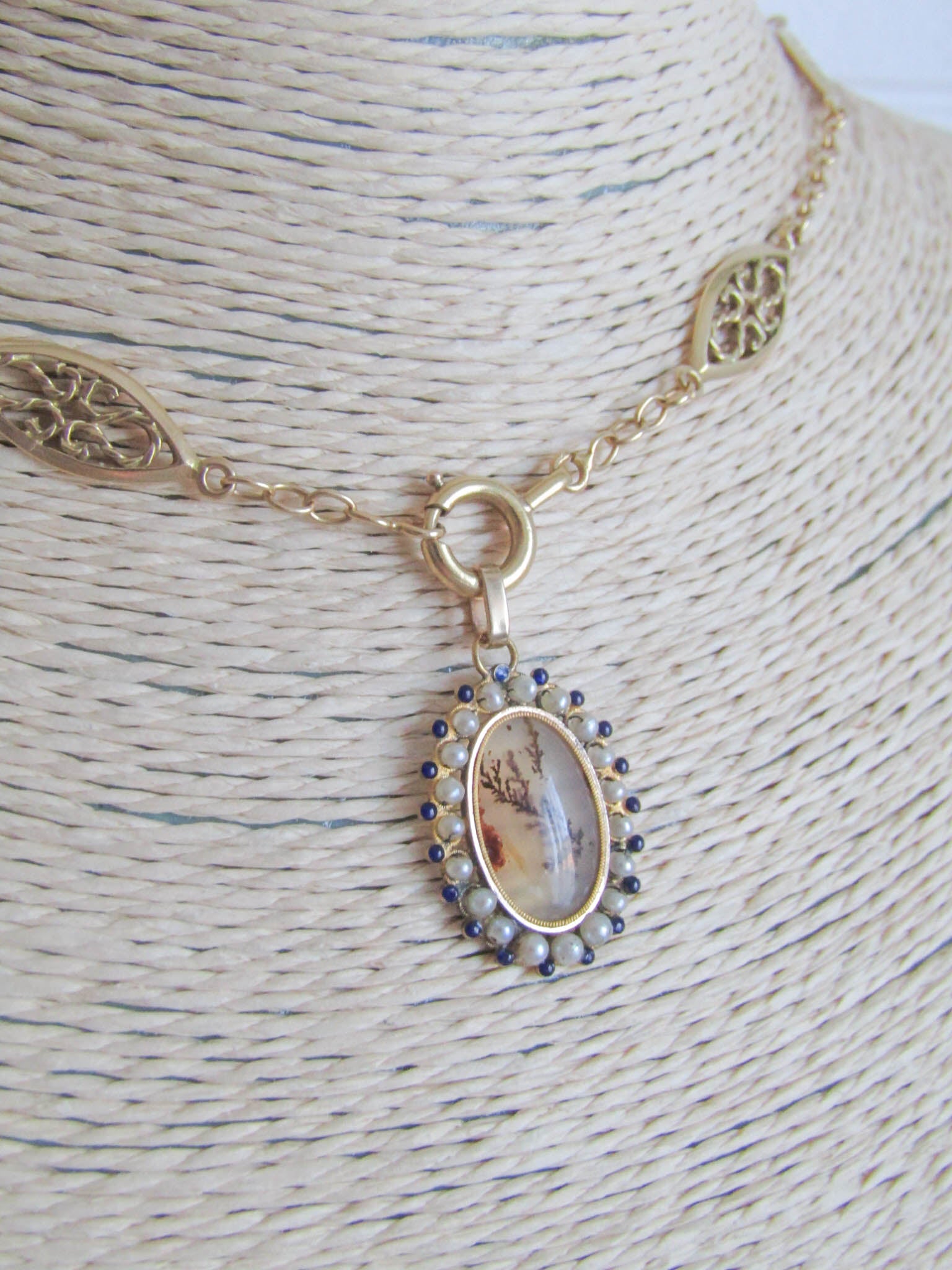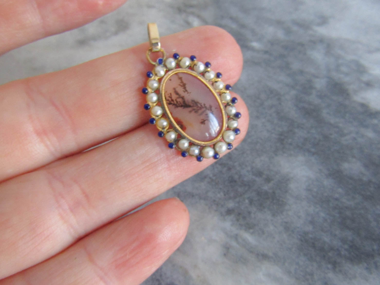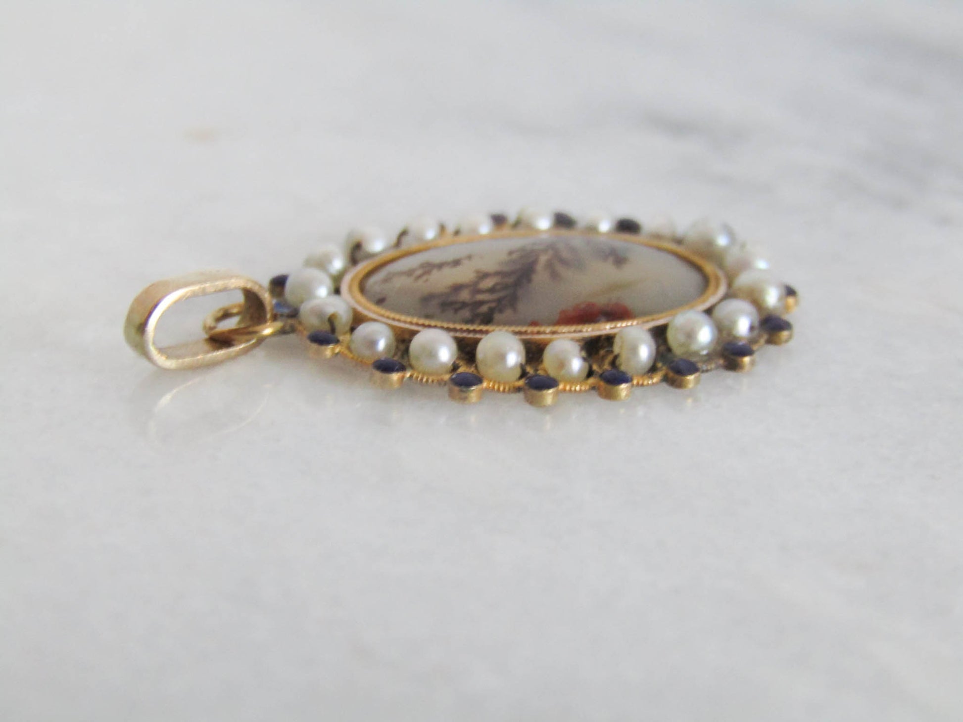 18K Rare Georgian Dendritic Moss Agate, Pearl, and Enamel pendant c. 1815