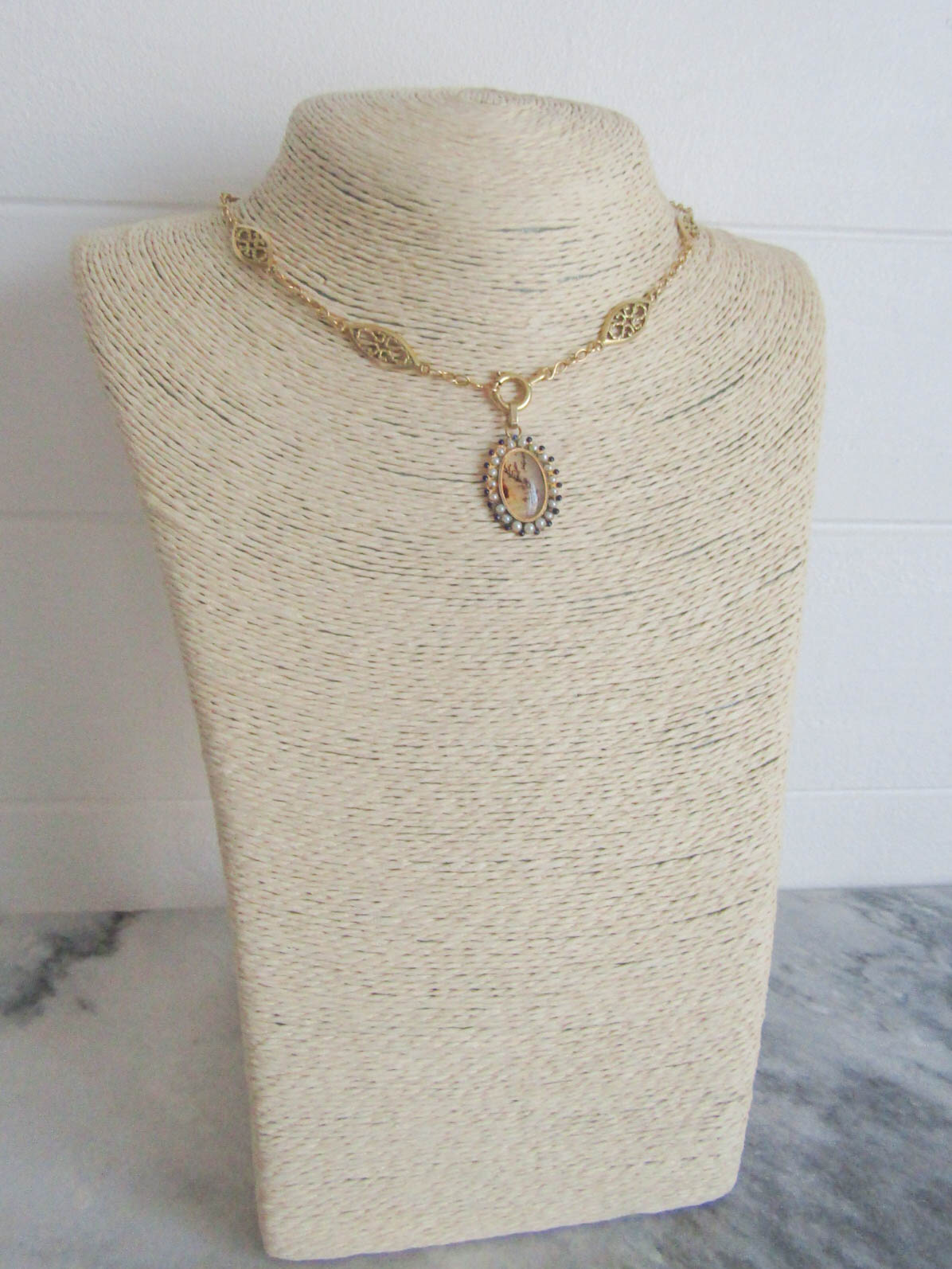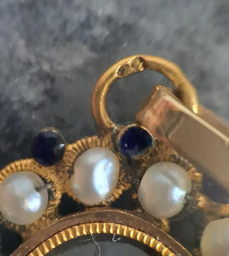 The pendant is in excellent antique condition with all original pearls and enamel intact. The four bottom pearls have been glued in at a later date after being separated from the metal wire which attached them to the frame. They are stable but will still need to be treated with care as it is a very old pendant.