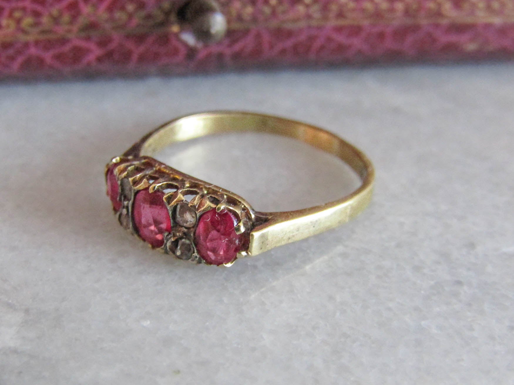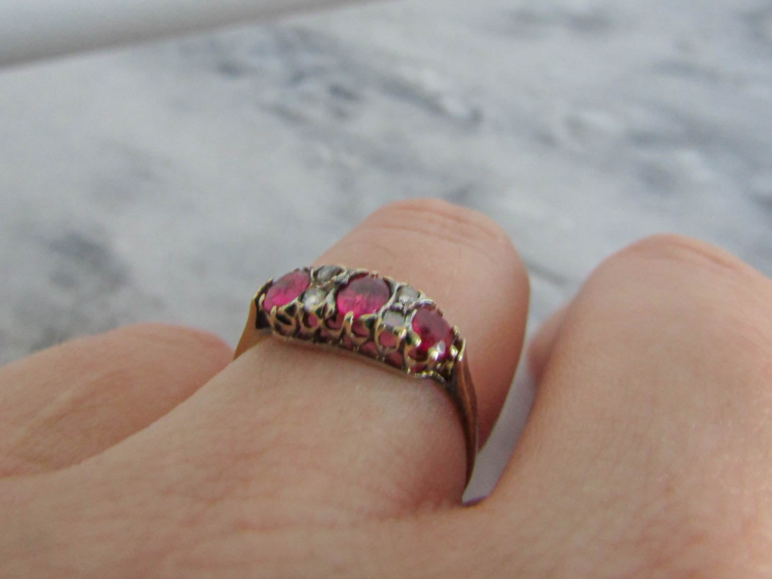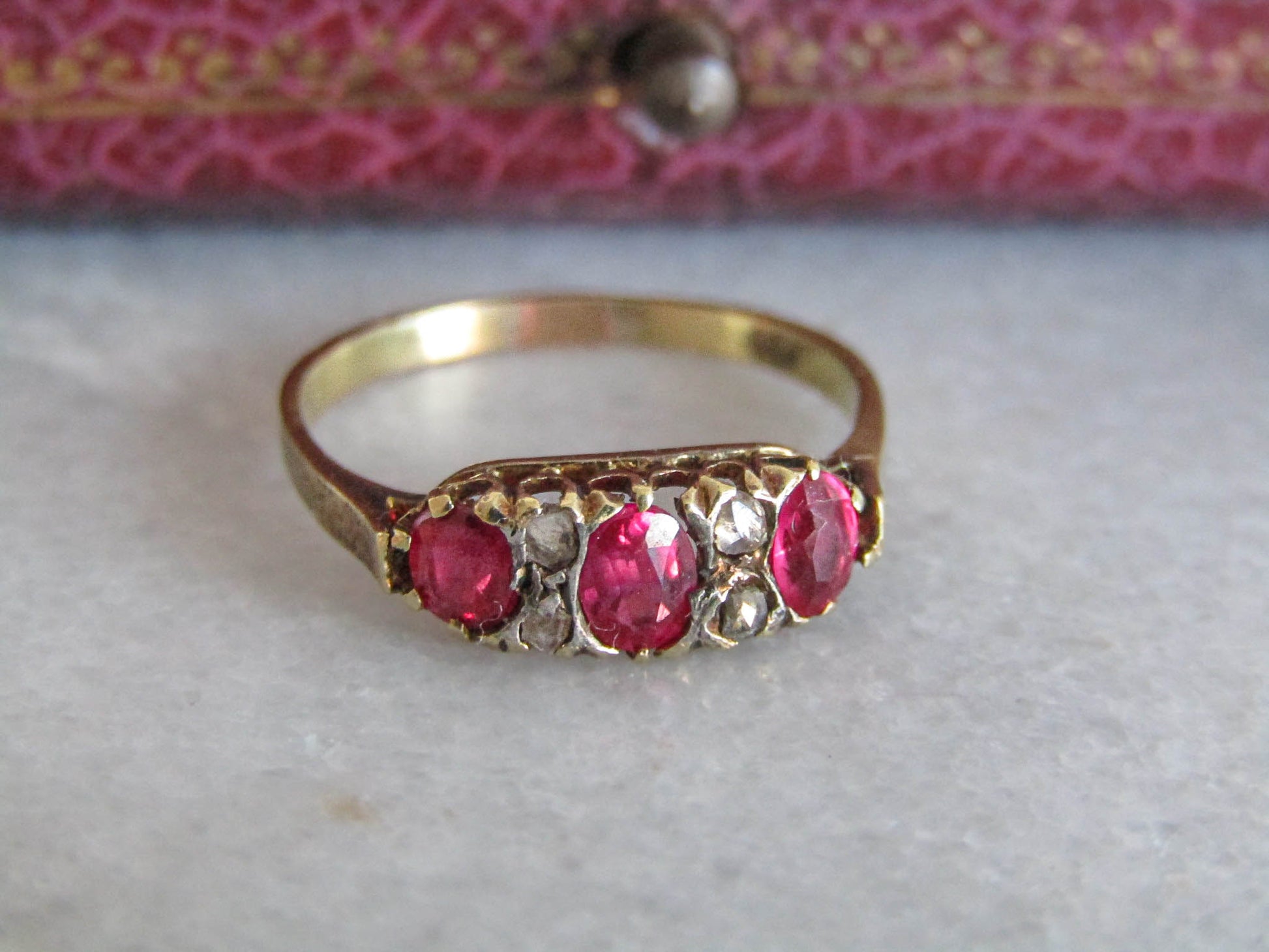 This lovely little Edwardian ring features three natural, pinkish red rubies which are separated by four rose cut diamond chips. The stones are prong set in 18k gold have been inspected for wear and fixed so that the prongs hold the rubies securely. A few of the prongs which hold the central ruby have worn with time but the remaining two prongs hold the central stone in place. The head of the ring measures 13 mm x 4 mm while the central ruby measures 4 mm x 3 mm. The ring has been resized larger once from a French 48 to a 52, so this one is for those with small fingers. The hallmark has been worn or removed with resizing but the ring purity has been verified by an acid test. It is a beautiful ring with an understated charm crafted around the turn of the century.