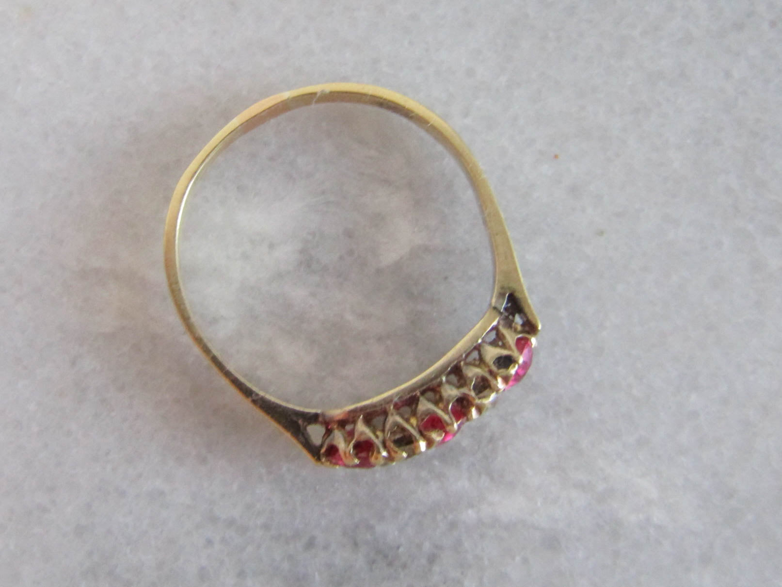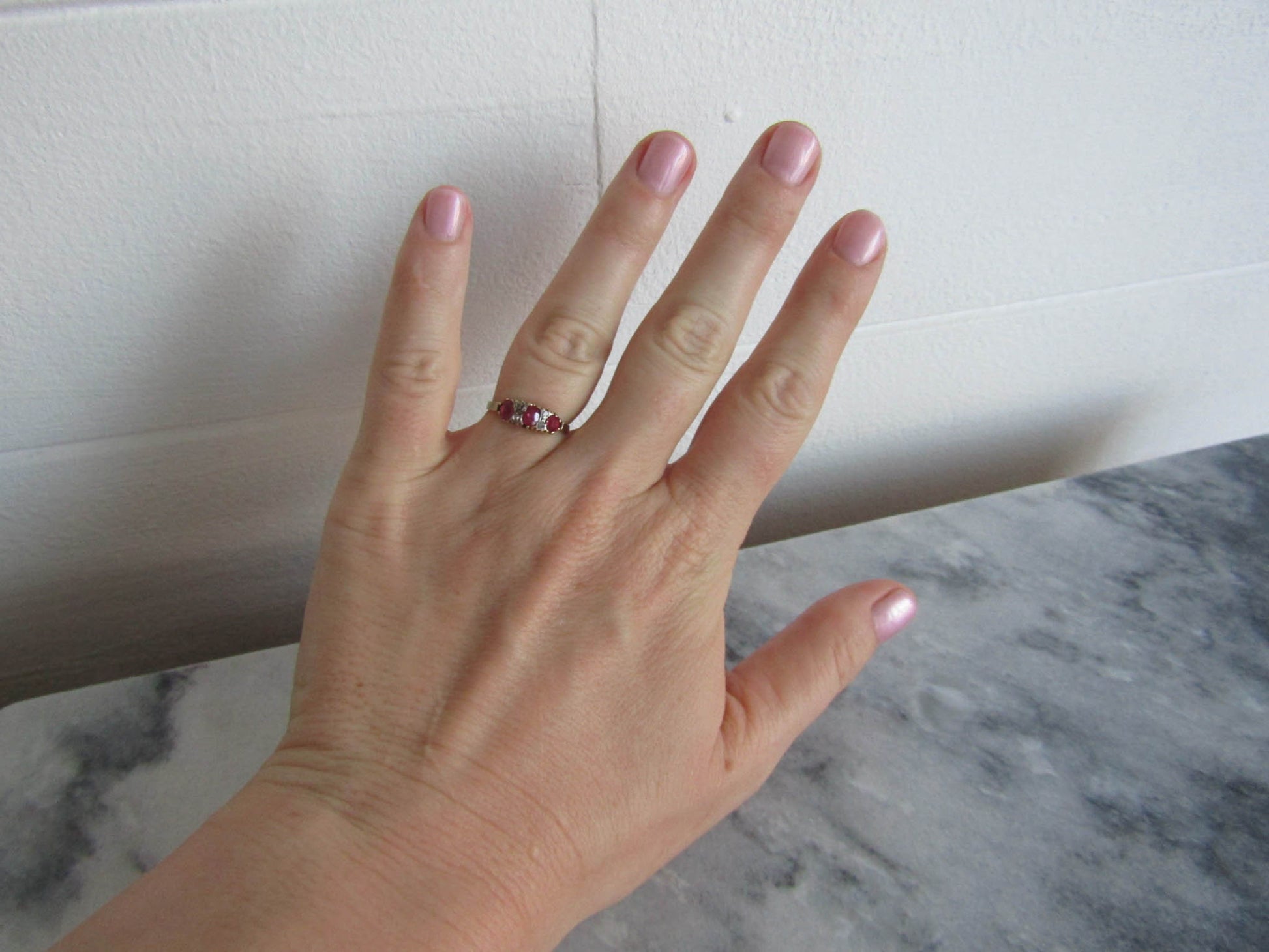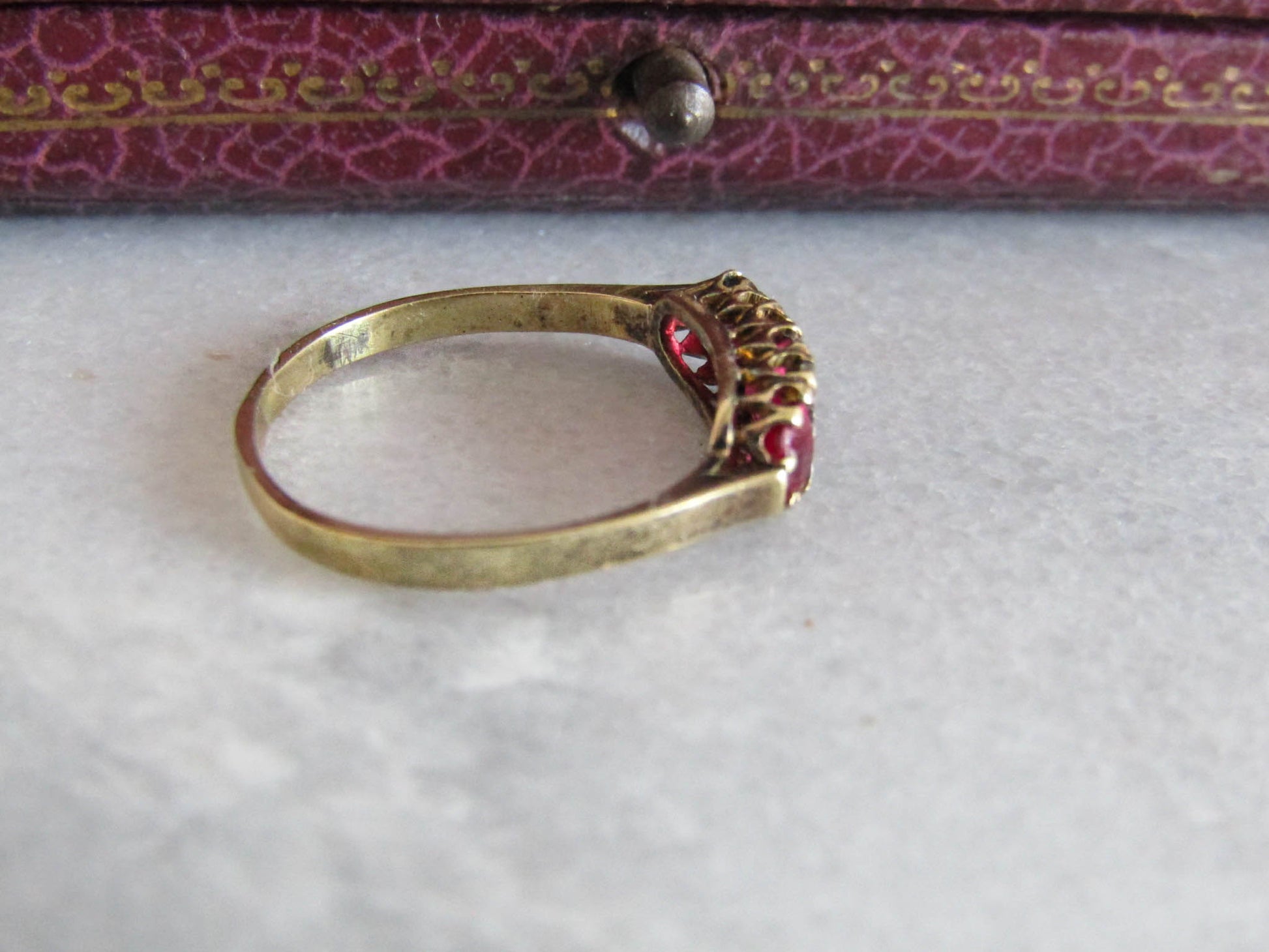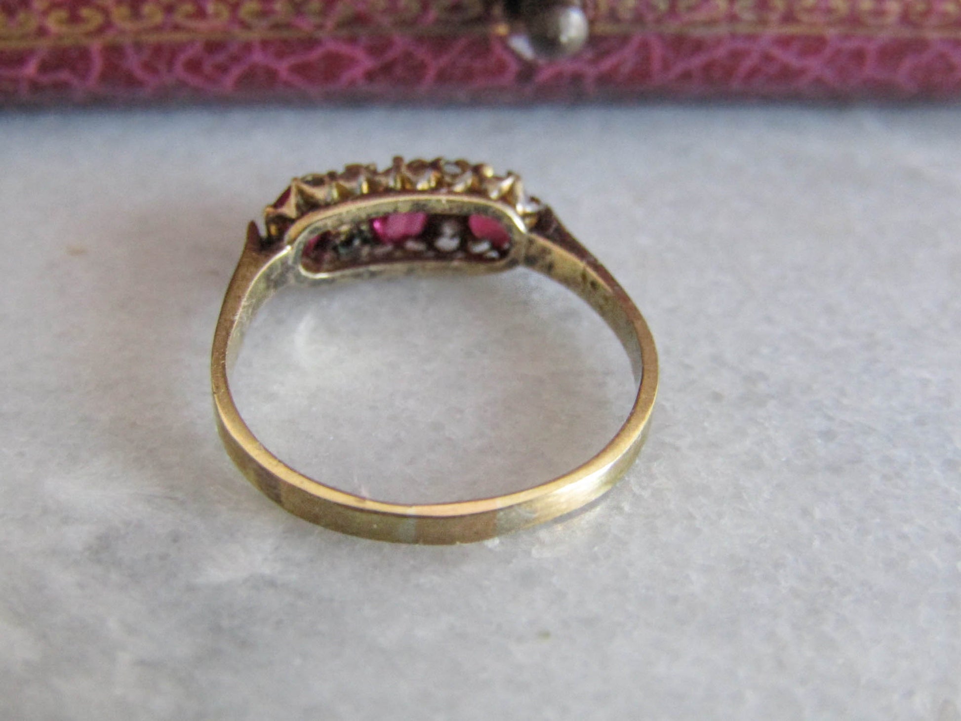 This lovely little Edwardian ring features three natural, pinkish red rubies which are separated by four rose cut diamond chips. The stones are prong set in 18k gold have been inspected for wear and fixed so that the prongs hold the rubies securely. A few of the prongs which hold the central ruby have worn with time but the remaining two prongs hold the central stone in place. The head of the ring measures 13 mm x 4 mm while the central ruby measures 4 mm x 3 mm. The ring has been resized larger once from a French 48 to a 52, so this one is for those with small fingers. The hallmark has been worn or removed with resizing but the ring purity has been verified by an acid test. It is a beautiful ring with an understated charm crafted around the turn of the century.
