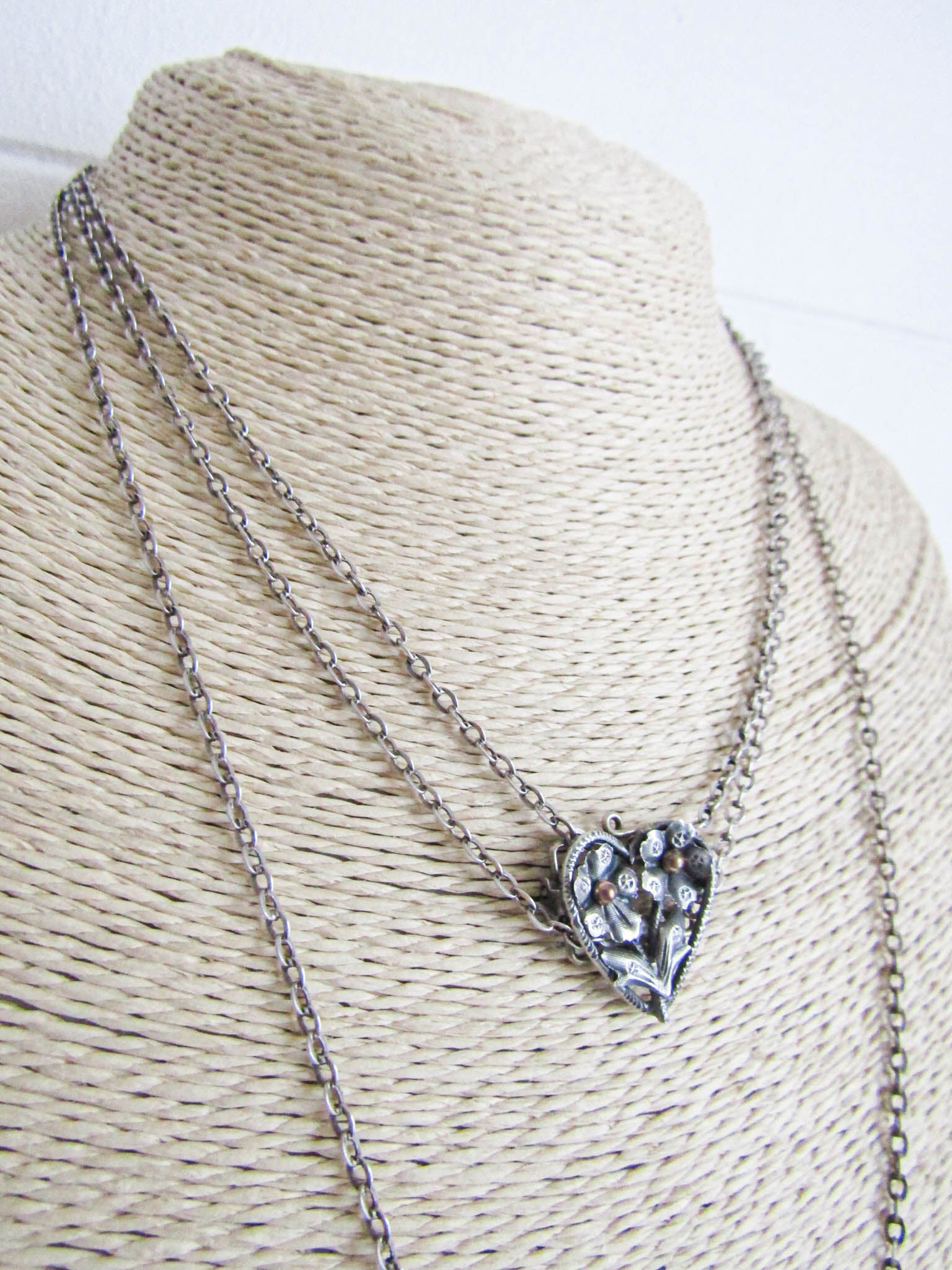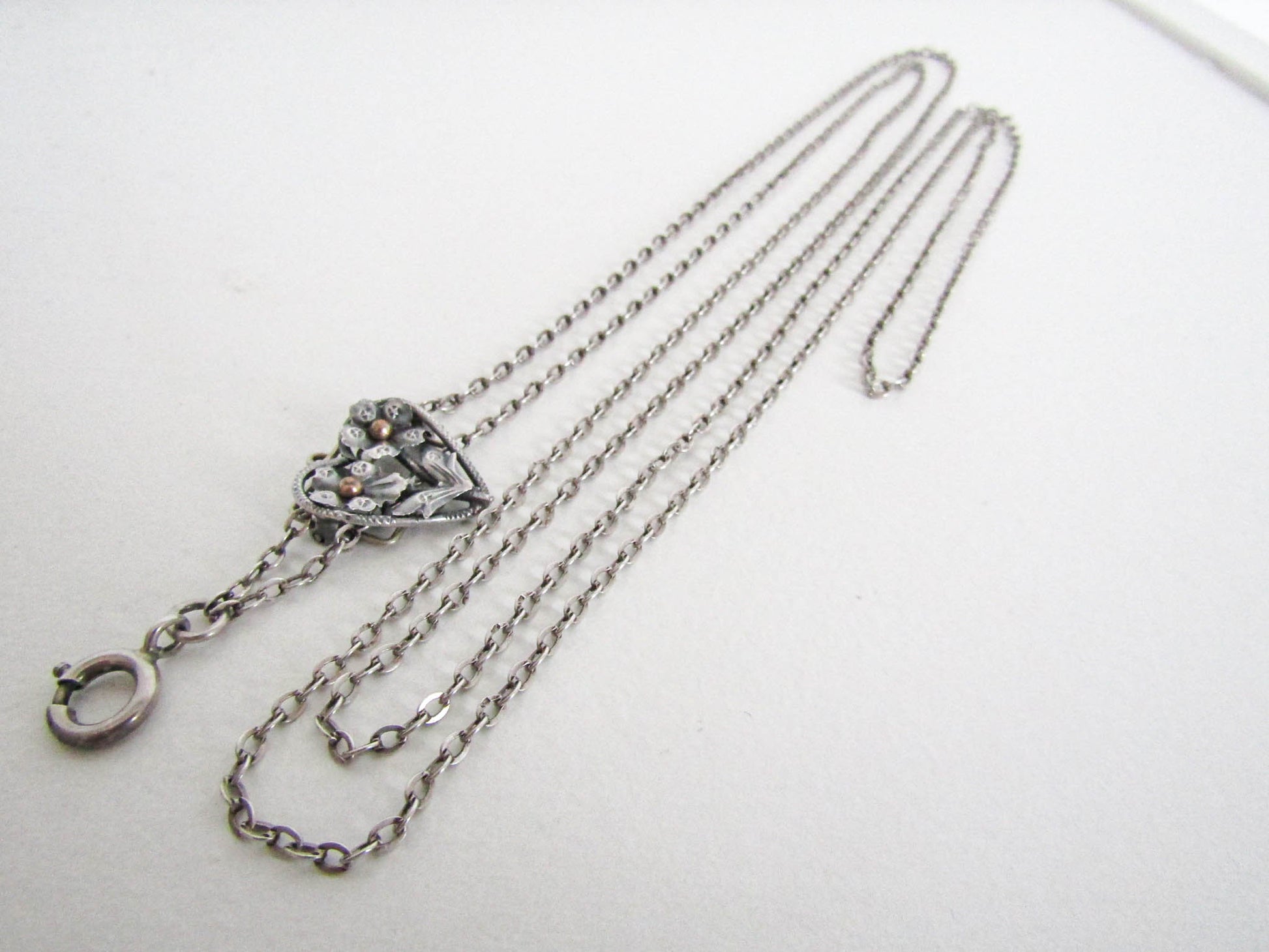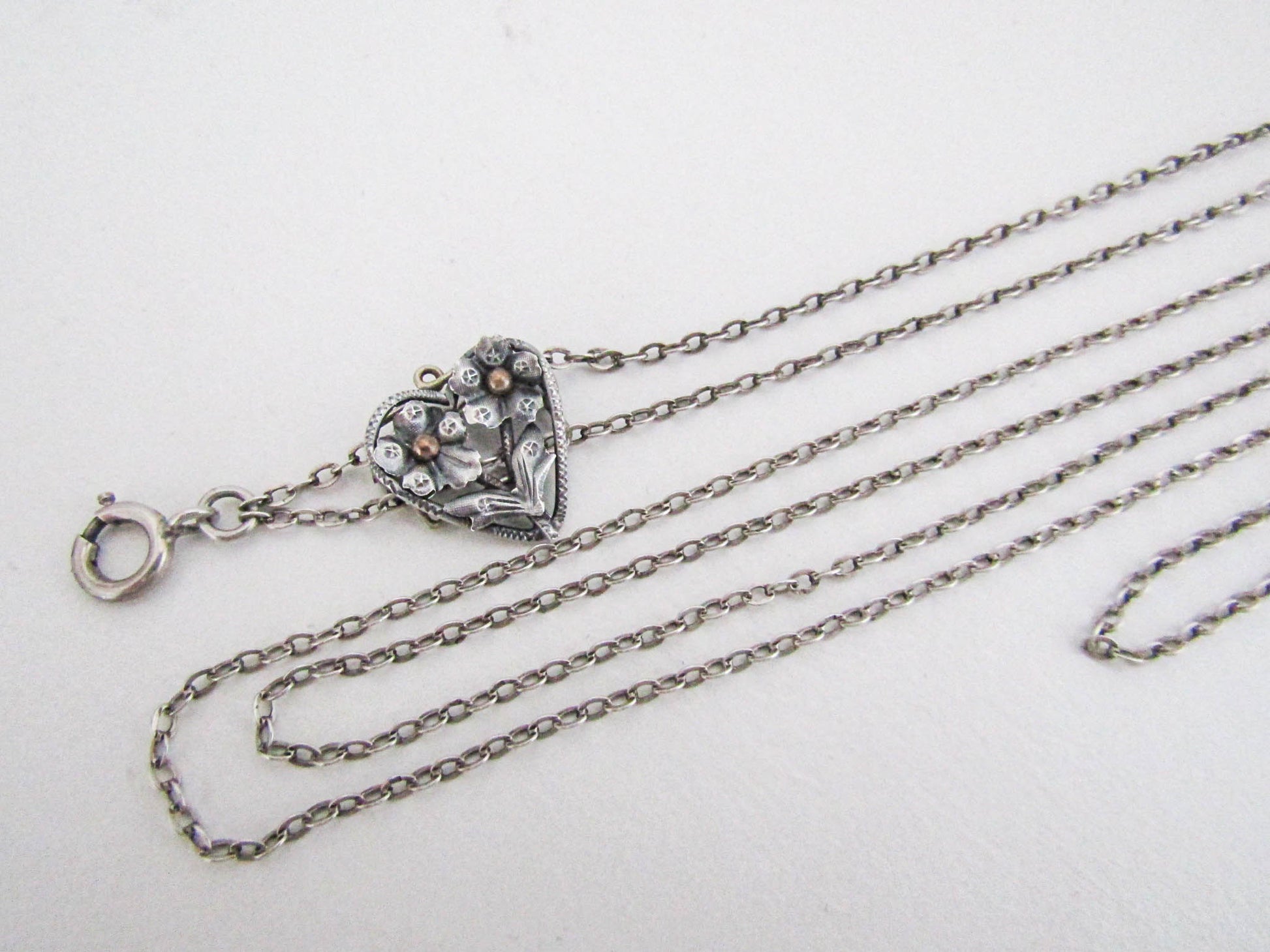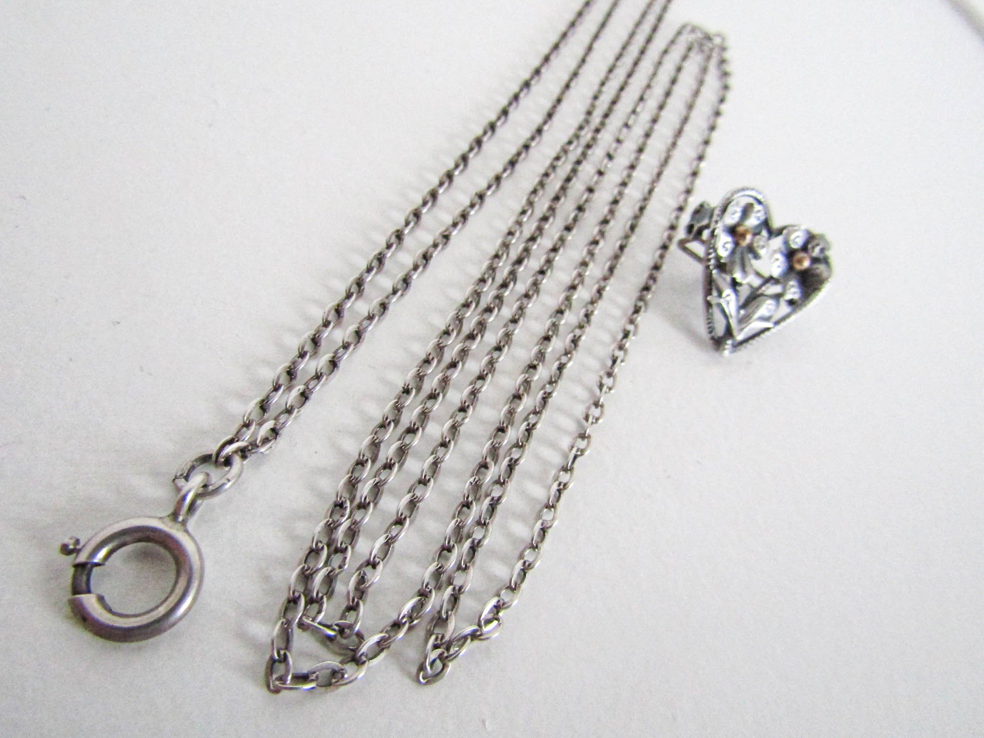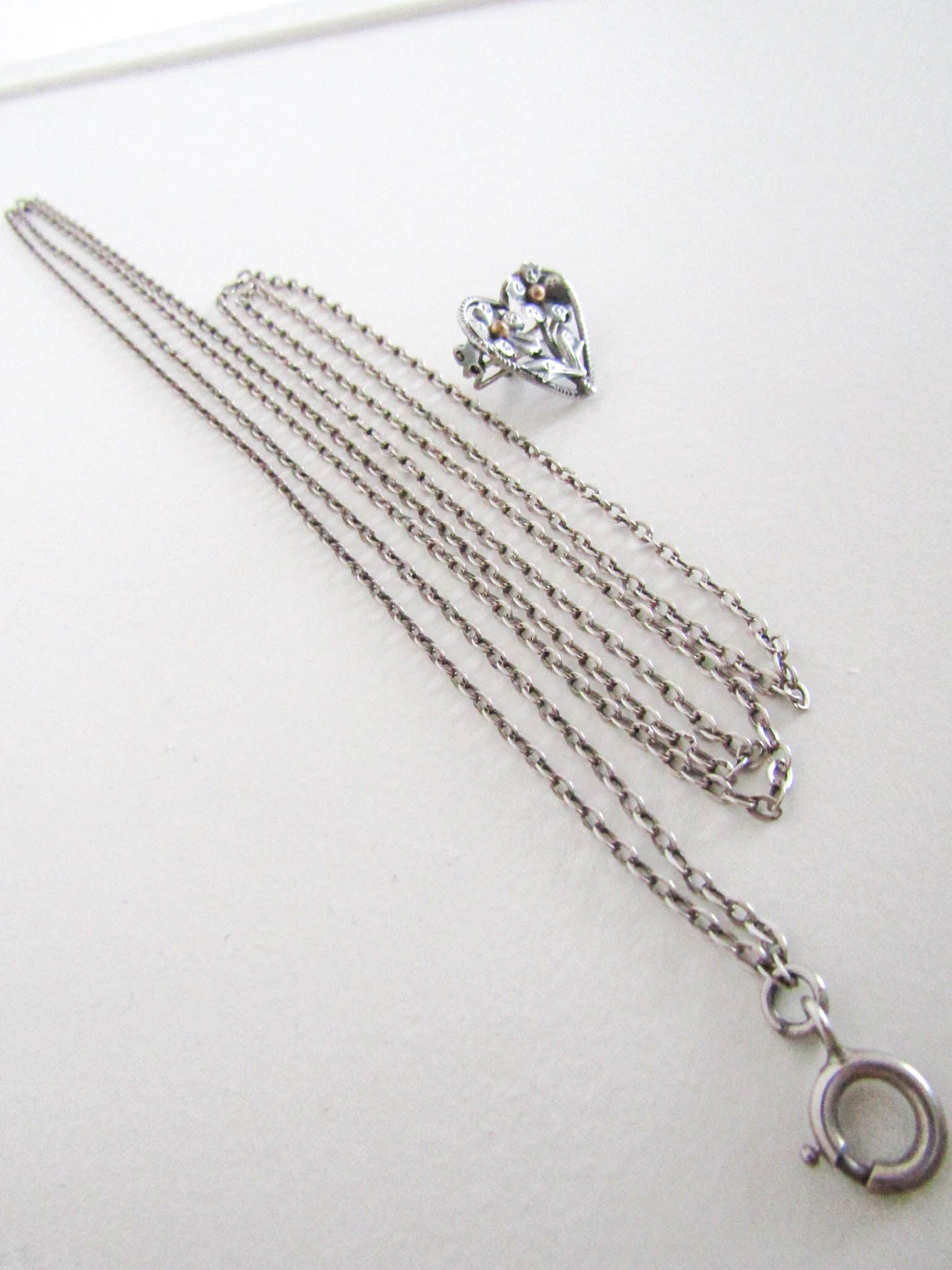 Simple and timeless, this rolo chain long guard has a full length which reaches over 55 inches. Although there is no closure, chains of this length can easily be wrapped two or three times overheard. They are excellent versatile chains as they can be mixed and matched with other chains or worn at different lengths for a different style every time. This long guard features the original slide, which consists of two forget me not flowers bending towards each other in the shape of a heart. The center of the flowers is decorated with rose gold fill, which contrasts nicely with the aged silver. The long guard has been left with some tarnish to make the features pop. The hanging bolt ring is strong with good tension and alignment. It is a whimsical and romantic chain which would make a lovely gift for the antique lover in your life, or yourself.