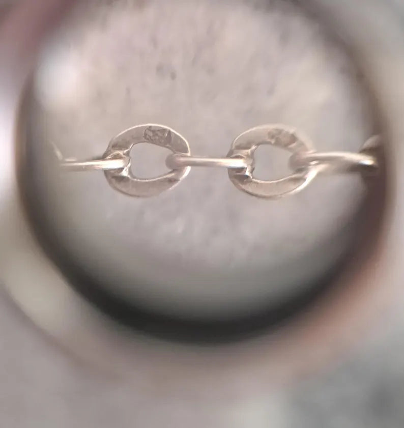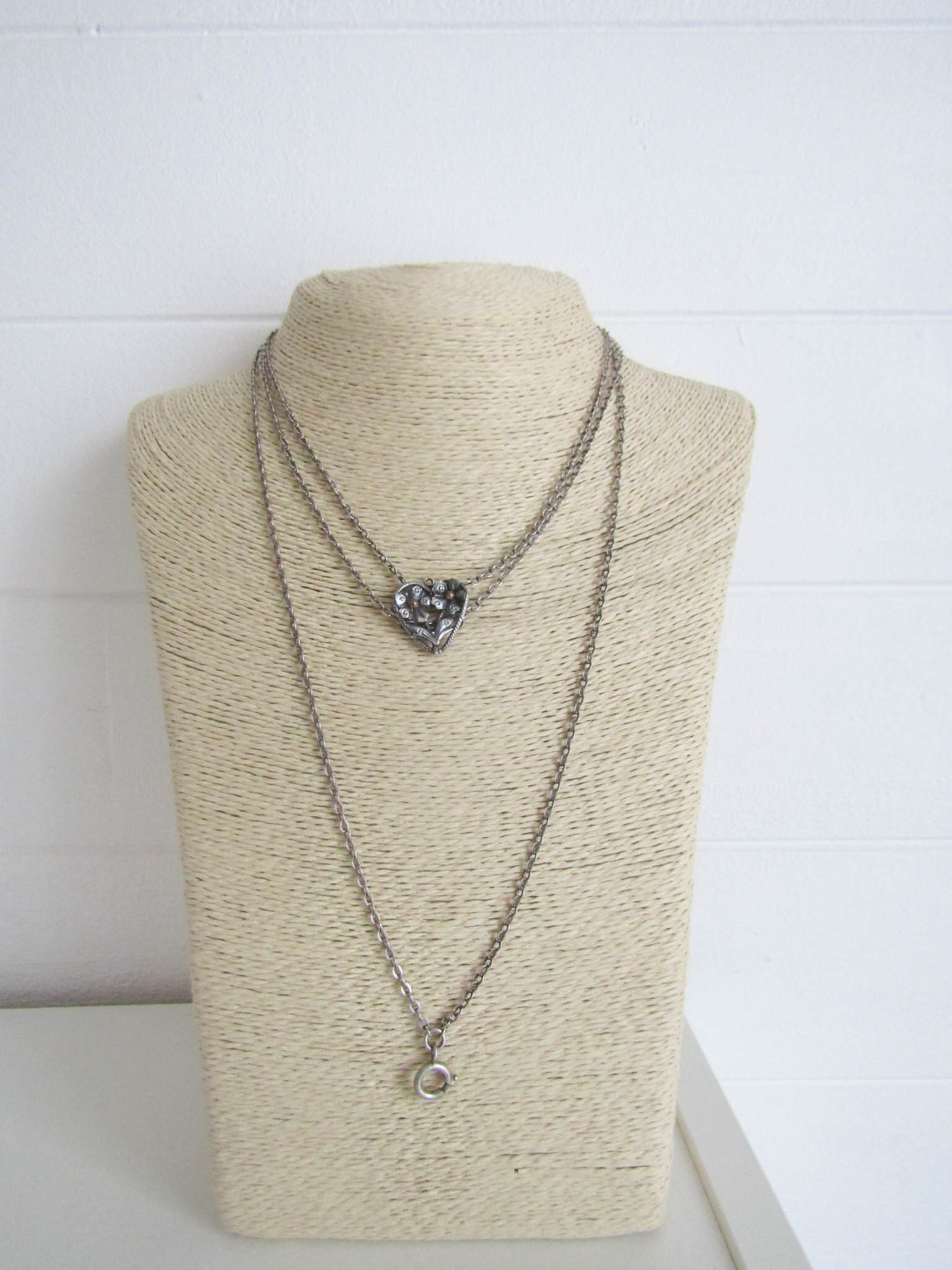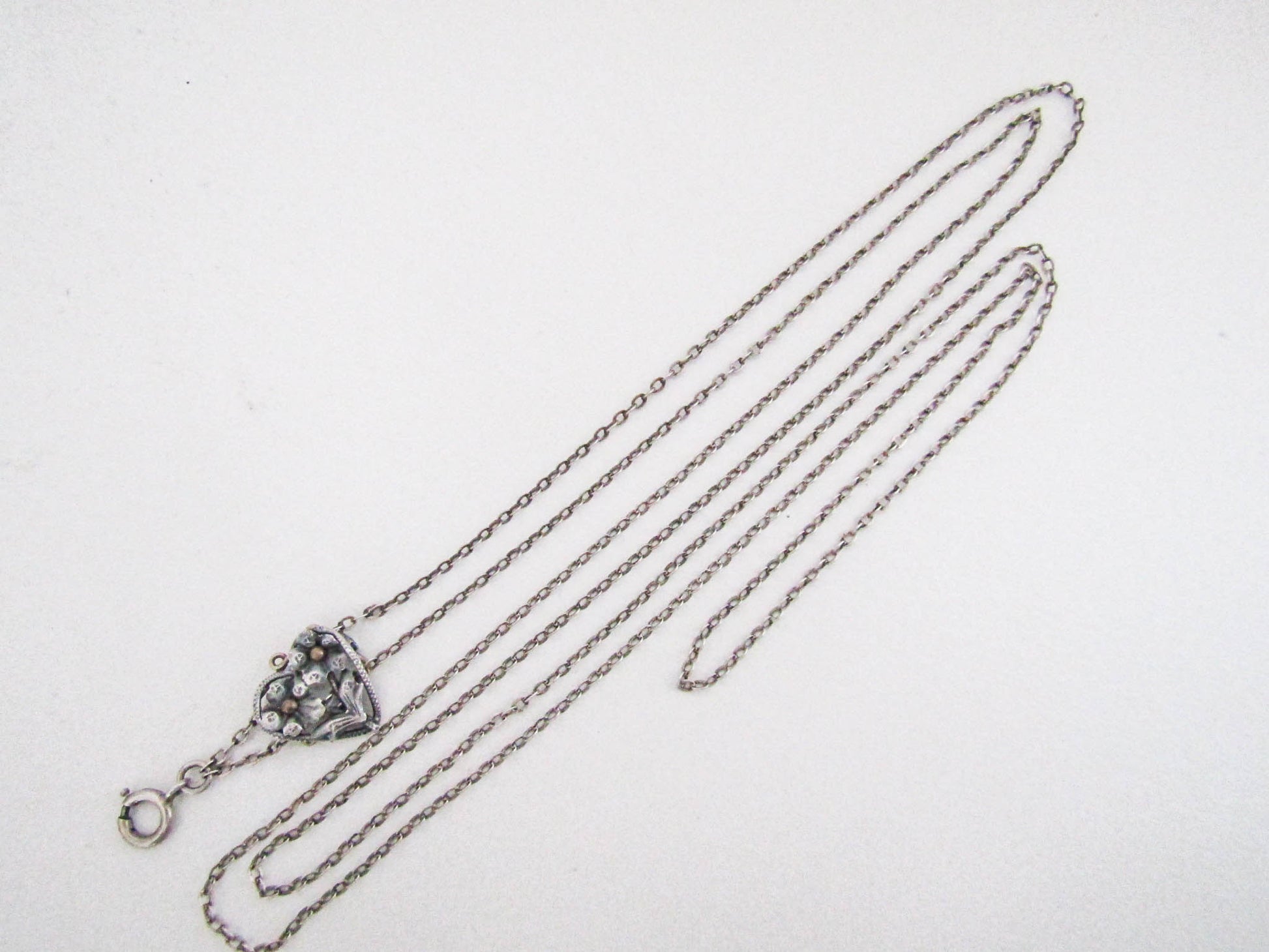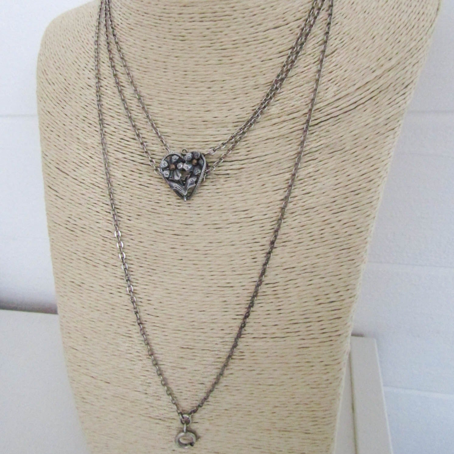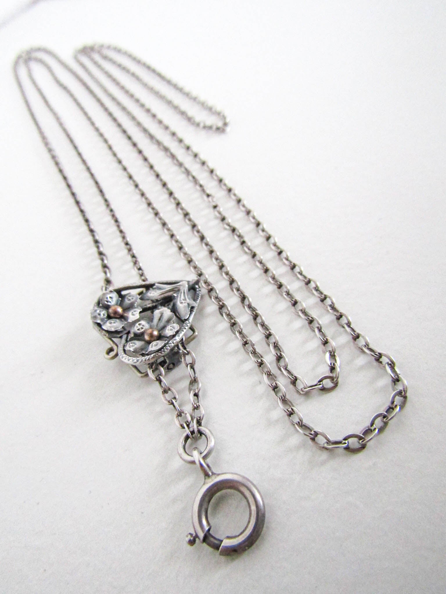 Simple and timeless, this rolo chain long guard has a full length which reaches over 55 inches. Although there is no closure, chains of this length can easily be wrapped two or three times overheard. They are excellent versatile chains as they can be mixed and matched with other chains or worn at different lengths for a different style every time. This long guard features the original slide, which consists of two forget me not flowers bending towards each other in the shape of a heart. The center of the flowers is decorated with rose gold fill, which contrasts nicely with the aged silver. The long guard has been left with some tarnish to make the features pop. The hanging bolt ring is strong with good tension and alignment. It is a whimsical and romantic chain which would make a lovely gift for the antique lover in your life, or yourself.