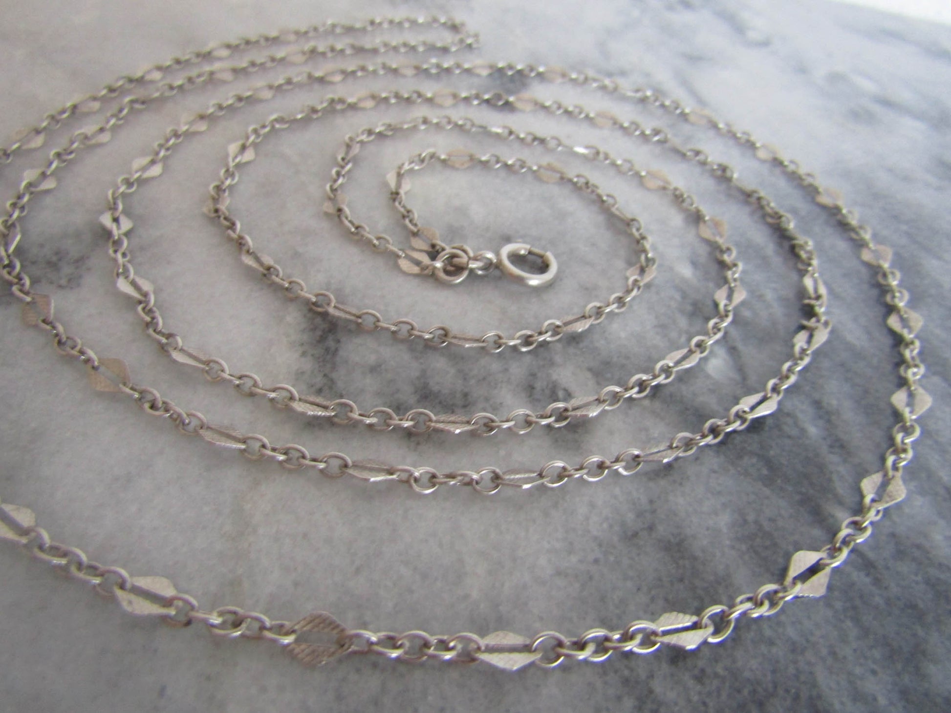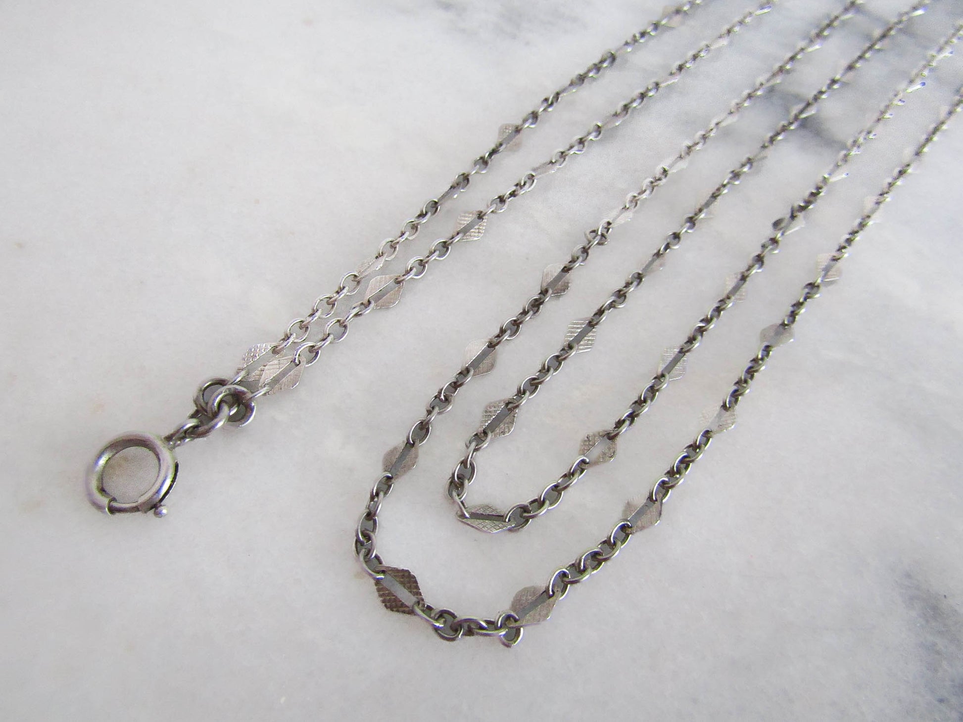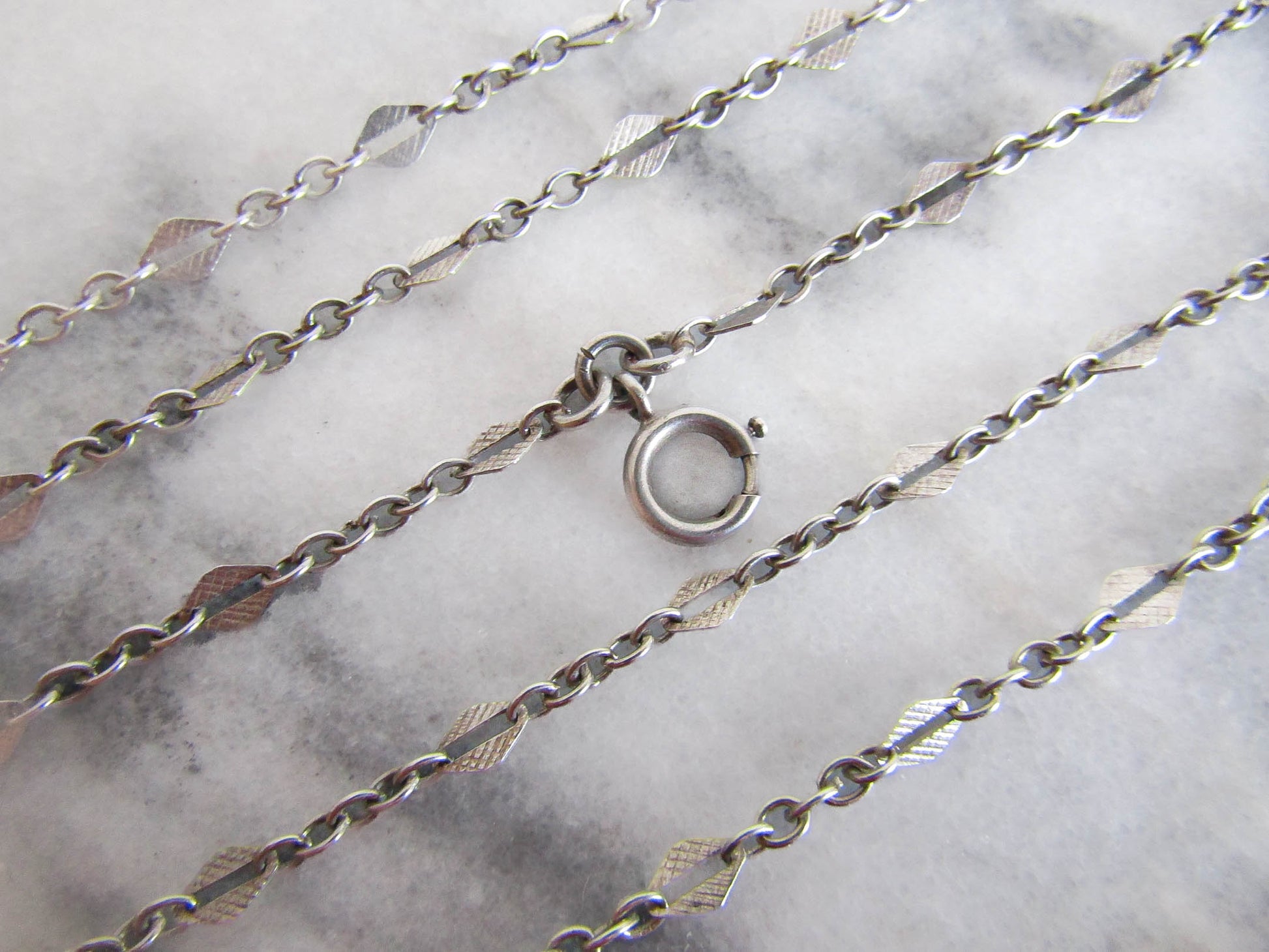 56" French Silver Art Deco Long Guard Chain with Lozenge Links and Hanging Bolt Ring