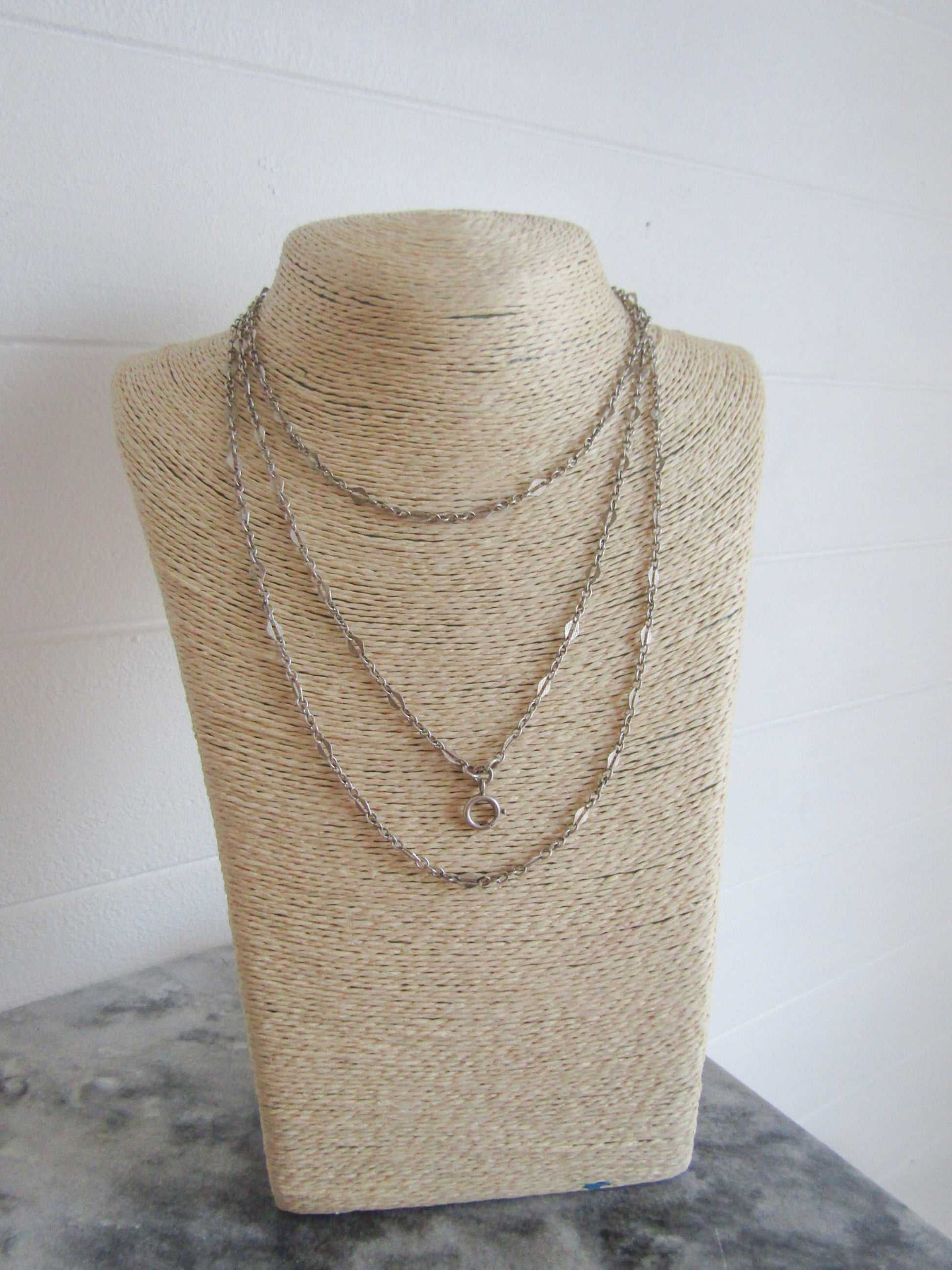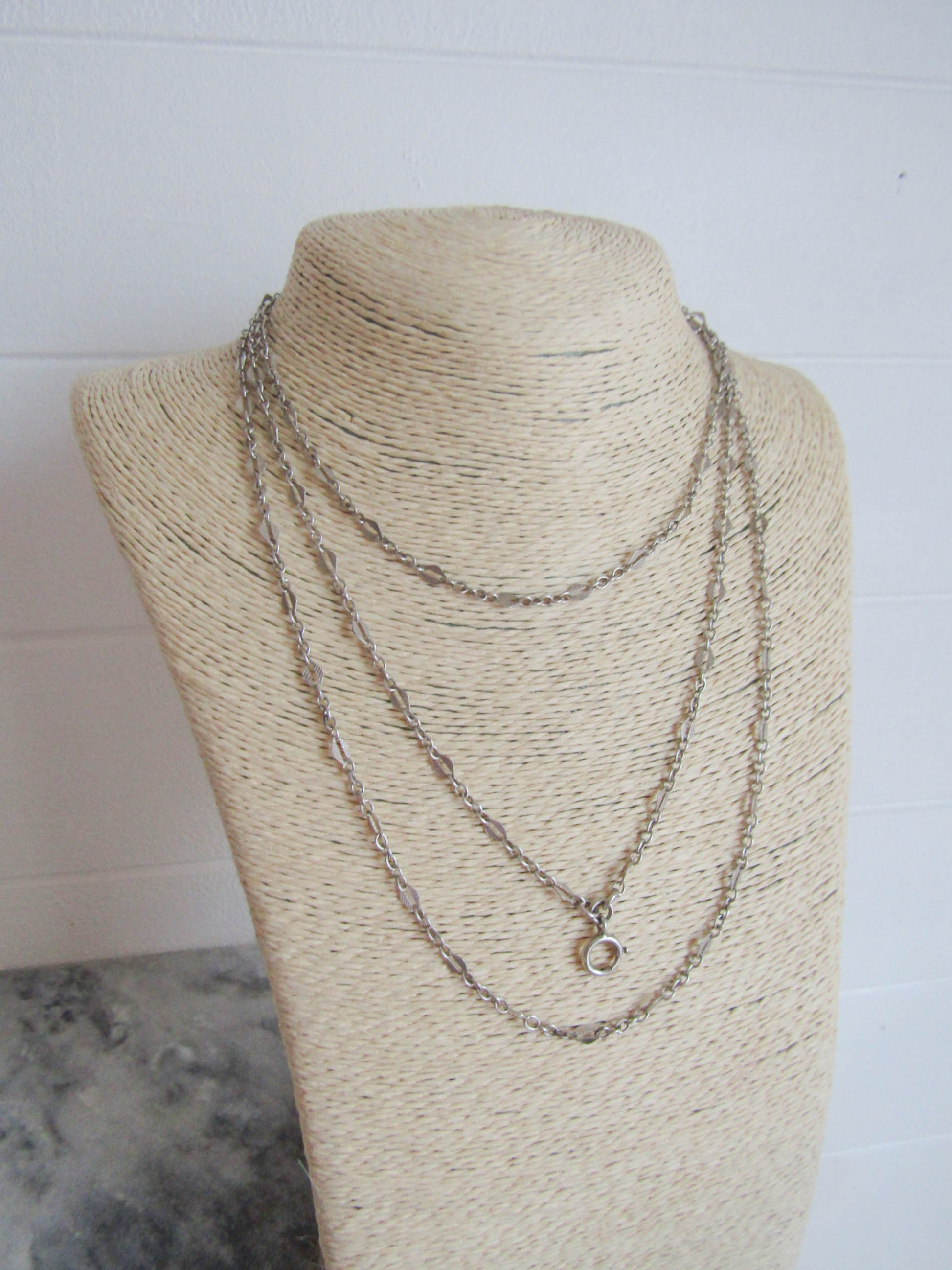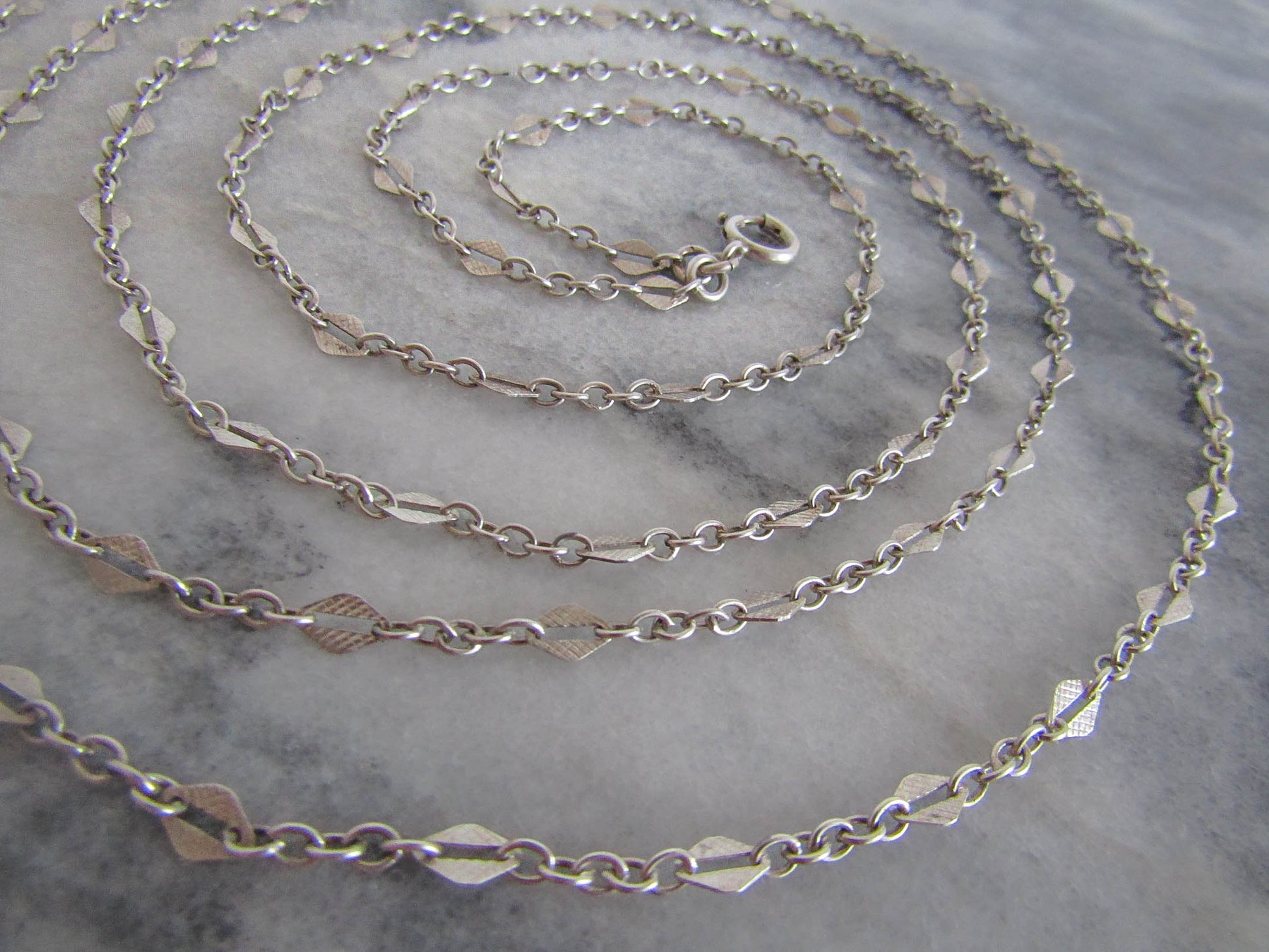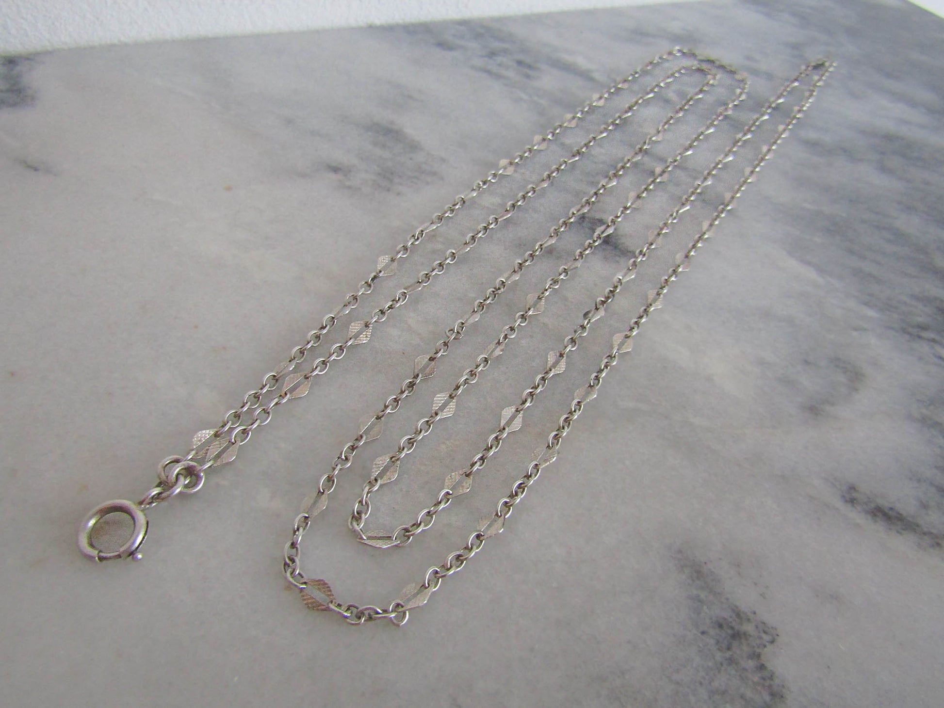 56" French Silver Art Deco Long Guard Chain with Lozenge Links and Hanging Bolt Ring