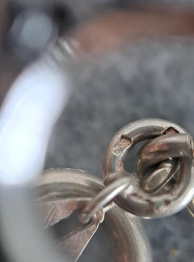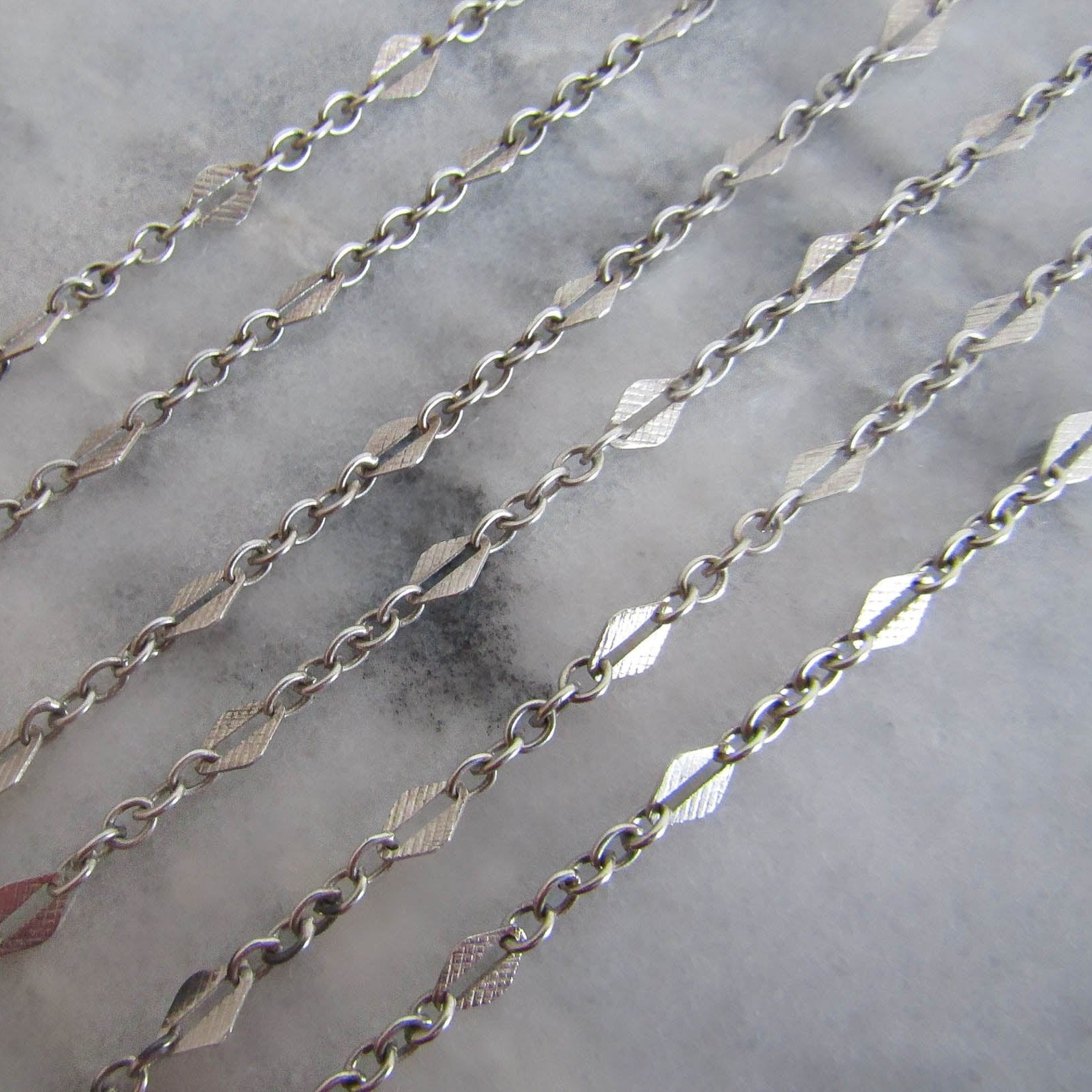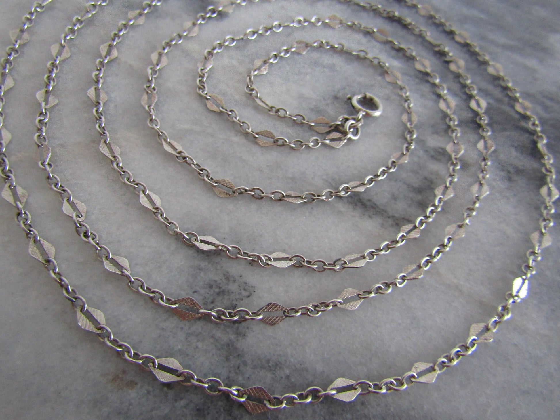 Impressive in its simplicity, this fancy link long guard chain has been beautifully crafted from 800. The chain is interspersed with split, textured lozenge links. The long guard features a hanging bolt ring which can be used to attach a pendant or locket. A versatile length, this chain can be wrapped two (or even three) times around the neck. It is a lovely example of vintage silver work that is in very good condition with strong links and a functional bolt ring. The links are thin and as such lighter than the average long guard chain, making it very wearable and comfortable.