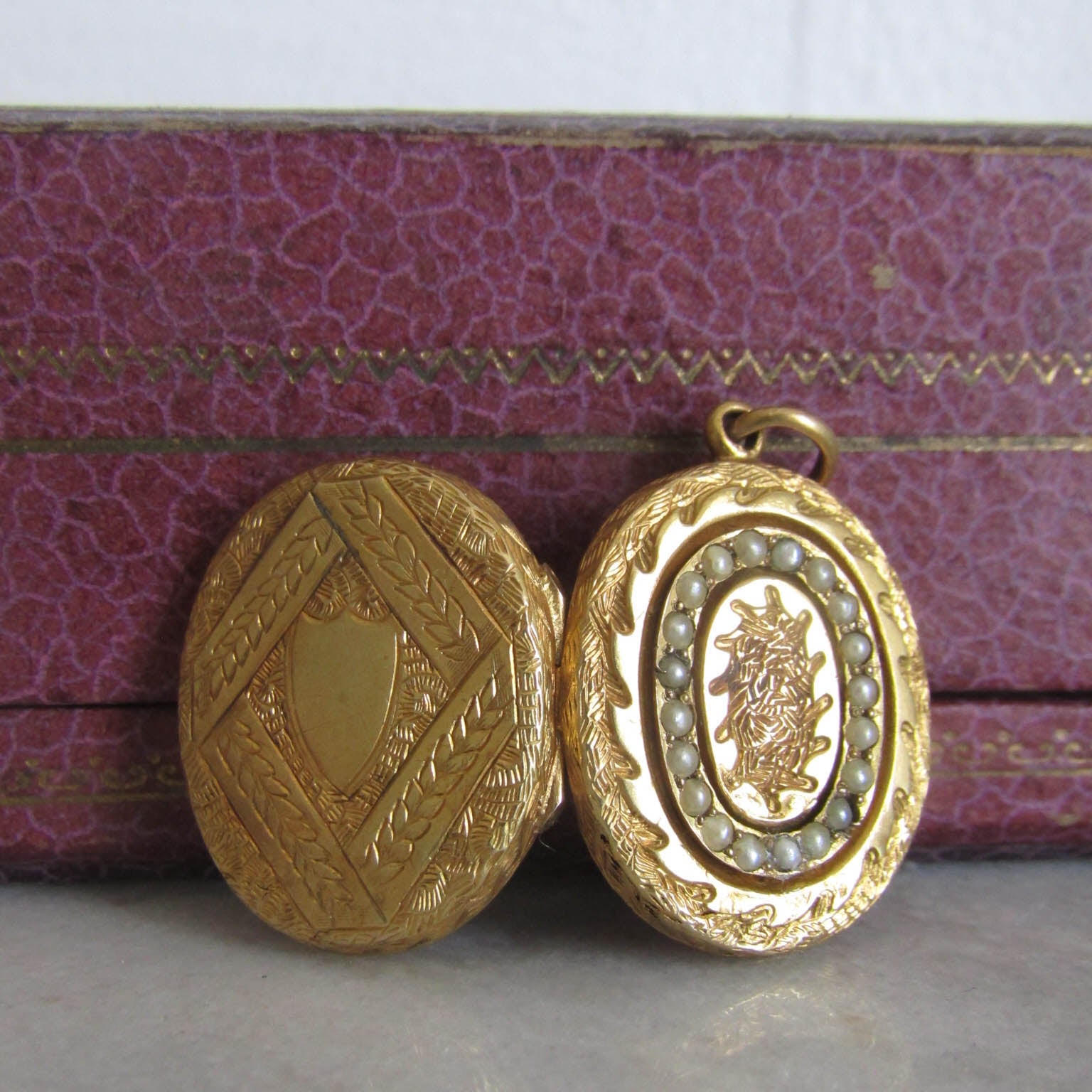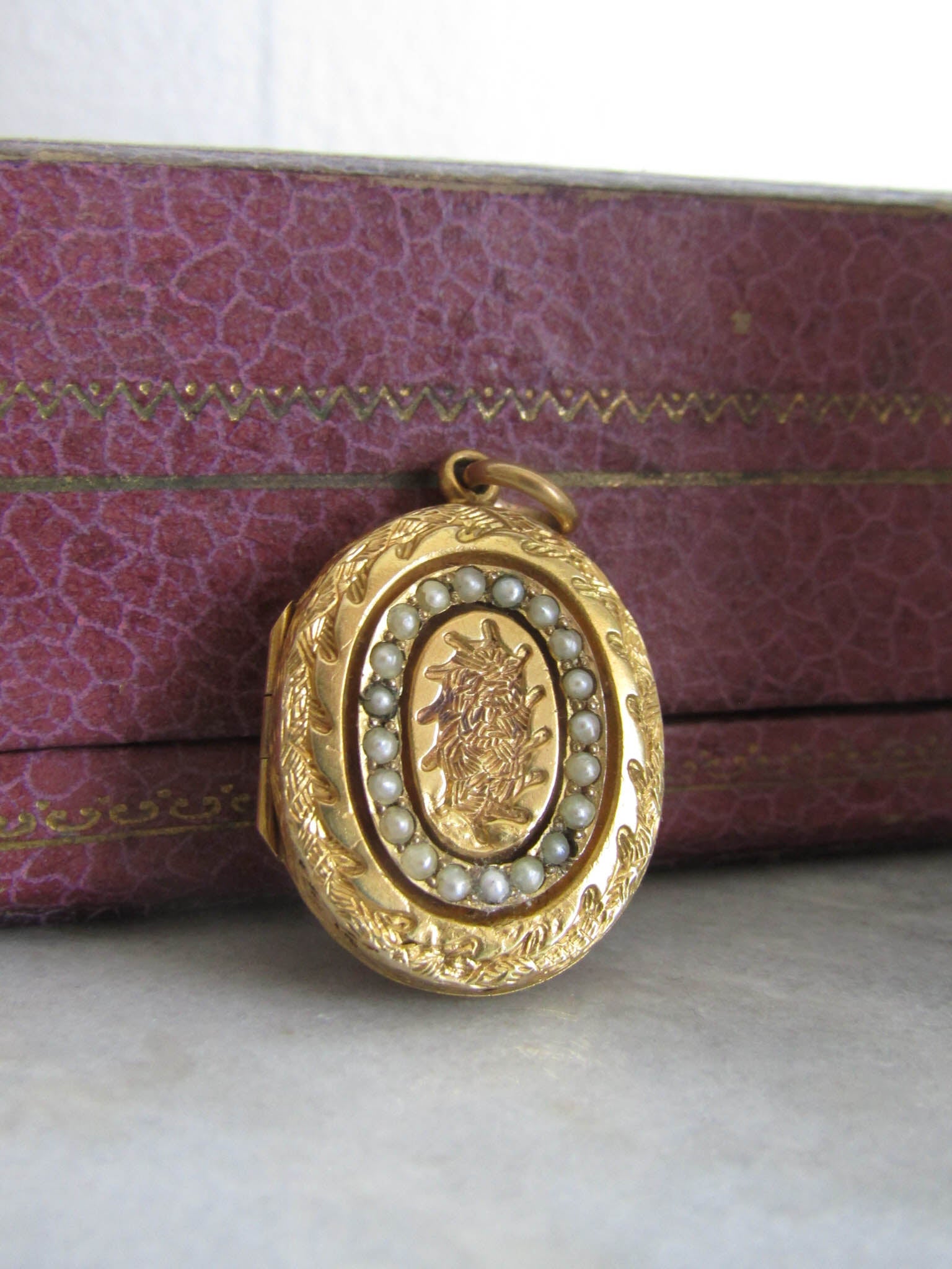 The locket closes well and the interior glass is in good condition. There are some areas where the engraving has worn and there are small holes in the gold, but this is not visible unless looking closely and does not affect the stability of the piece. Some pearls have been discolored from age and time.