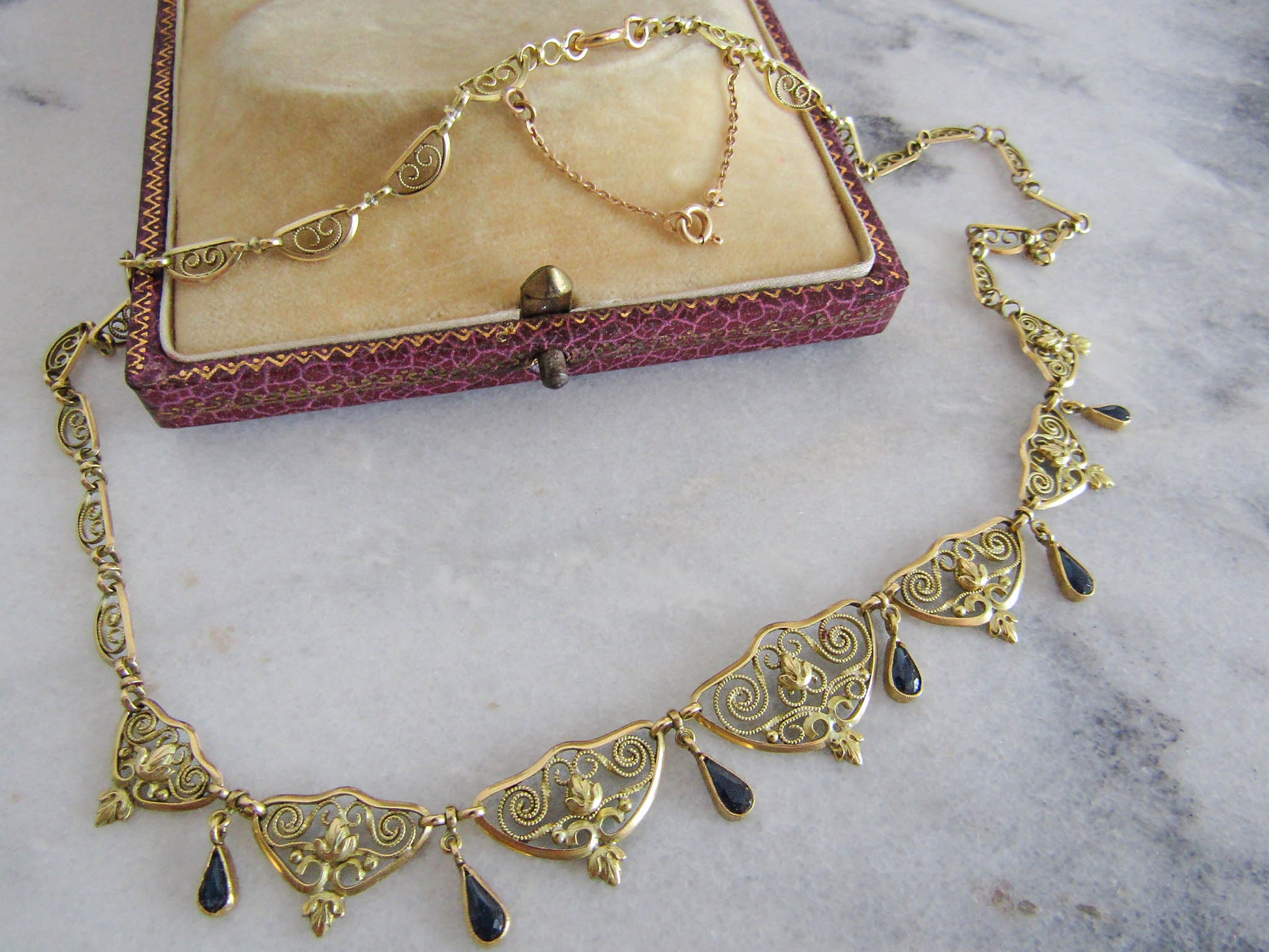 Antique 18K Gold and Sapphire Paste Filigree Drapery Necklace, Art Nouveau French Filigree Chain Necklace