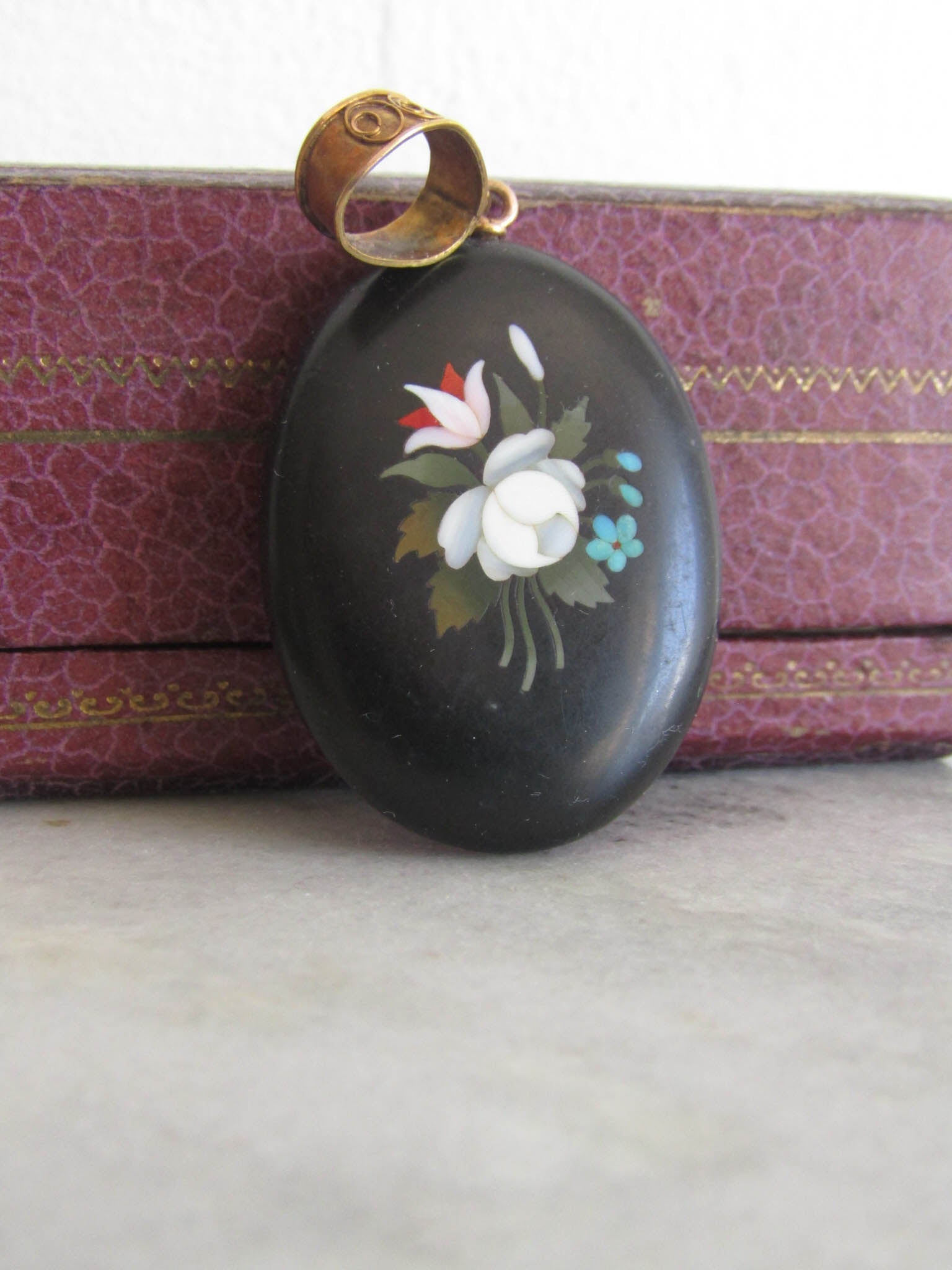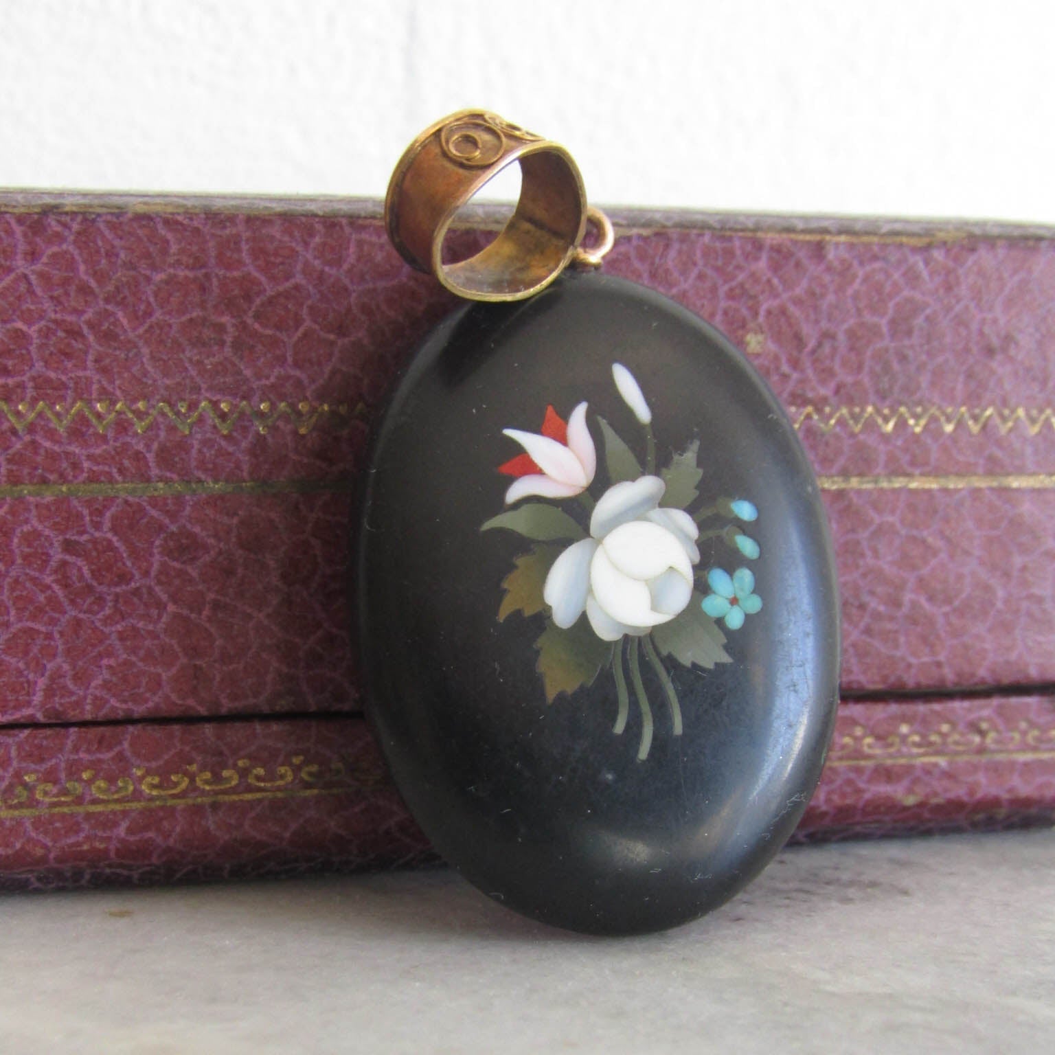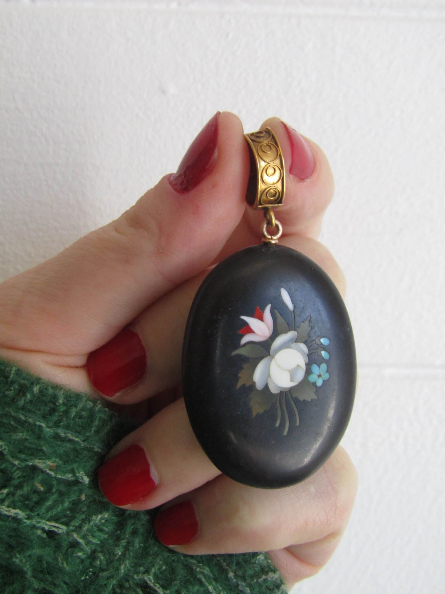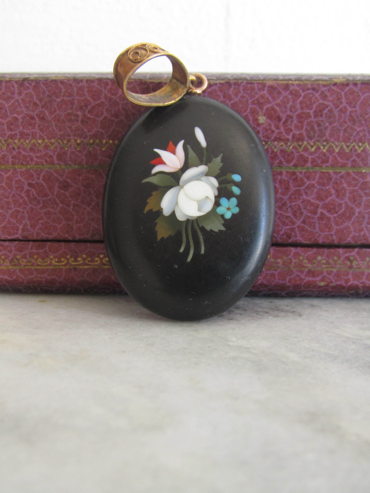 This pretty and unique pietra dura locket features an intricate stone mosaic, popular in Victorian jewelry, particularly during the mid to late 19th century. It originated in Italy and was often used for as a souvenir for wealthy English taking their "Grand Tour" around the continent. Featuring a bouquet of flowers including forget-me-nots and peonies, the locket is large enough to make an impression but flat enough to wear comfortably. The back contains an 800 silver frame which can be opened to store a photo or precious memory while the bail is hallmarked with an owl for 18k solid gold. Today, Victorian pietra dura jewelry is a prized collector's item, admired for its craftsmanship and historical significance.
