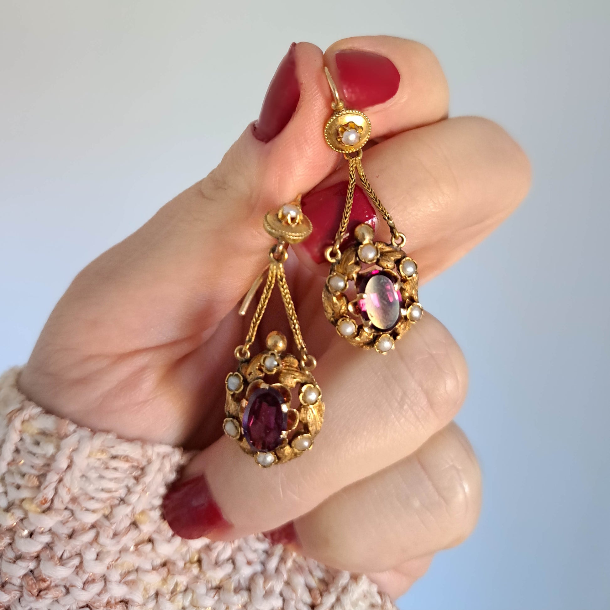 Antique 18K Gold Garnet Drop Earrings, Belle Epoque Foxtail Design