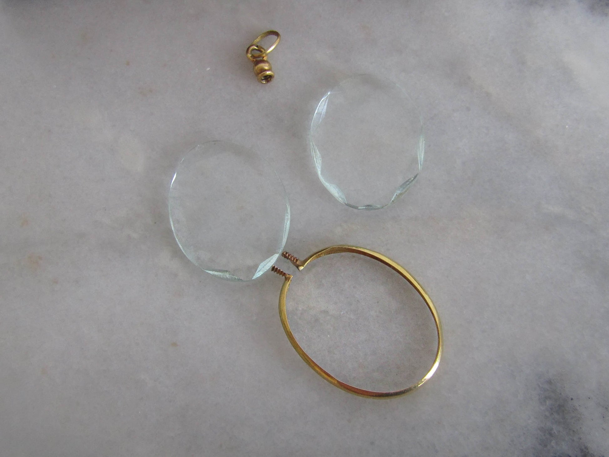 This lovely Edwardian locket has been crafted from high quality 18k gold and beautifully cut beveled glass. It features an oval shape and has been preciously kept as it remains in excellent condition with only light chips to the glass frame, visible in photos and not visible when worn. The top screws on to hold the contents of the locket securely in place. You can be creative about what you would like to store. A dried flower from your wedding bouquet? A piece of lace from a baptism? A lock of hair from a child's first haircut? Numerous possibilities await you with this sentimental gem. A unique piece of history that has been carried through time into your hands.