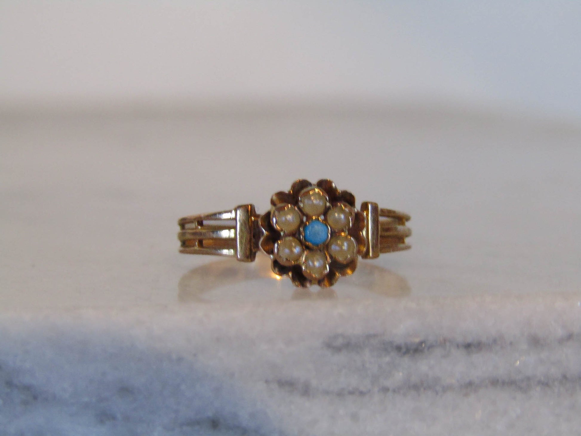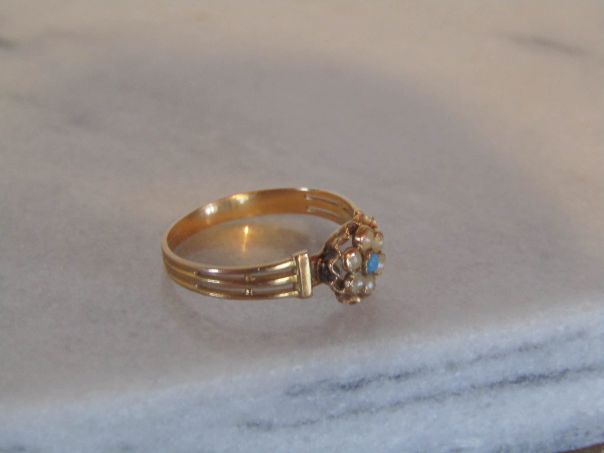Antique 18K Solid Gold Pearl and Turquoise Victorian Belle Epoque Ring c. 1900