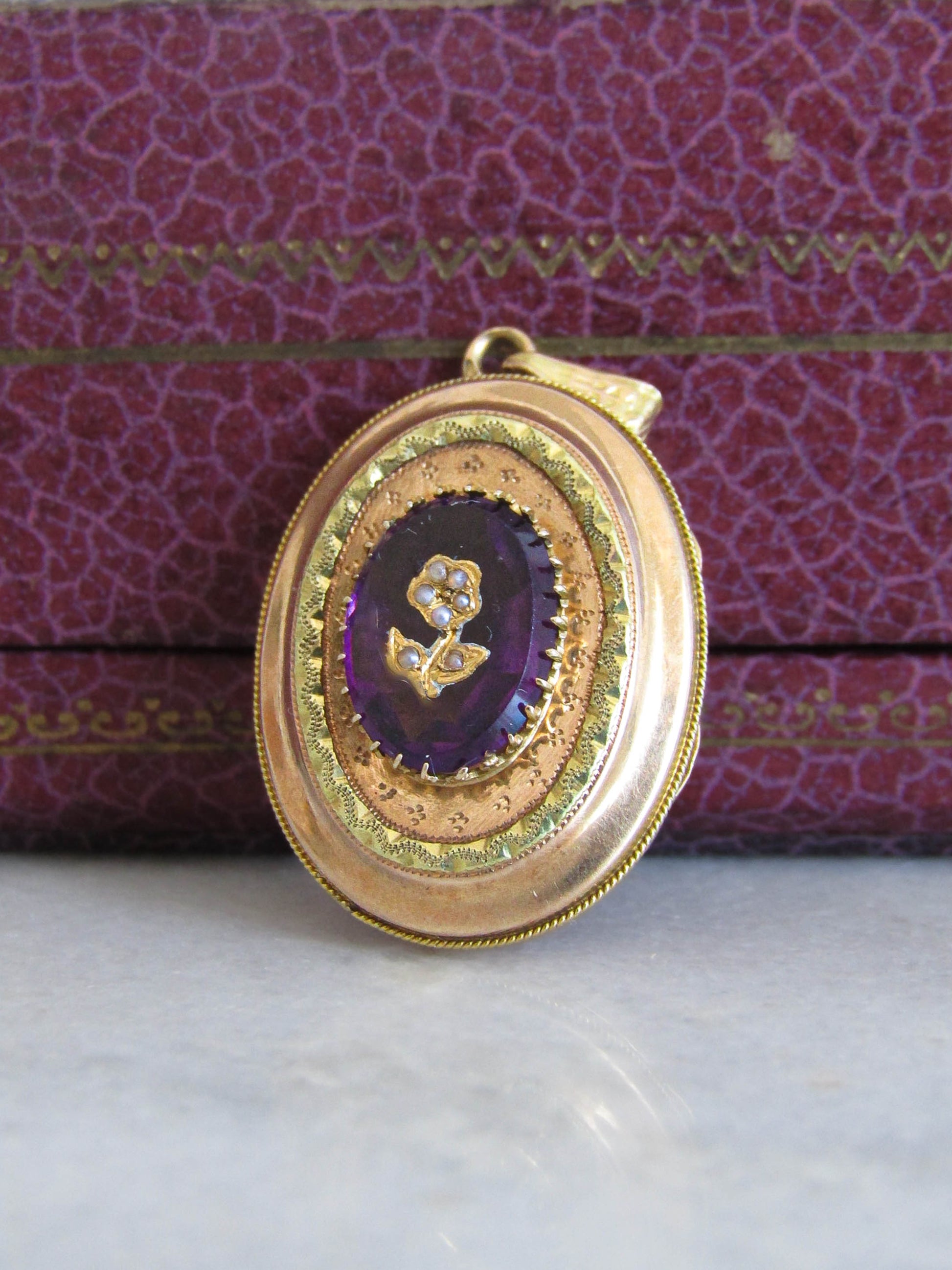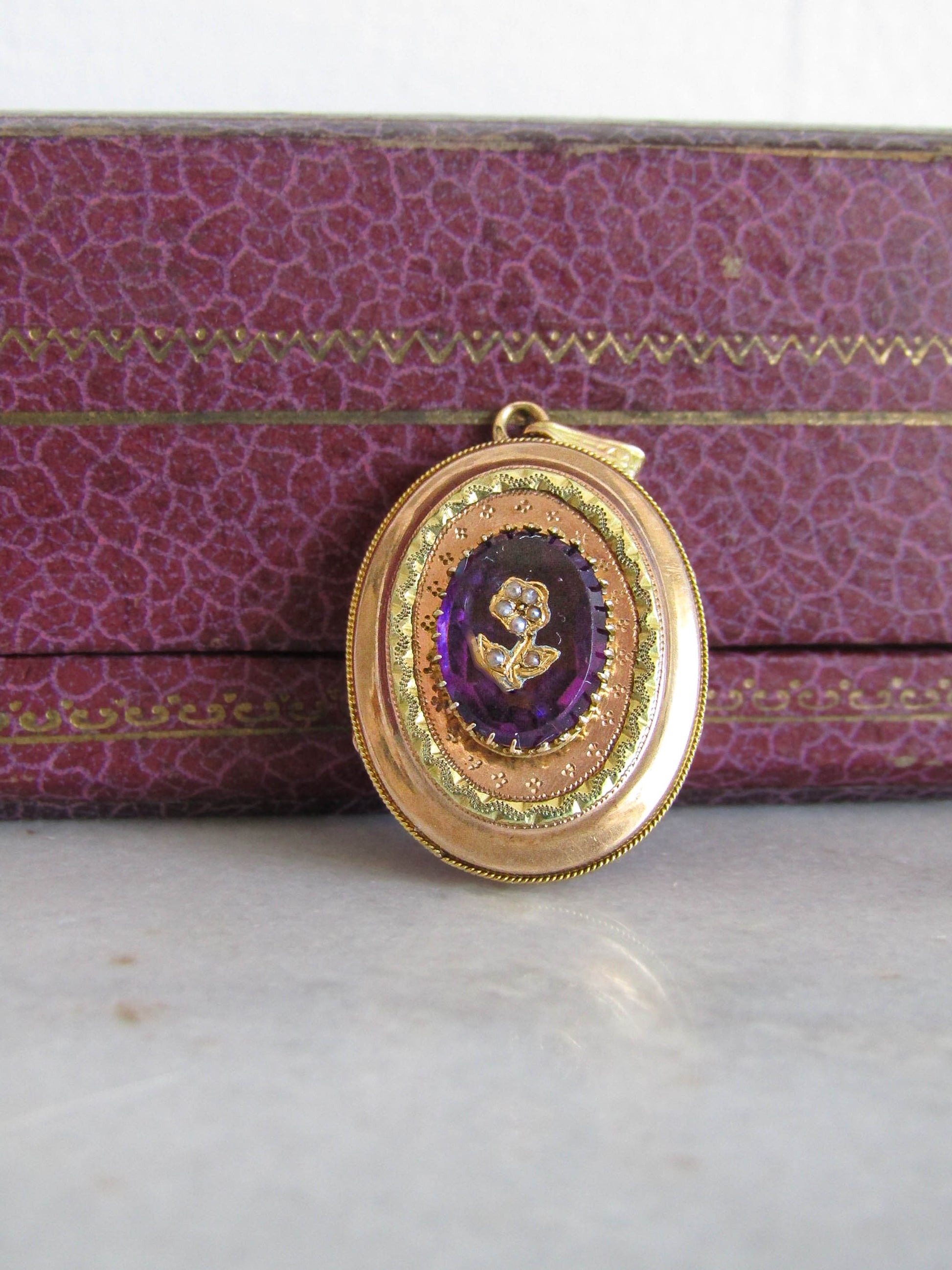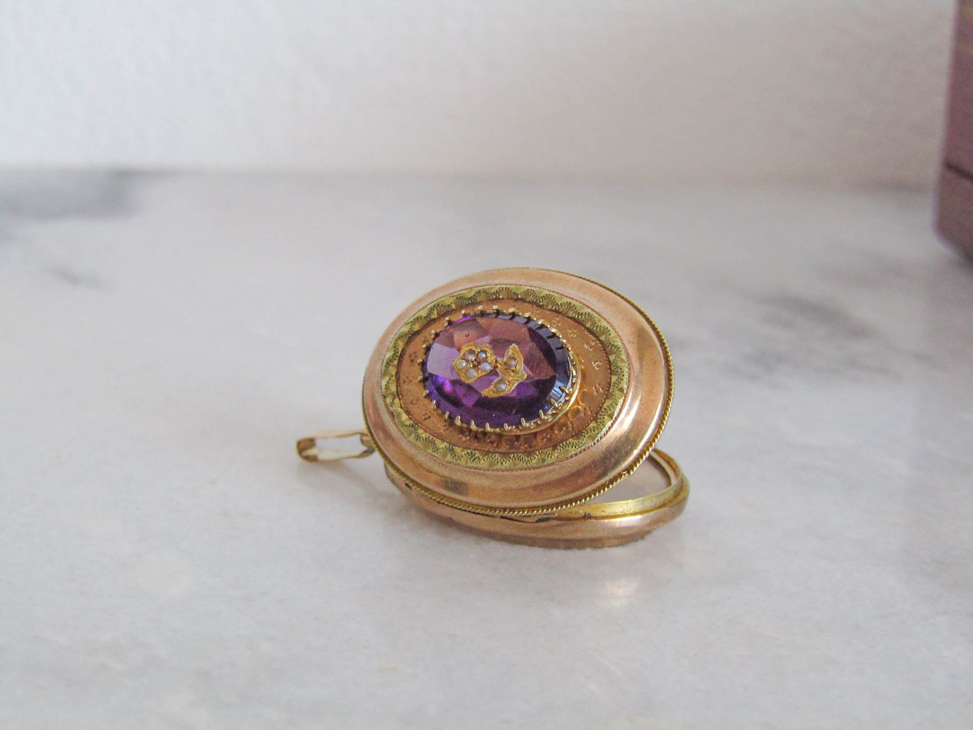 This stunning gold locket hails from the Grand Period (1861-1885) and features a beautiful amethyst paste (glass imitation) which is securely set with a halo of crown prongs and inlaid with a gold forget-me-not flower embedded with seed pearls. Pearls were often used for remembrance as part of mourning jewelry as they represented tears. The interior of the locket has a hinged glass partition which can be used to move the glass from one side to the other to protect a special photo or memory. The details on the locket are outstanding and the green gold frame around the central oval, the crown prongs, and way the light filters through the amethyst all make this a truly outstanding piece.