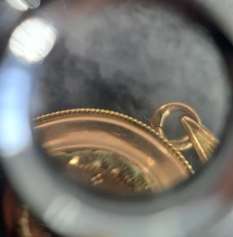 The locket is in excellent condition with light micro-scratches to the gold. The amethyst is in very good condition and the locket closes securely so that you don't lose any precious interior tokens. There is light denting to the back, visible in photos and the video.