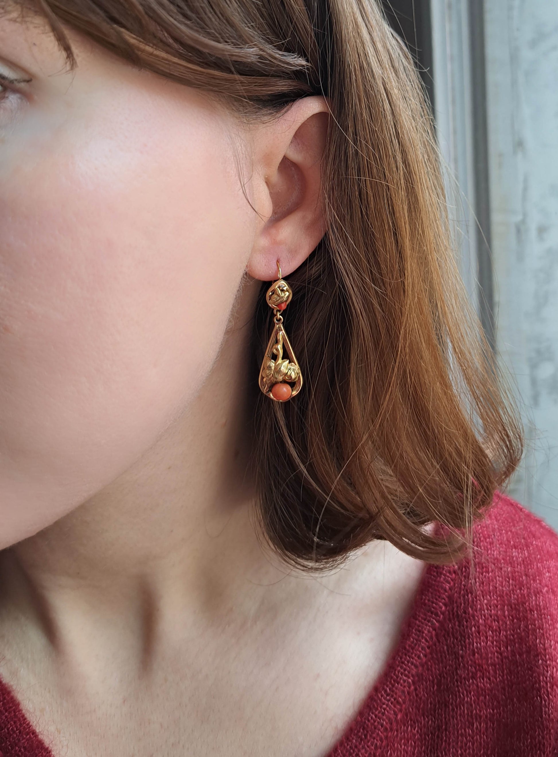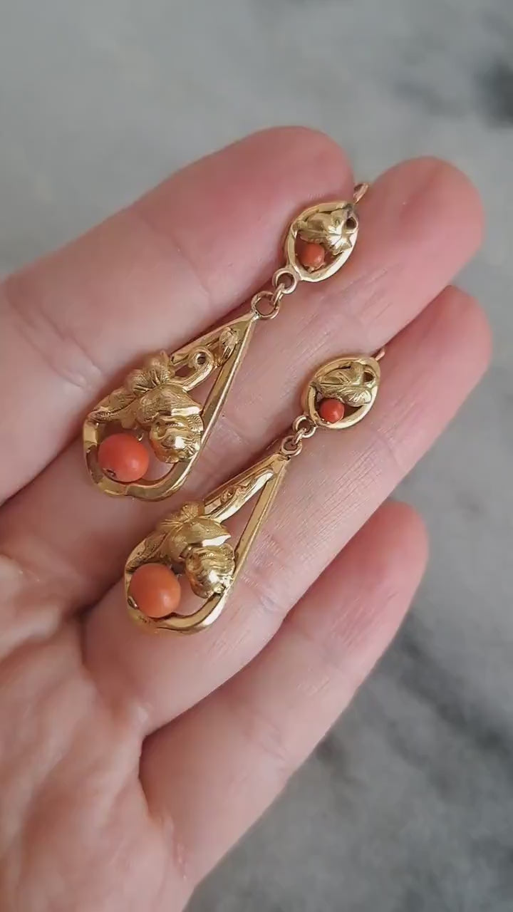 Crafted during the Victorian period, these lovely earrings feature a detailed design with coral accents. Hallmarked with a horse head, the earrings are crafted from high quality 18k gold which has a rich, buttery yellow color. The earrings feature a typical early lever back earring closure in which the top of the earring threads through the back of the ear and latches at the front. This can take some getting used to if it's the first time you've owned a pair or earrings in this style.