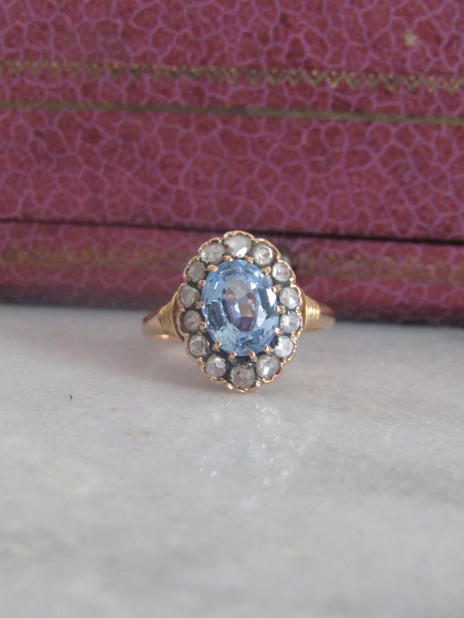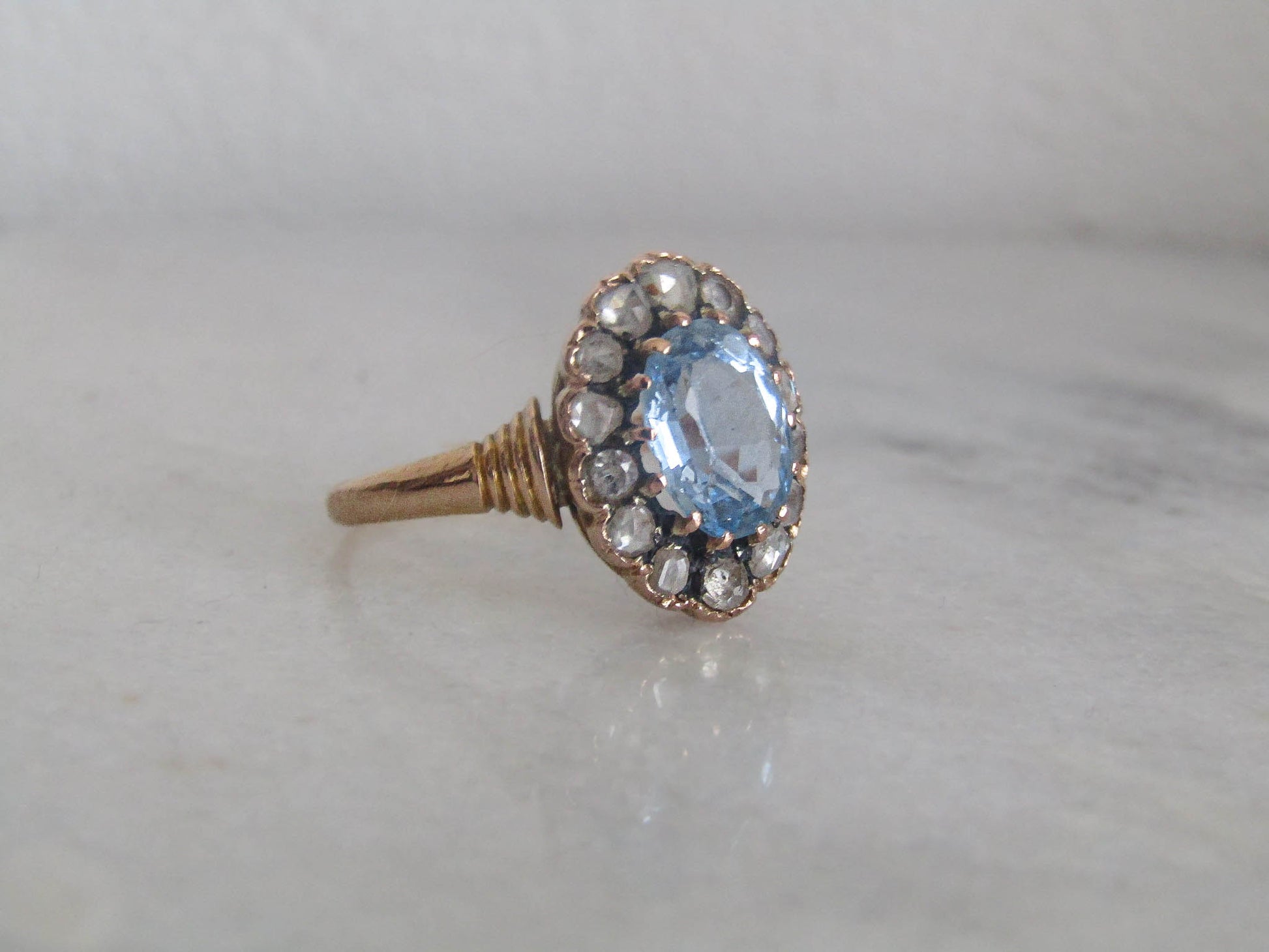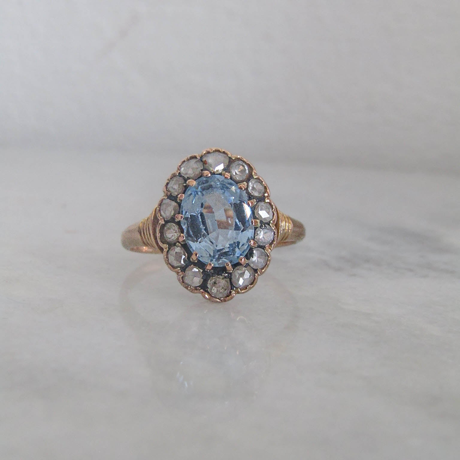 Antique Edwardian French 18k Solid Gold Synthetic Blue Spinel Halo Ring c. 1910