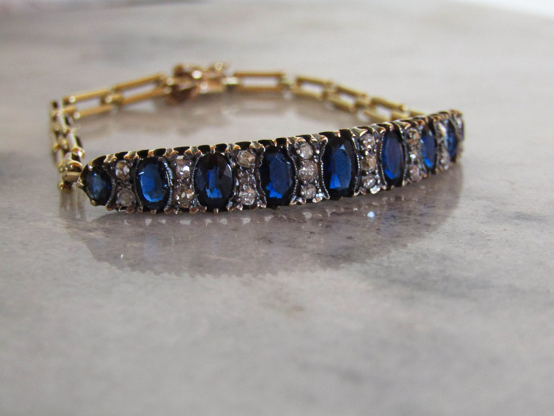 This gorgeous antique bracelet dates from the Late Victorian period, circa 1900. It features eight blue gemstones, seven of which are synthetic blue spinel, and one of which is a natural blue sapphire which measures 4 mm by 5 mm. Spinel is a hardwearing gemstone with an 8 on the Moh's scale and excellent toughness making them a strong choice for daily wear. The panel is accented by a pierced gallery and nineteen old mine cut diamond accent stones. Attached is a gold chain link which is closed with a box clasp and security bar.