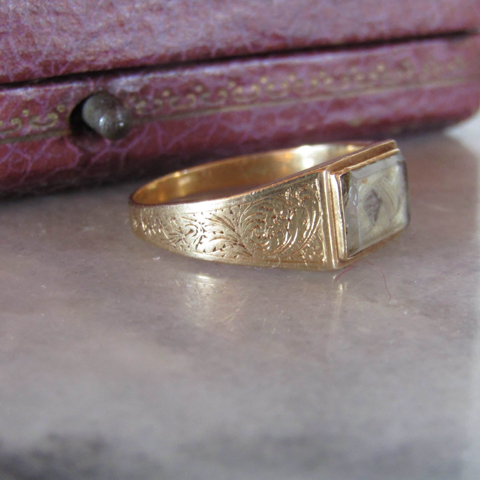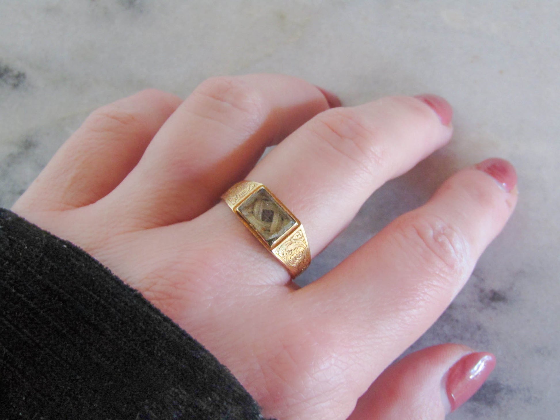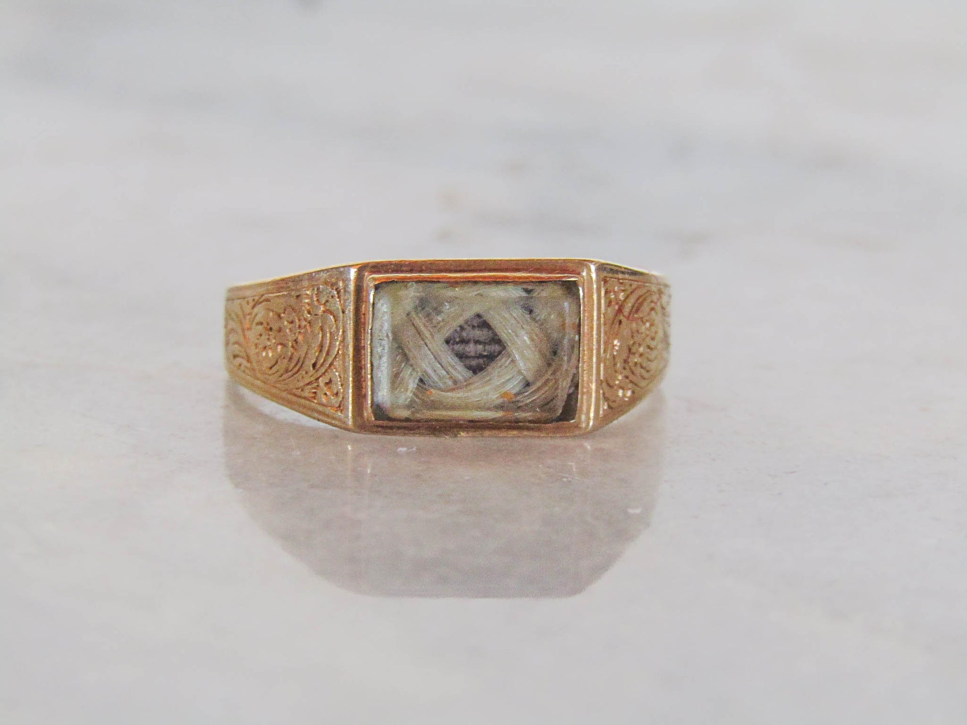This beautiful sentimental ring was crafted in the very early Victorian period and is engraved on the interior band with the date 15 Avril 1839. The ring contains a glass panel which guards a lock of braded hair. On the larger side, it likely belonged to a man, and considering the fine, blond locks, it could have been a mourning locket for a child gone before. Hair jewelry was a common form of mourning jewelry or sentimental jewelry used to honor a precious friendship or love. The ring has a tapered band which has been carefully engraved with delicate swirling leaves and is crafted from high quality 18k solid gold.