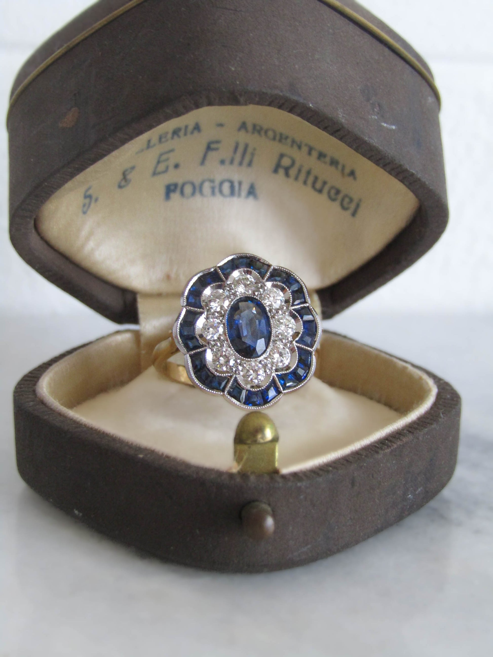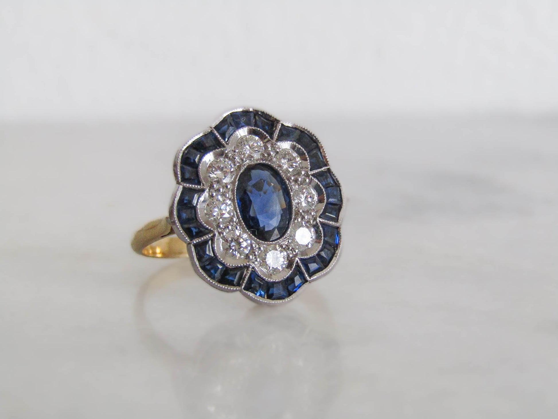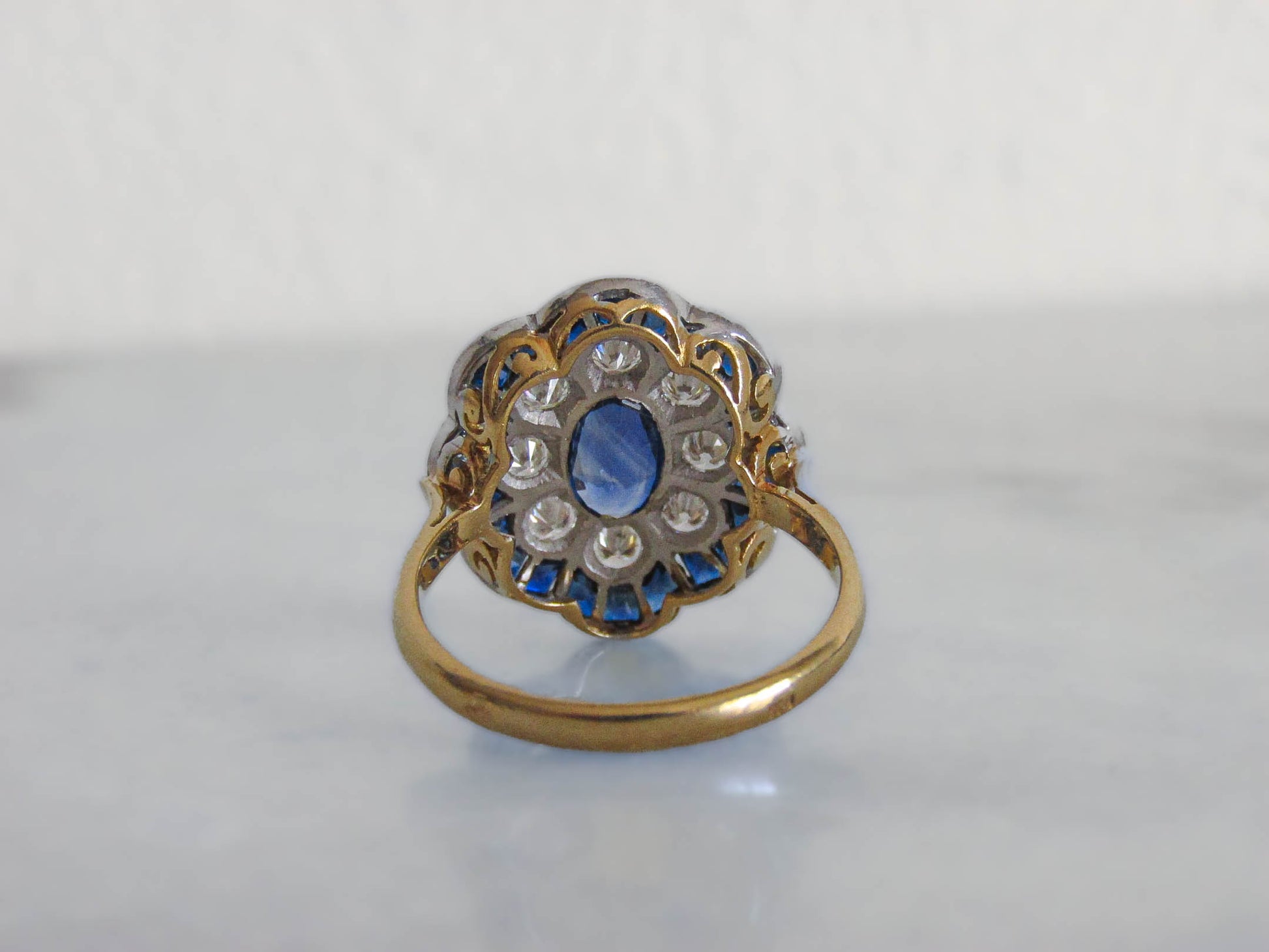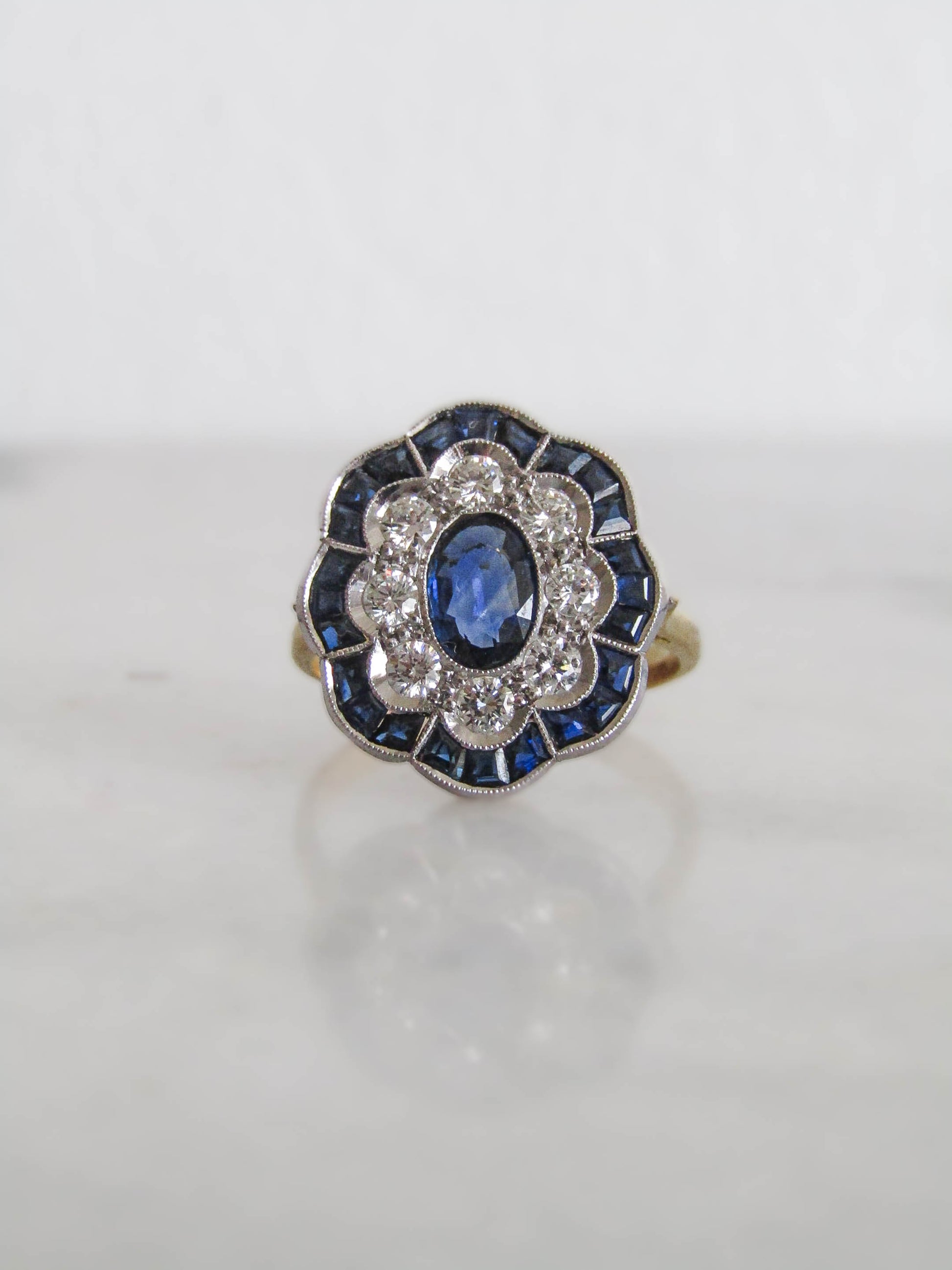 Antique French Daisy Flower Art Deco Ring with Calibrated Sapphires and Diamonds, 18K Yellow Gold Pompadour ring