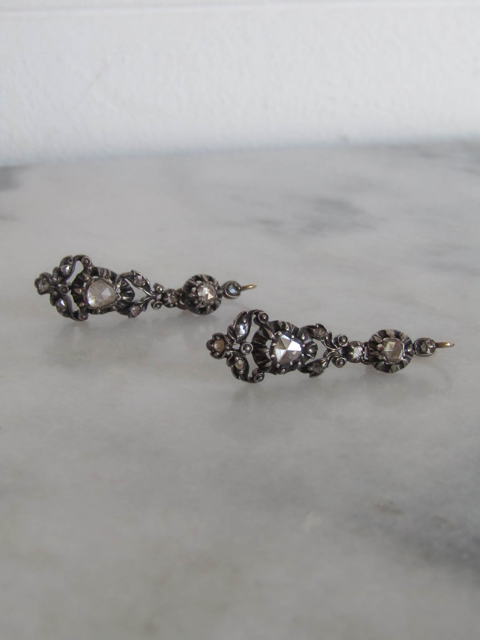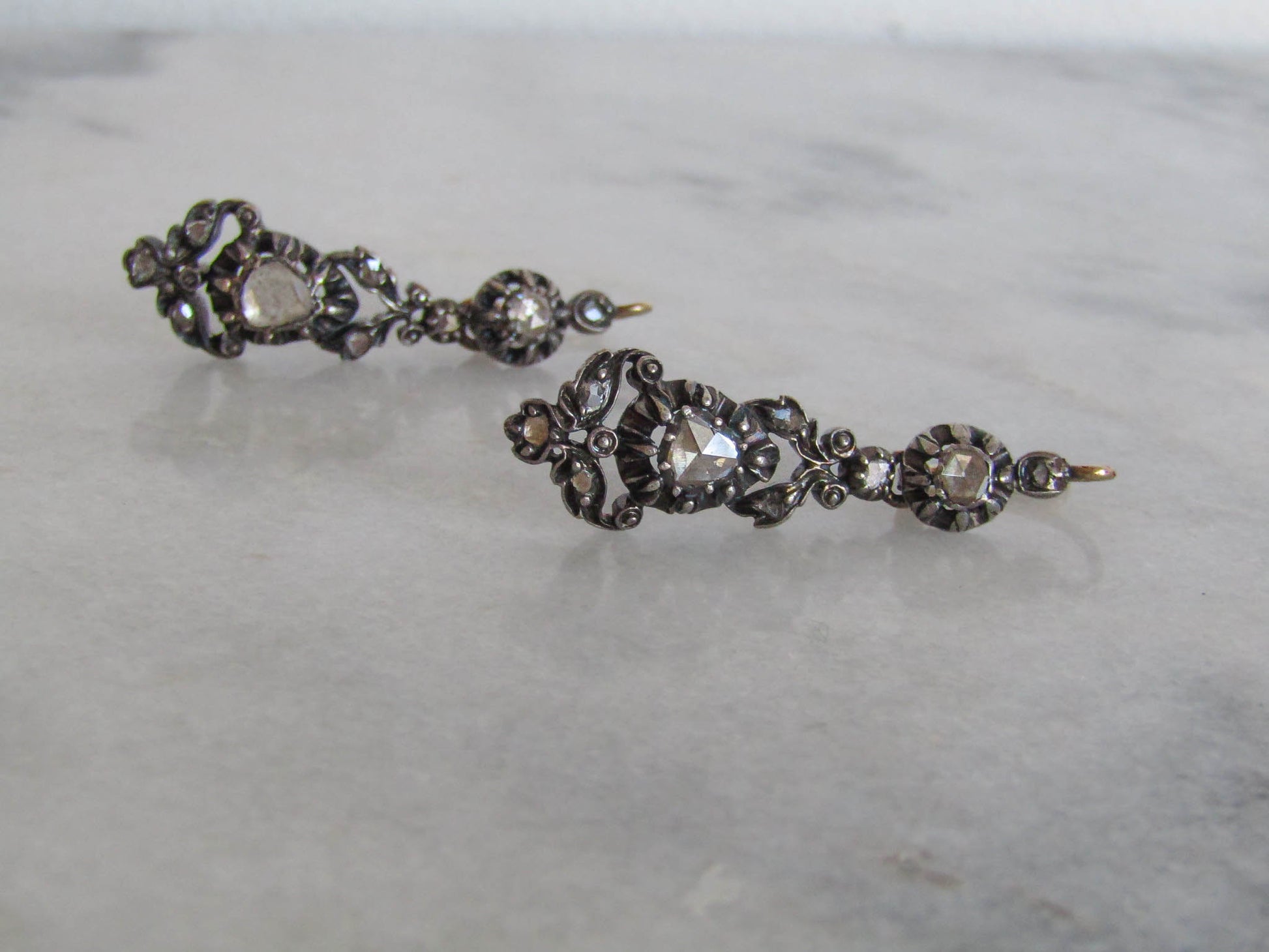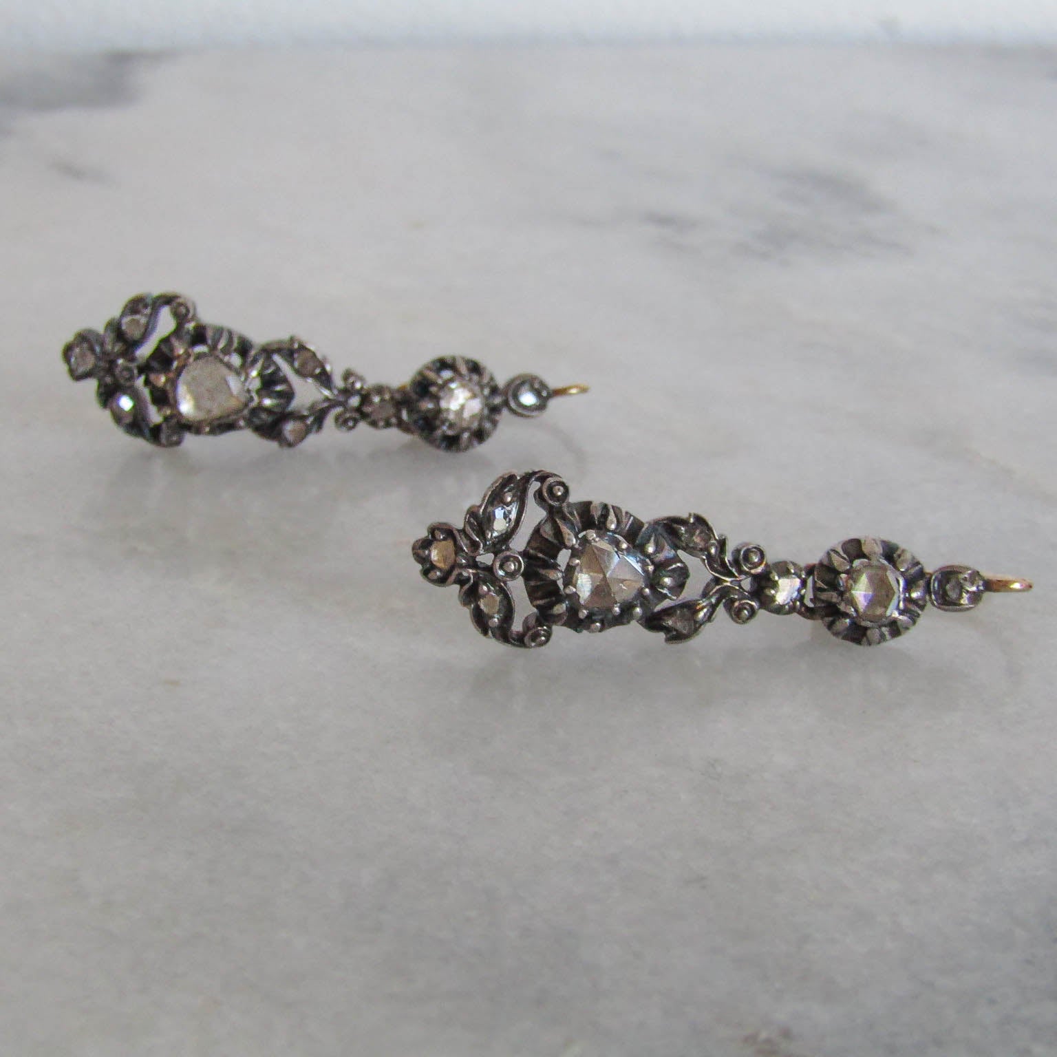 These lovely earrings are regional gems from the Arles region of France, crafted in the 19th century. Elegant and practical, they are made from high quality 800 silver with 18k gold hinges and bails. The earrings are encrusted with rose cut diamonds in a cut down collet setting. The sleeper has a practical lever back closure that is a little easier to navigate than some of the antique closures which thread through the back of the ear, but one of the drop portions can no longer slide over the hinge to be removed. Unique and eye catching, they make a great, versatile example of French regional craftsmanship.