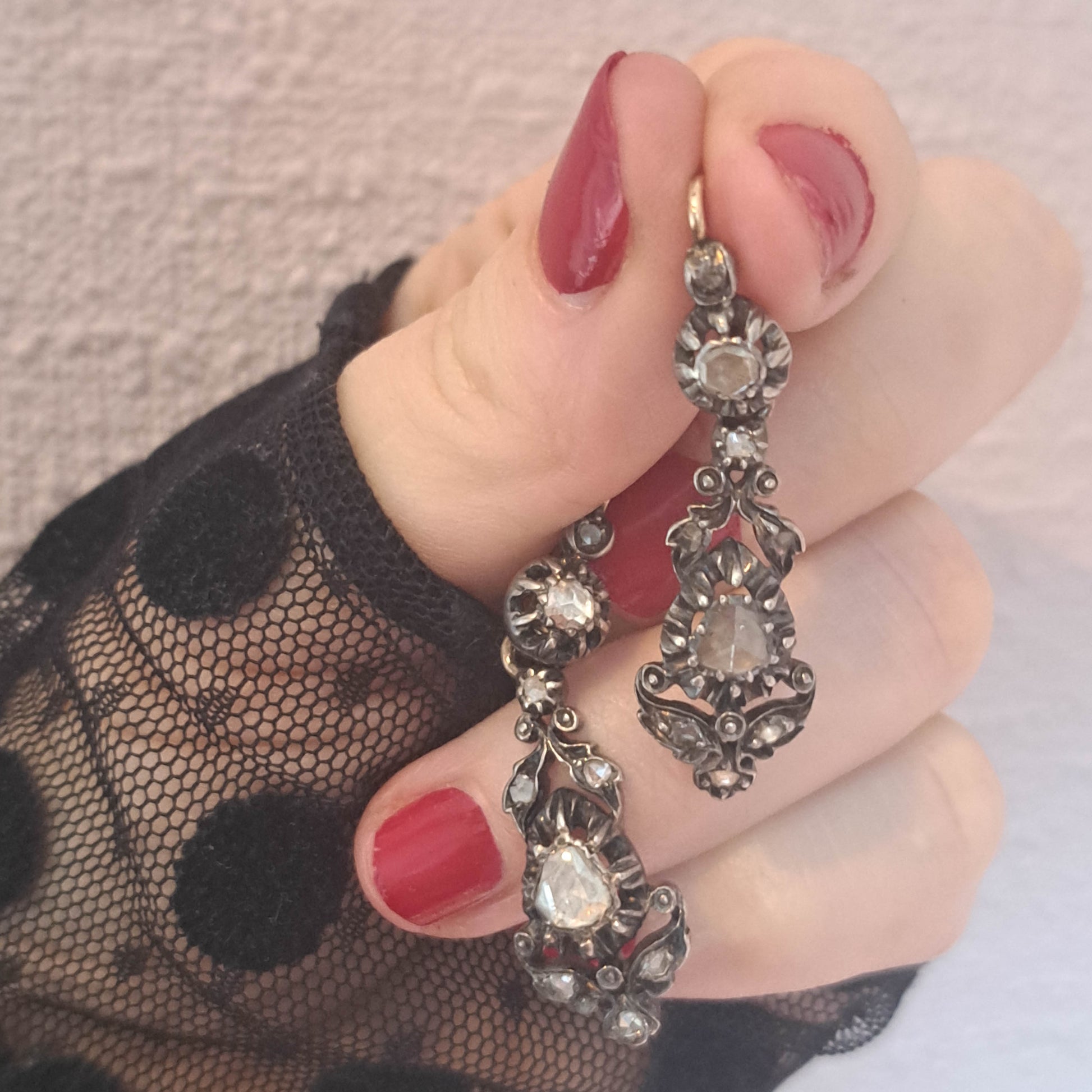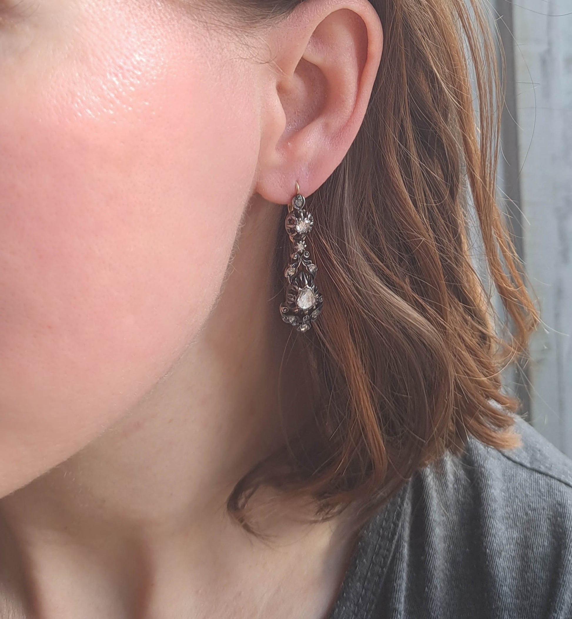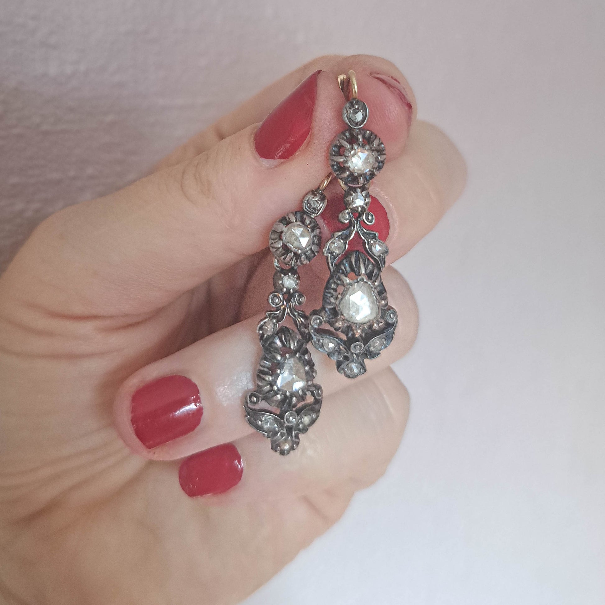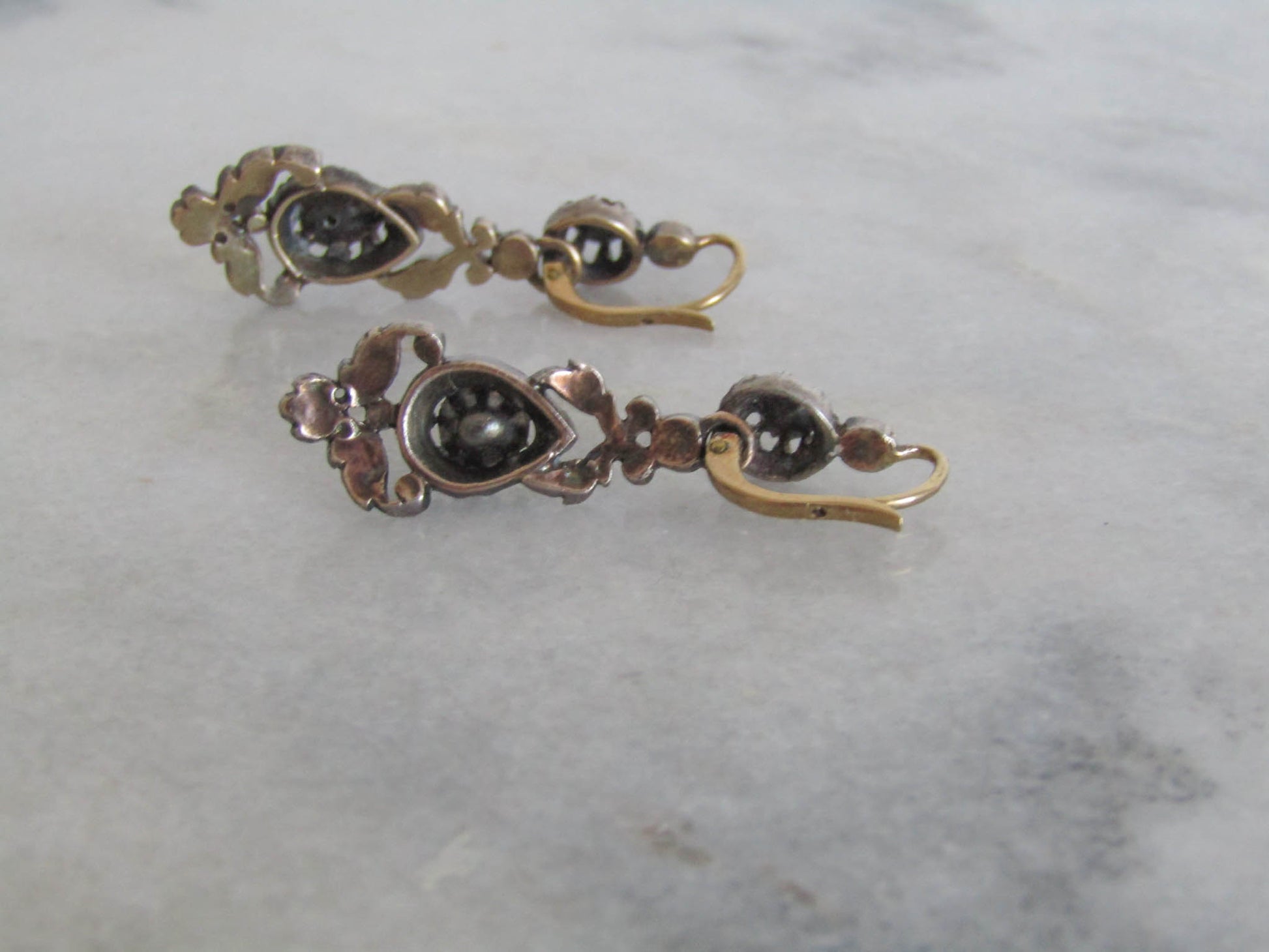 These lovely earrings are regional gems from the Arles region of France, crafted in the 19th century. Elegant and practical, they are made from high quality 800 silver with 18k gold hinges and bails. The earrings are encrusted with rose cut diamonds in a cut down collet setting. The sleeper has a practical lever back closure that is a little easier to navigate than some of the antique closures which thread through the back of the ear, but one of the drop portions can no longer slide over the hinge to be removed. Unique and eye catching, they make a great, versatile example of French regional craftsmanship.