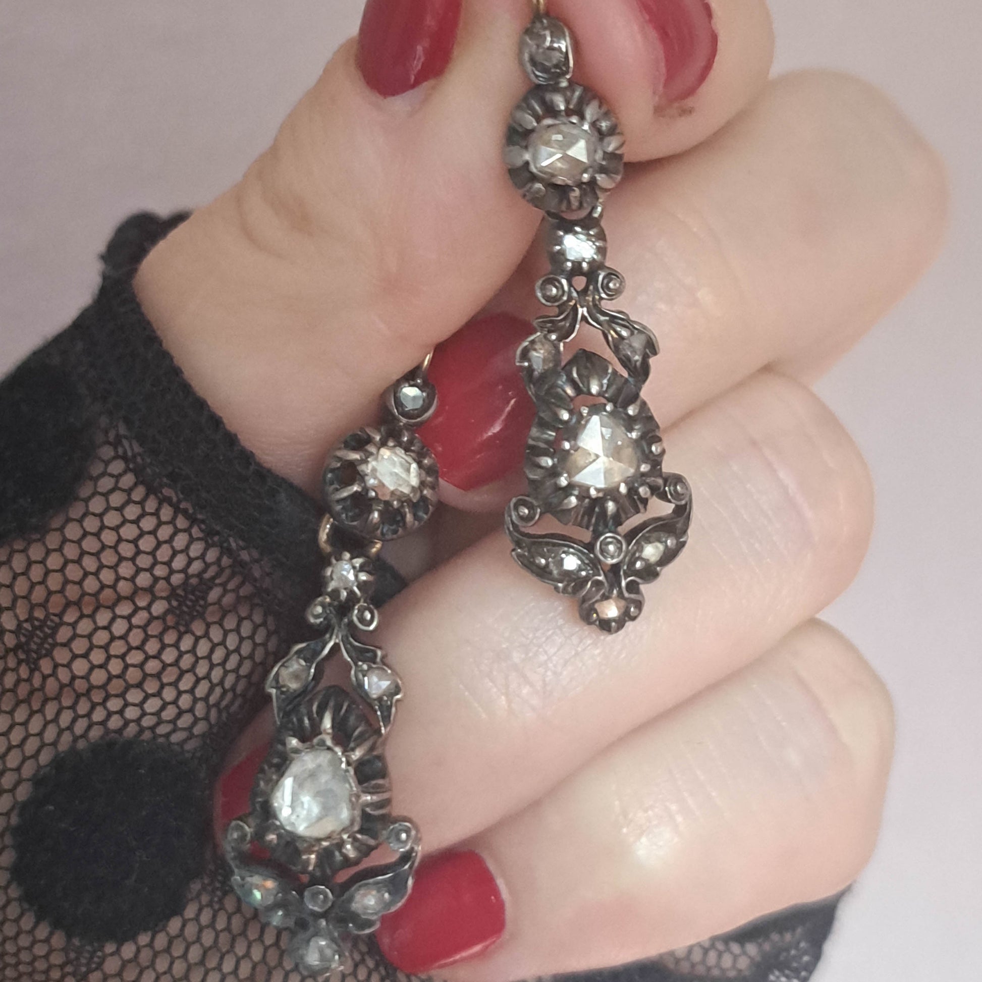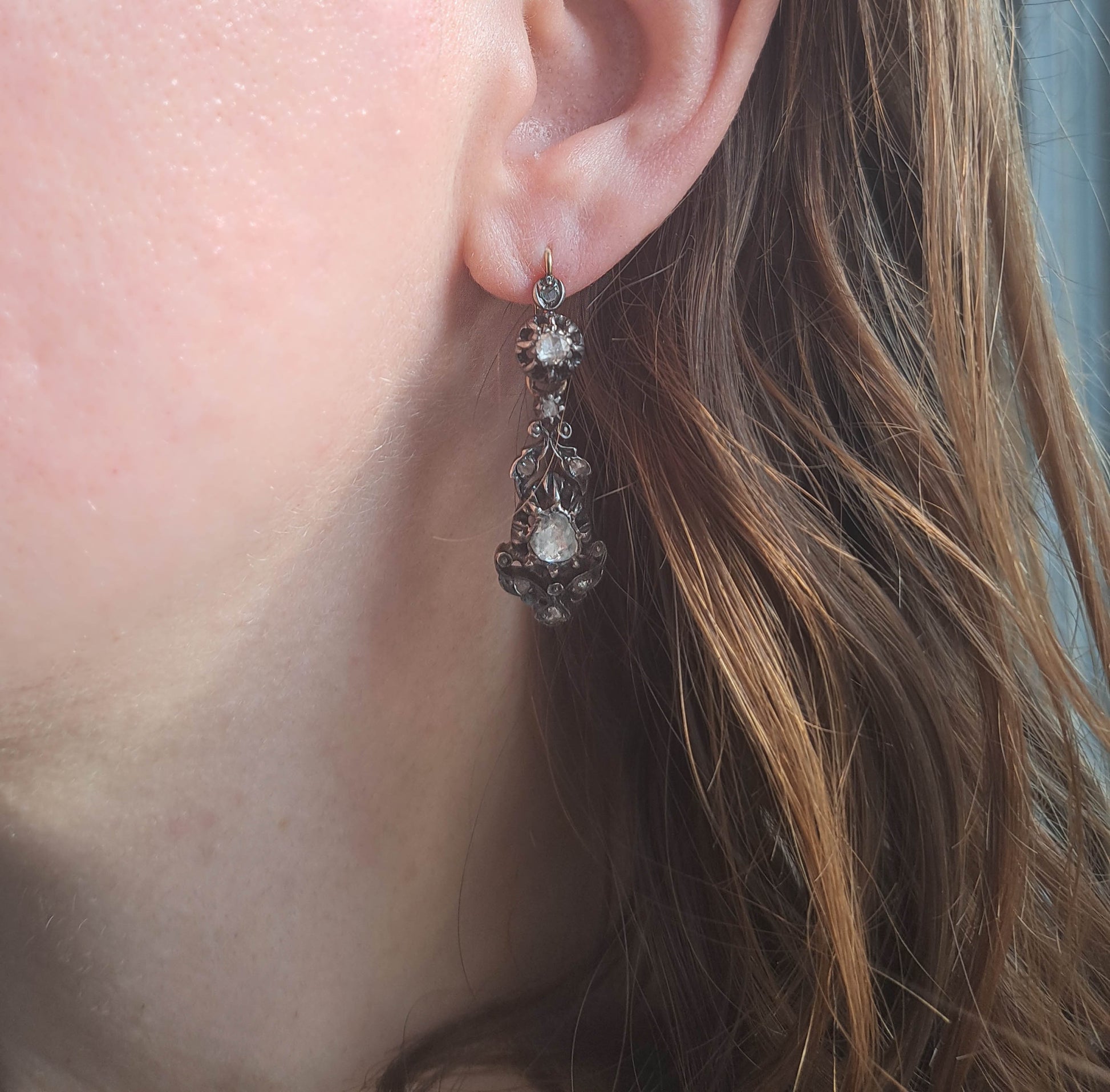 The earrings are in very good condition for age with secure closures. There is no wear to the diamond facets under magnification and the diamonds are well secured. There is oxidation and micro-scratches consistent with age and use.