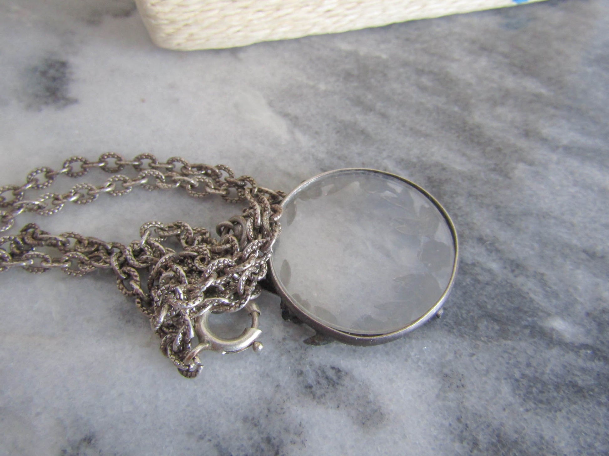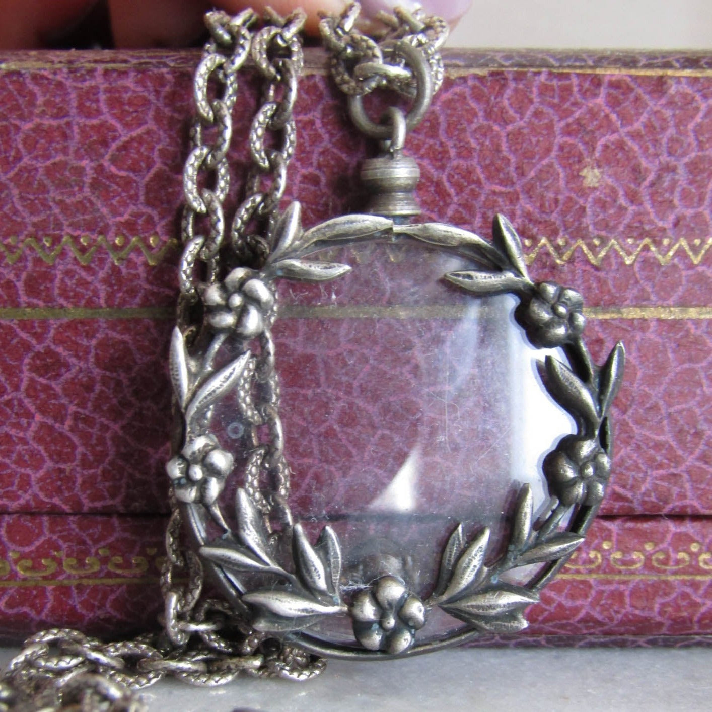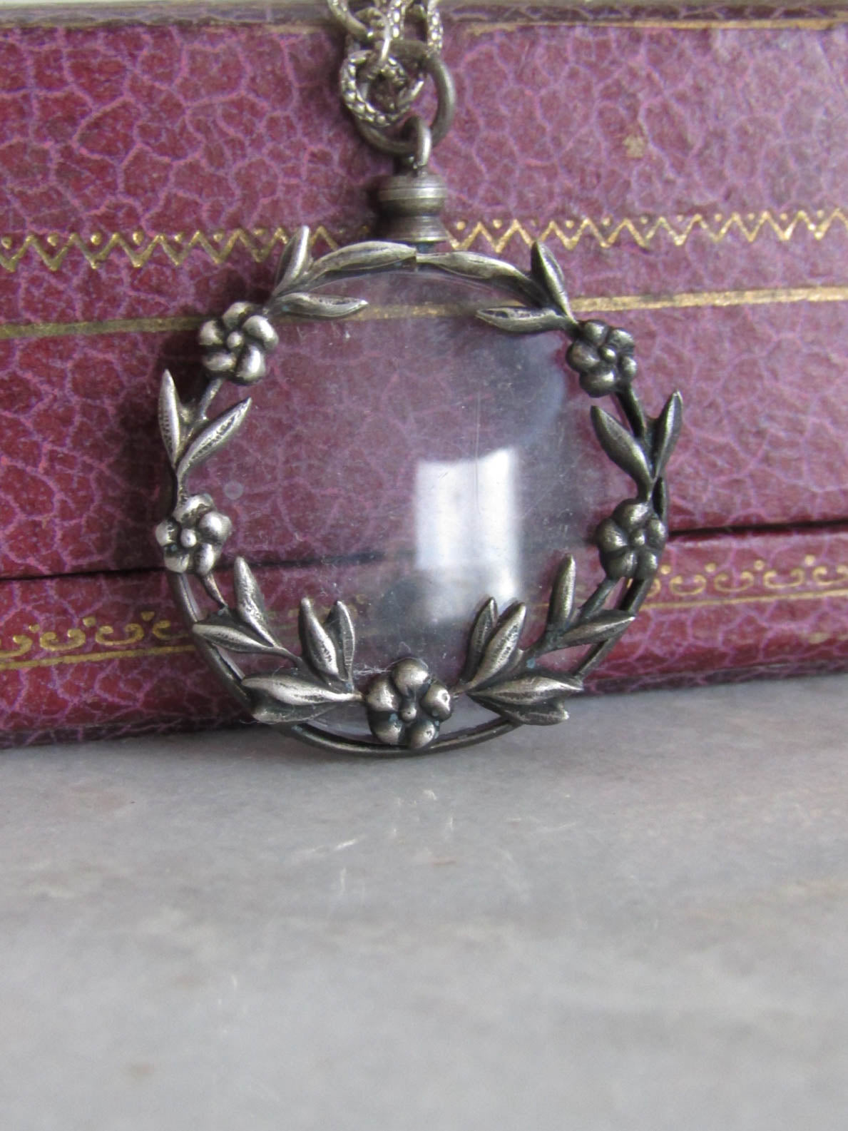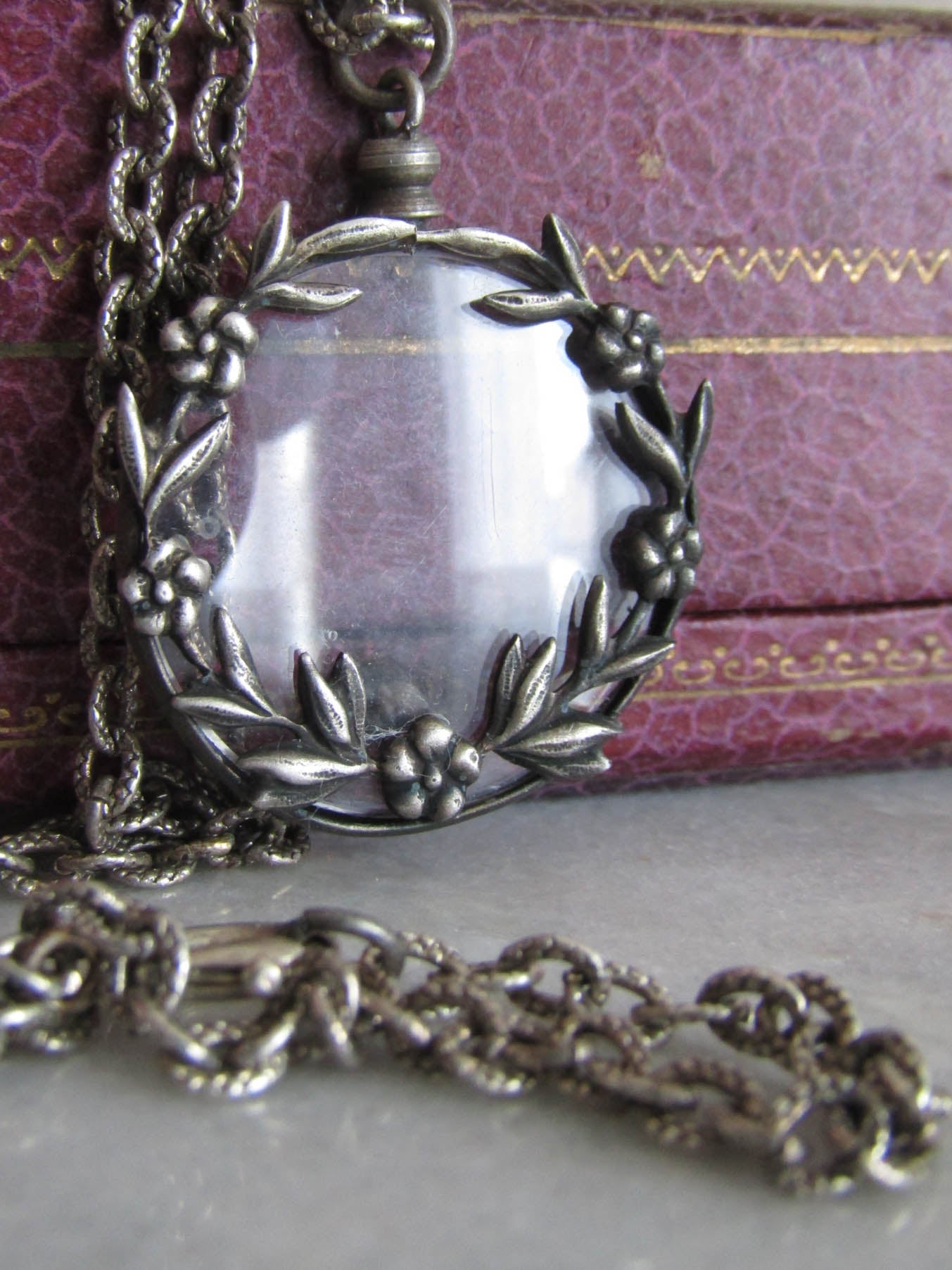This spectacularly lovely antique French round shaker locket necklace comes from an old Parisian jewelry shop in the 1920s. Deadstock, it is in excellent antique condition with no notable wear to the locket or chain. High quality silver plate which has been beautifully worked into flowers which travel across the glass frame. The matching belcher chain has a unique texture, reminiscent of a Victorian long guard chain. The chain is the perfect length to wear the locket pendant comfortably. Please note that the chain and pendant are not easily separable as the bail is not large enough for the spring ring or closure to pass through. However, they fit very well together and make a lovely pair.