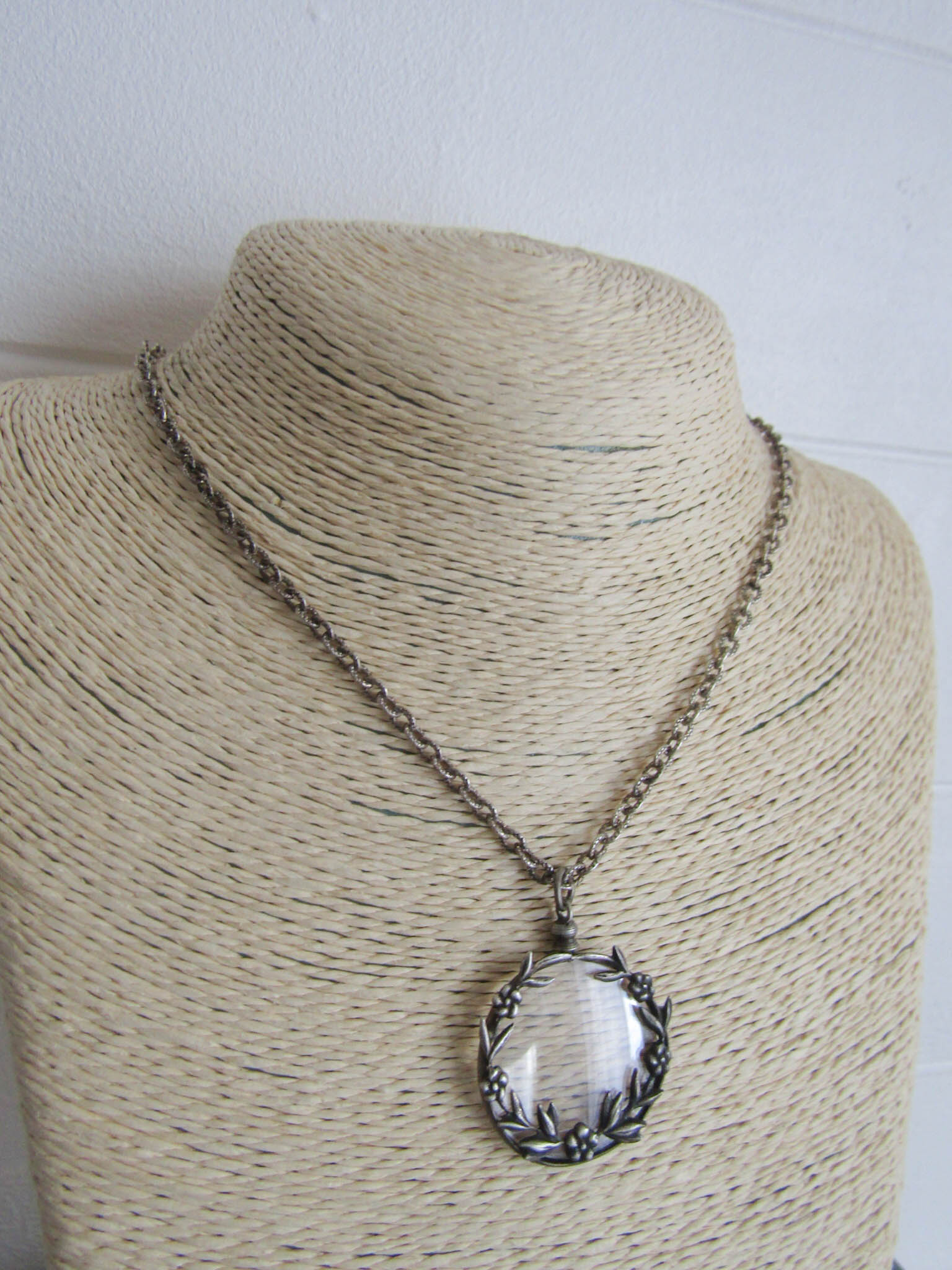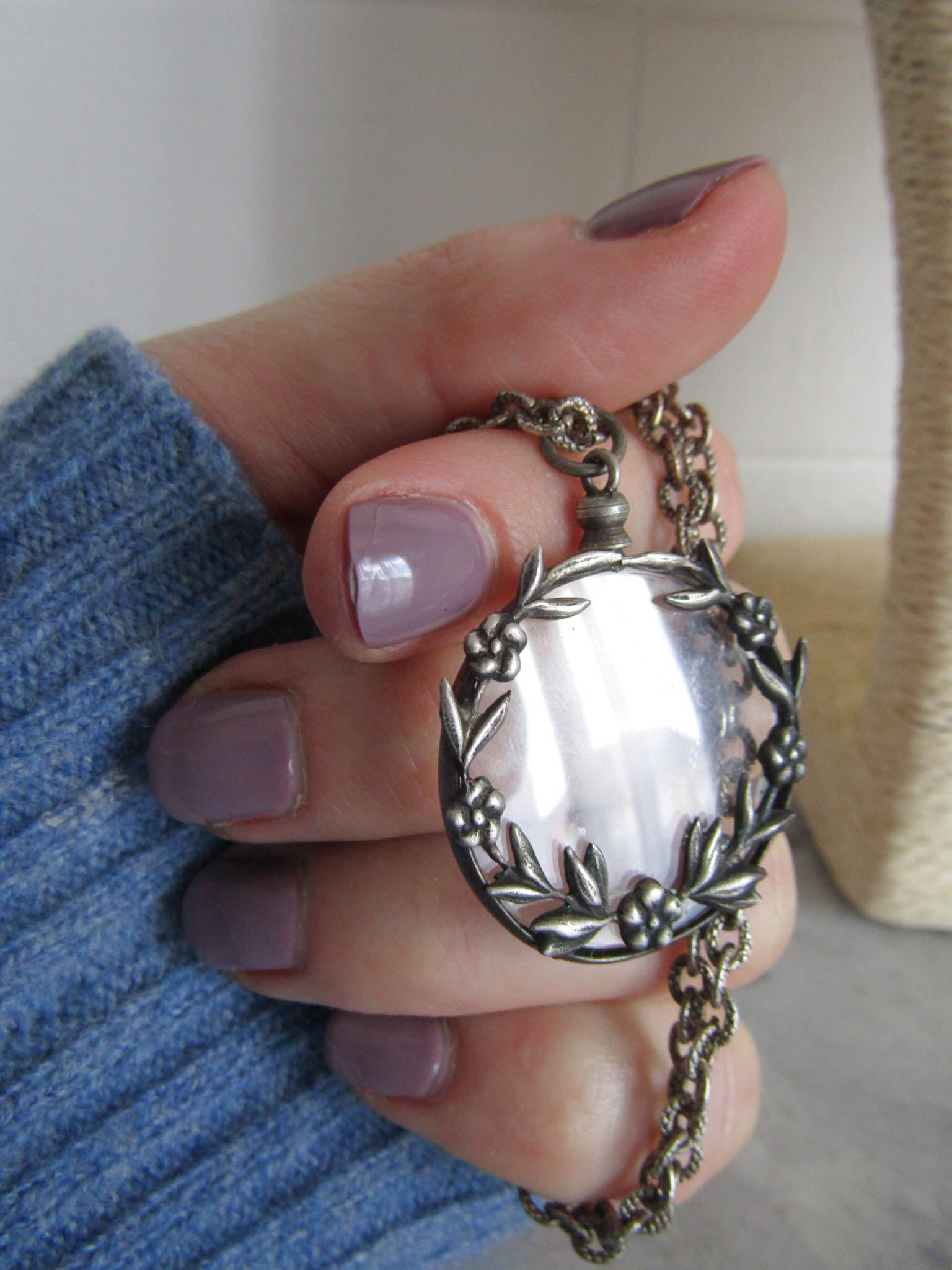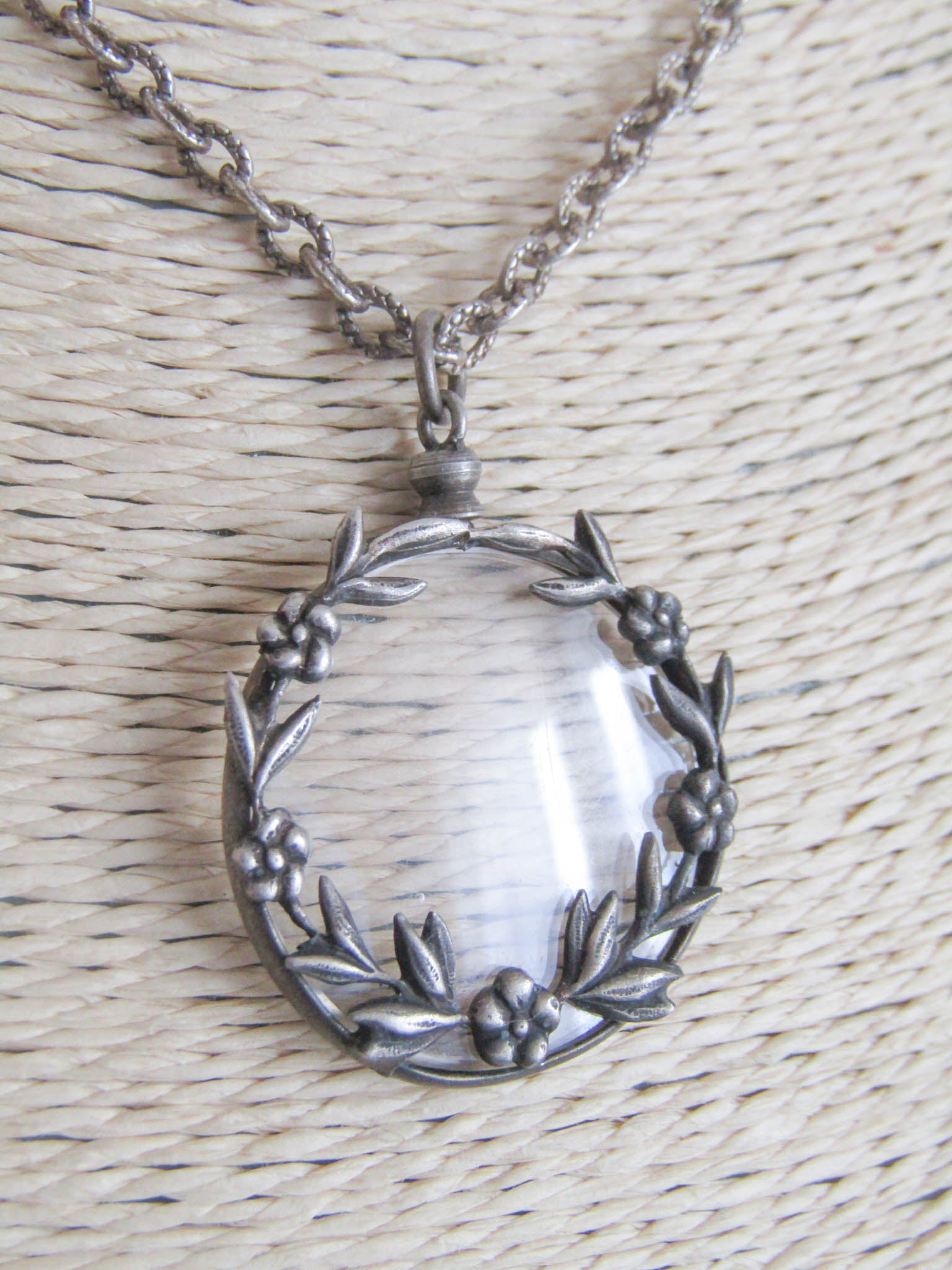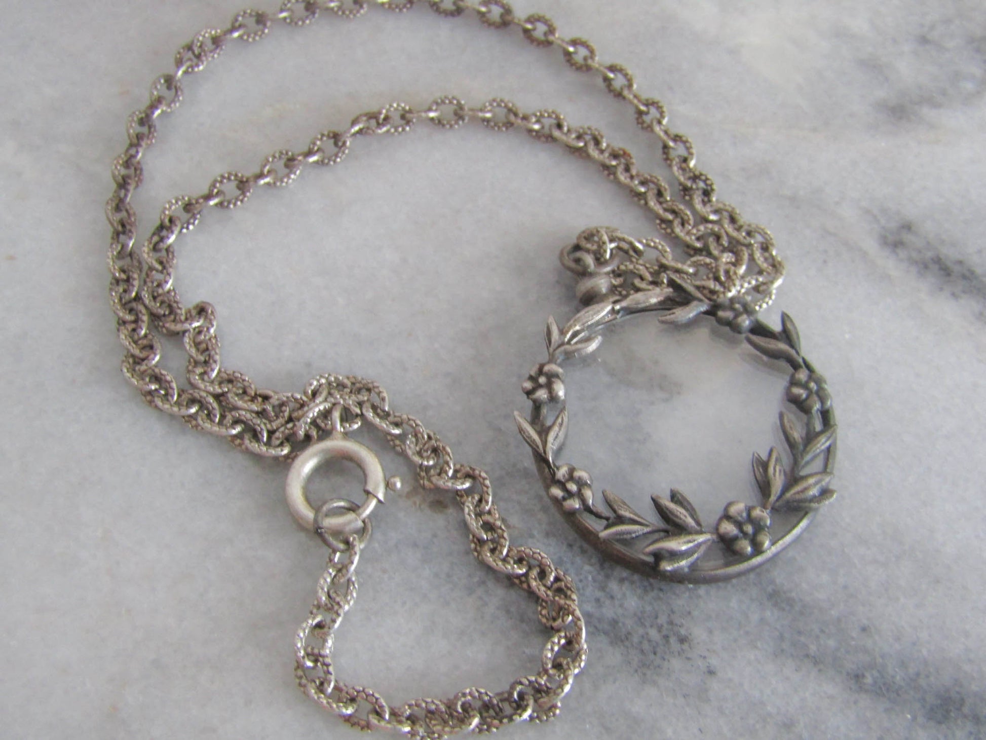 Antique French Round Silver Plate Photo Locket with Flowers c. 1920 and textured chain