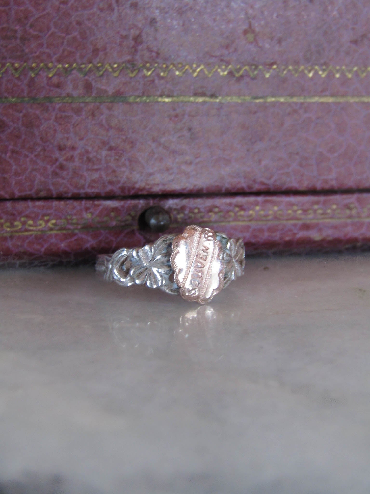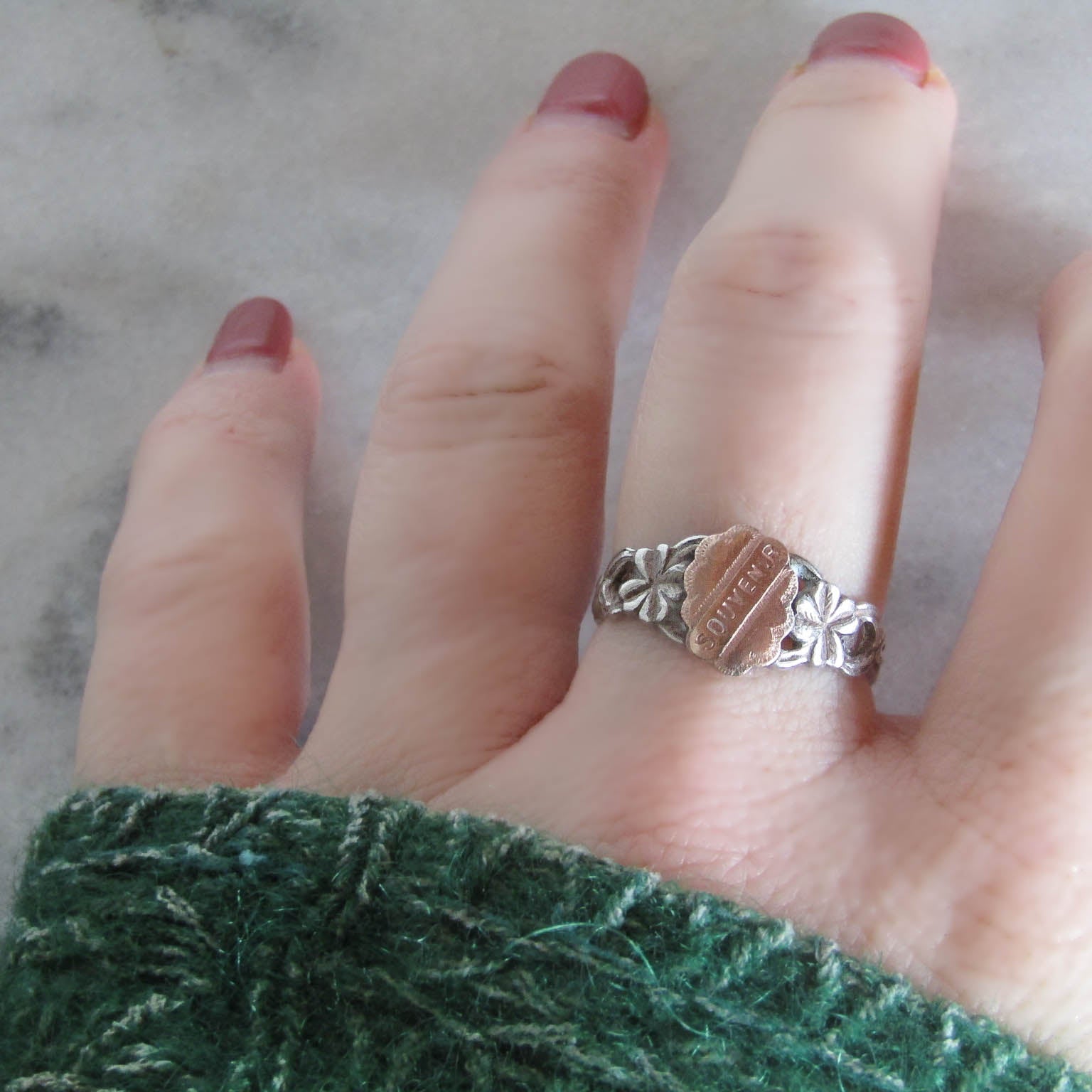 Rarely do I get pieces so sweet and sentimental. This beautiful, one-of-a-kind ring features a central shield with rose gold fill, engraved with the word "souvenir" or "memories". The central shield is flanked by a four leaf clover on each side, a timeless symbol of good fortune. The band is hallmarked for a minimum of 800 silver purity.