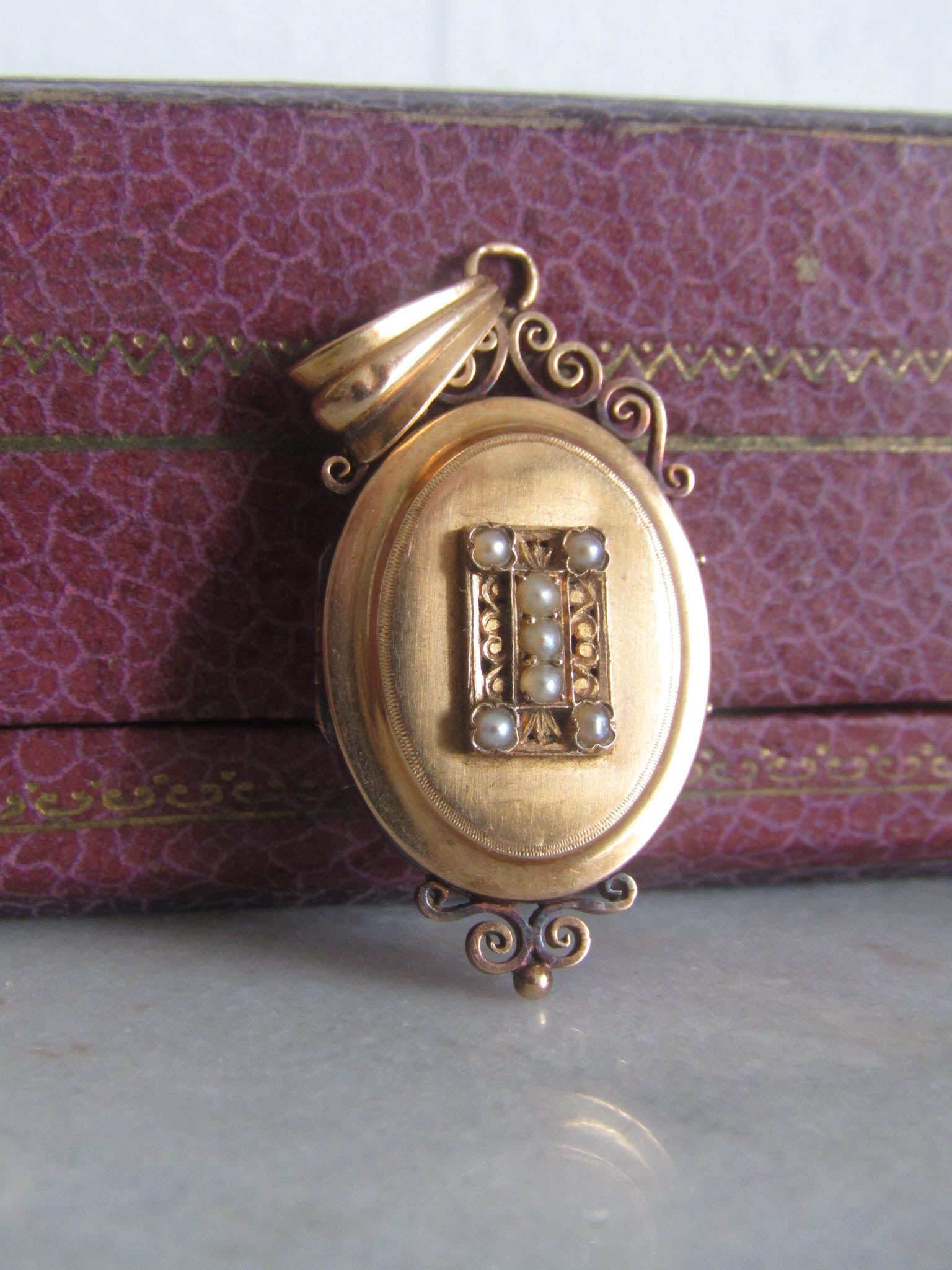 Eye catching and beautifully crafted, this antique locket is bursting with details and charm. It featuring a unique central design of engraved leaves and embedded seed pearls, often used to symbolize purity in the Victorian period. I personally love the design elements on the top and bottom which elongate the oval shape and add some delicate femininity. These lockets were often sentimental in nature and stored a lock of hair or picture from a loved one. I always love to put dried flowers in my lockets but it could also hold gem stones or anything else that needs to be guarded preciously.