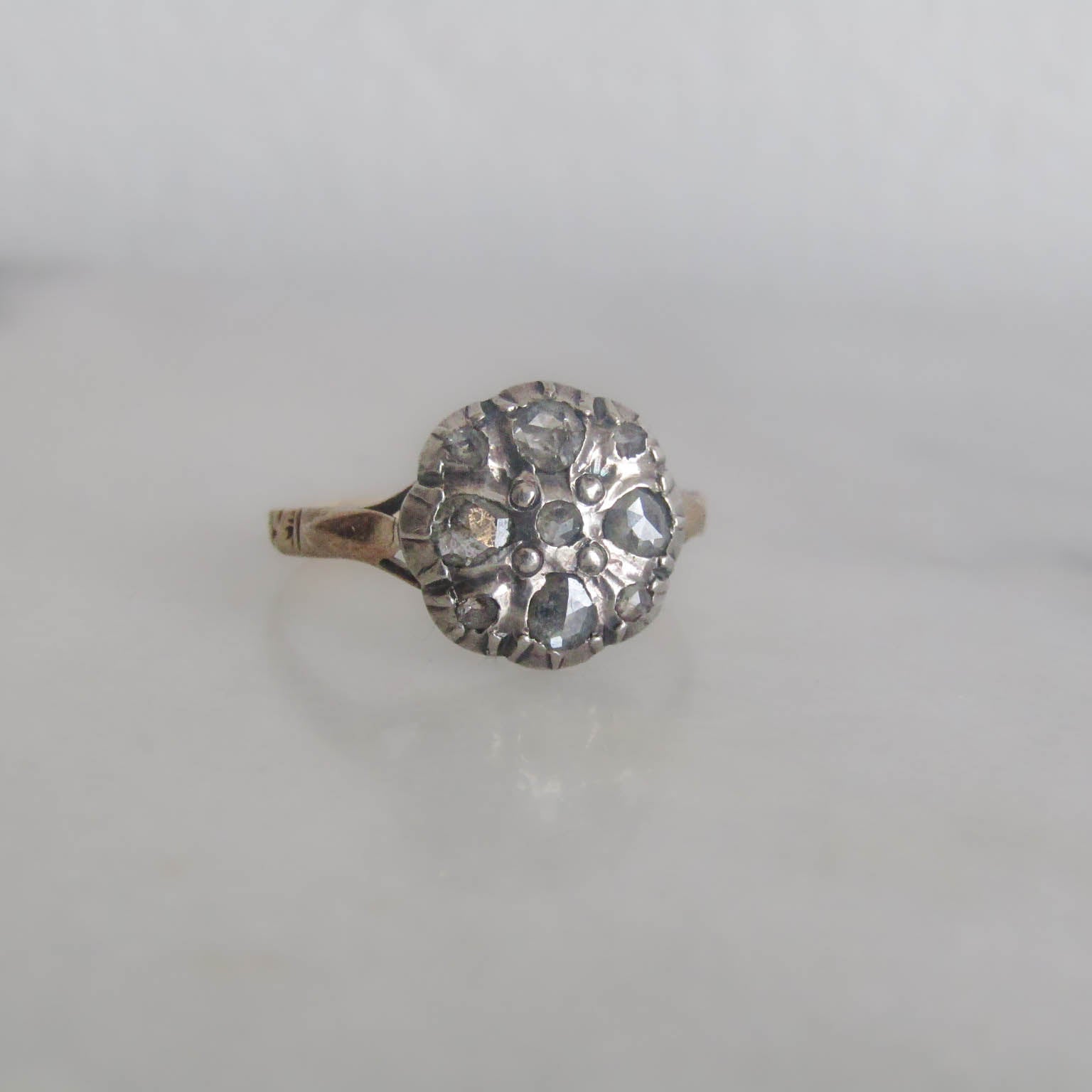 This lovely diamond cluster ring is a Georgian Revival piece crafted in the early 20th century in the Netherlands. Hallmarked with an oak leaf, in use from 1852-1906, the band is made of beautifully decorated 14K yellow gold. The face of the ring features rose cut diamonds securely held in a silver cut down collet setting. Setting diamonds in silver was a popular design element in antique jewelry as it helped reflect the light around the diamonds and enhanced their brilliance. The diamonds are open backed.
