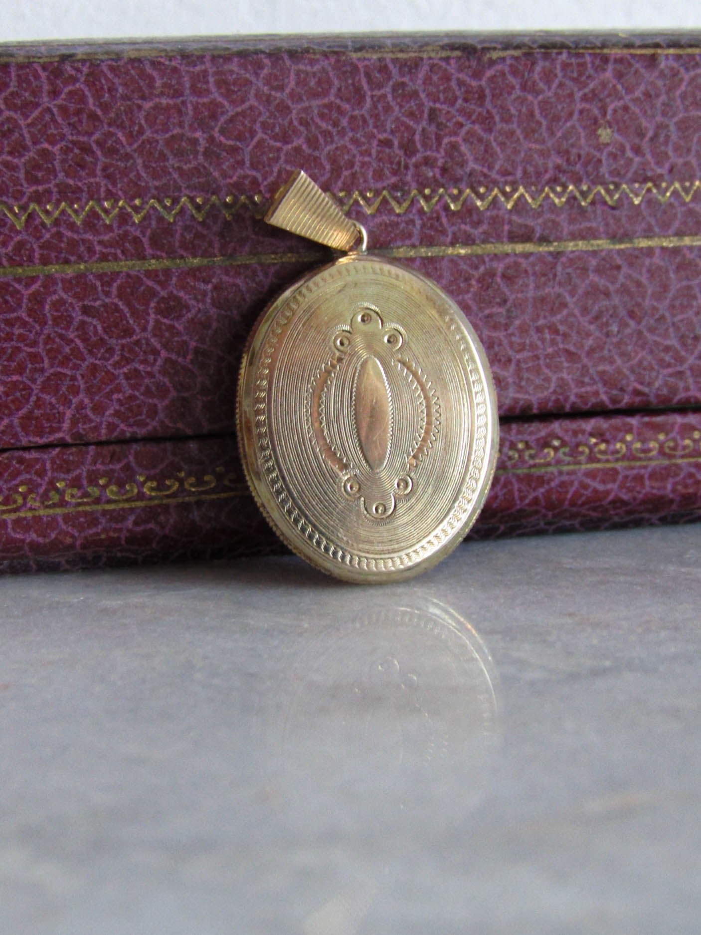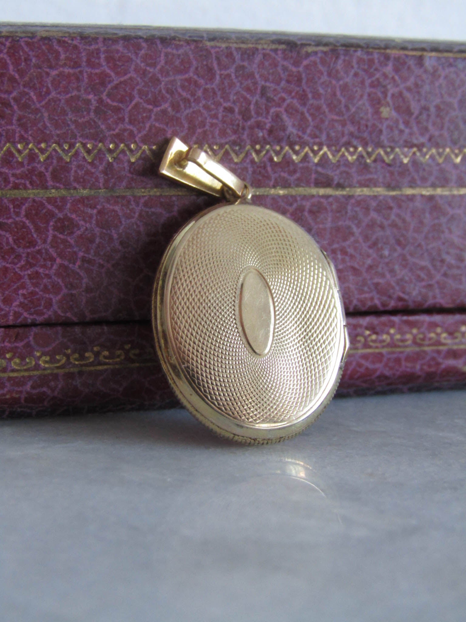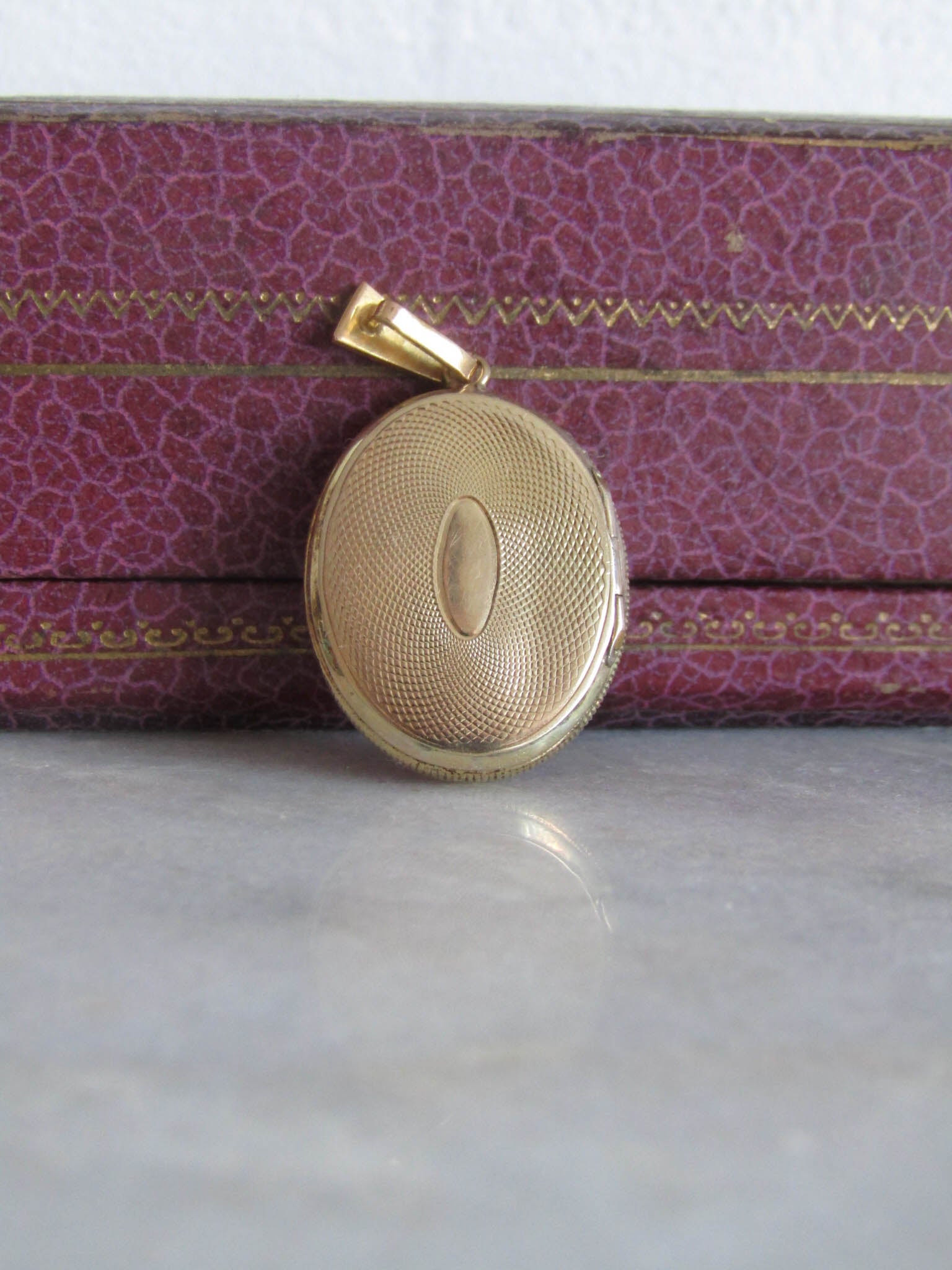 Unique and delicate, this oval locket is crafted from thick and high quality gold fill. It features a lovely guilloche design on the front, and a secret compartment on the reverse, which can be used to store a photo or special memory. Two original glass frames still remain to protect a photo, which can be removed and replaced with a delicate hand. The locket is light weight with an impressive amount of detailing. Large enough to make an impression but lightweight enough that it is very comfortable to wear, this would make a beautiful addition to any collection.