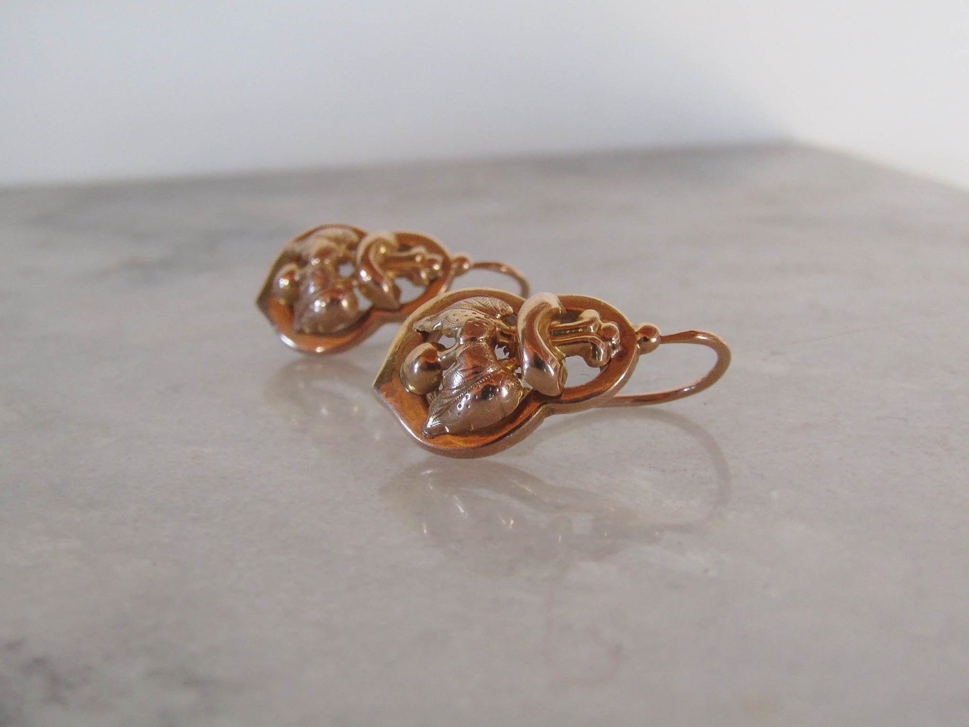 The earrings are in good antique condition for age. They have light micro scratches to the gold and the raised gold on the earrings has worn down, visible in photos but nothing that takes away from their charm. Check the photos and videos for more details. They are hallmarked with an horse head, in use from 1838-1919, at the base of the hinge.