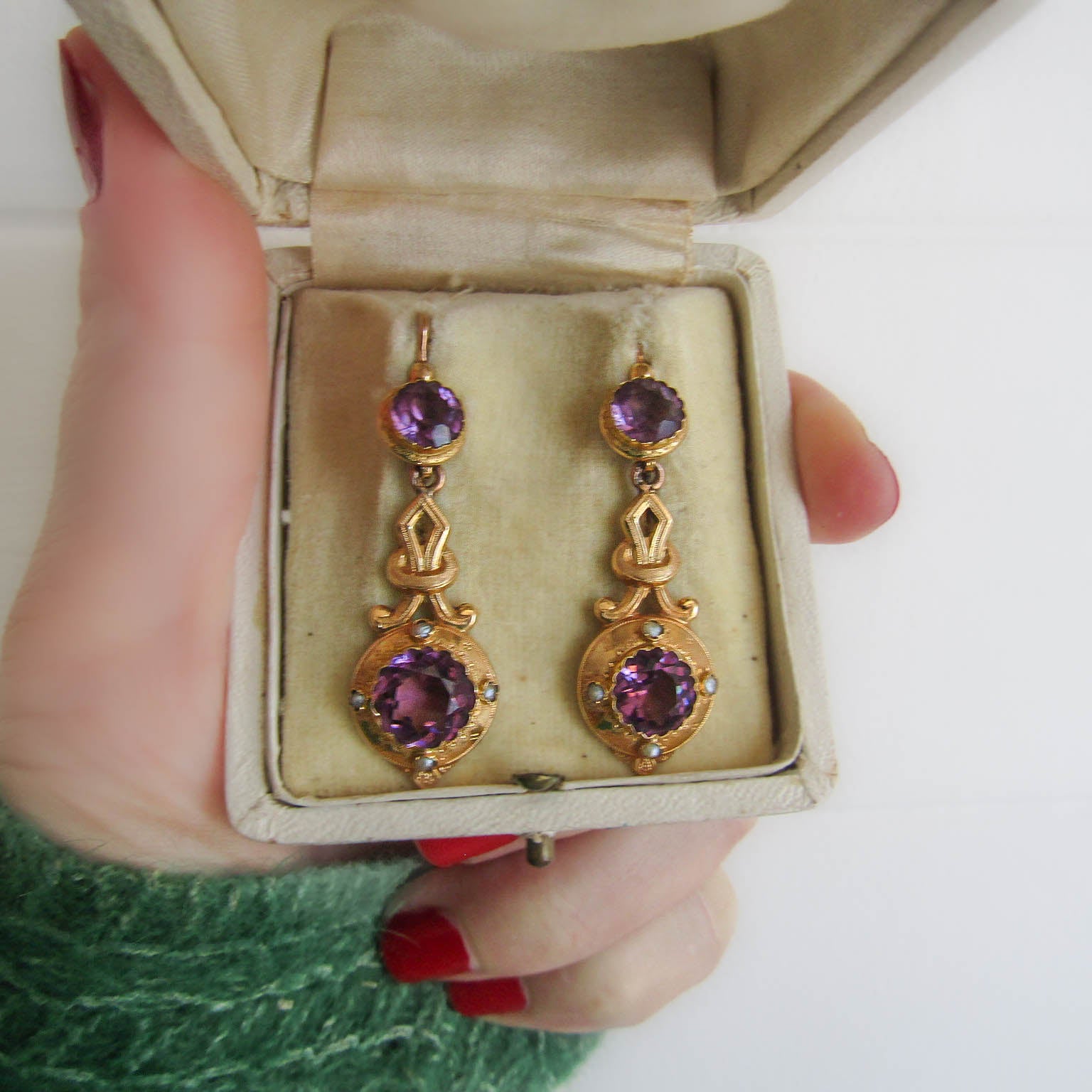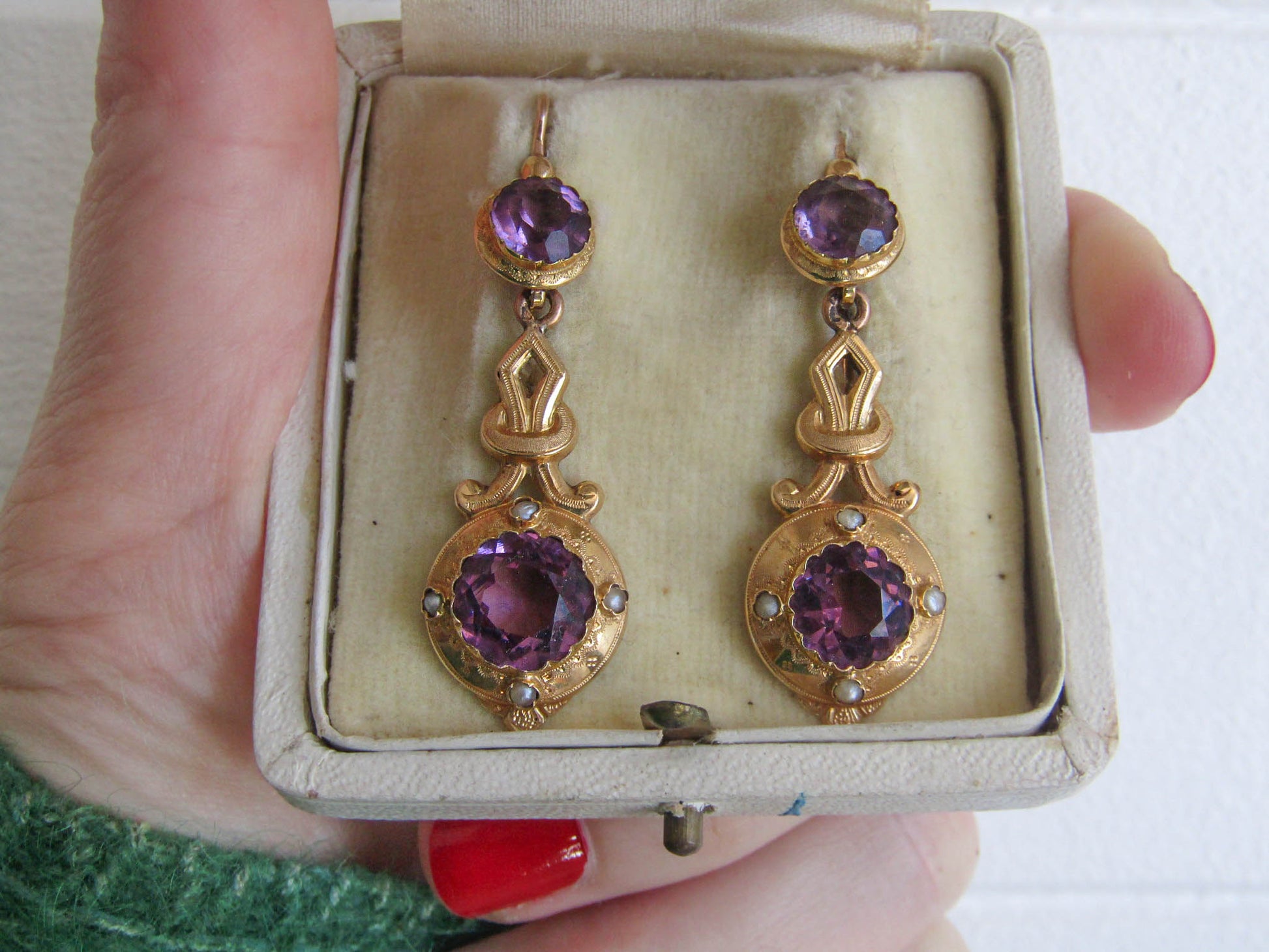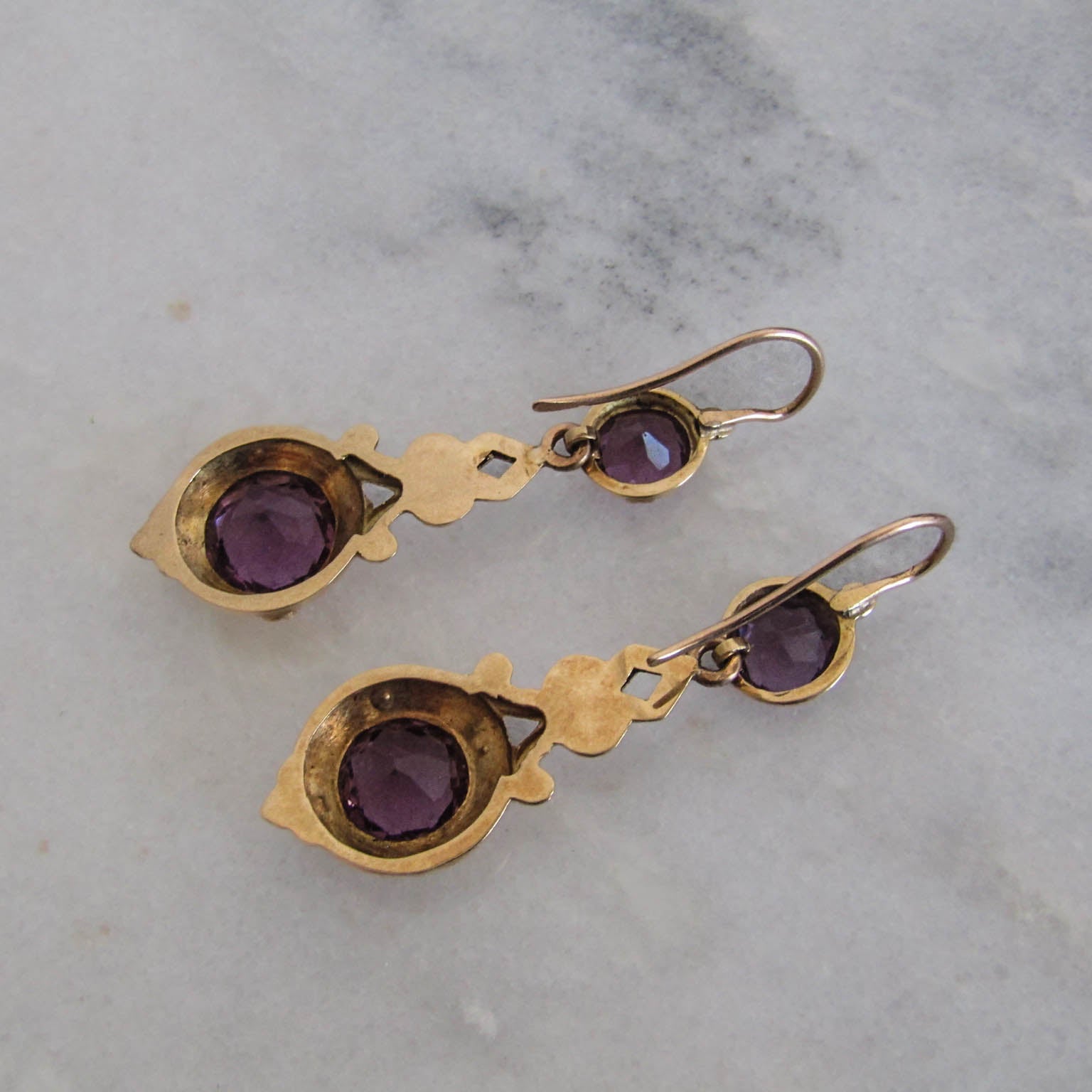 These breathtaking antique French amethyst pendant earrings were created in the Napoleon III period and feature two large round amethyst paste stones surrounded by a crimpled bezel. Amethyst paste is a type of colored flint glass. Paste has been used for centuries as gem substitute and are convincing imitations. Not detachable, the bottom hangs beautifully from the top and is fixed securely. They retain the original fishhook backing and are hallmarked with an eagle head, visible in photo nine. The closures make for easy every day wear and the earrings are not heavy.