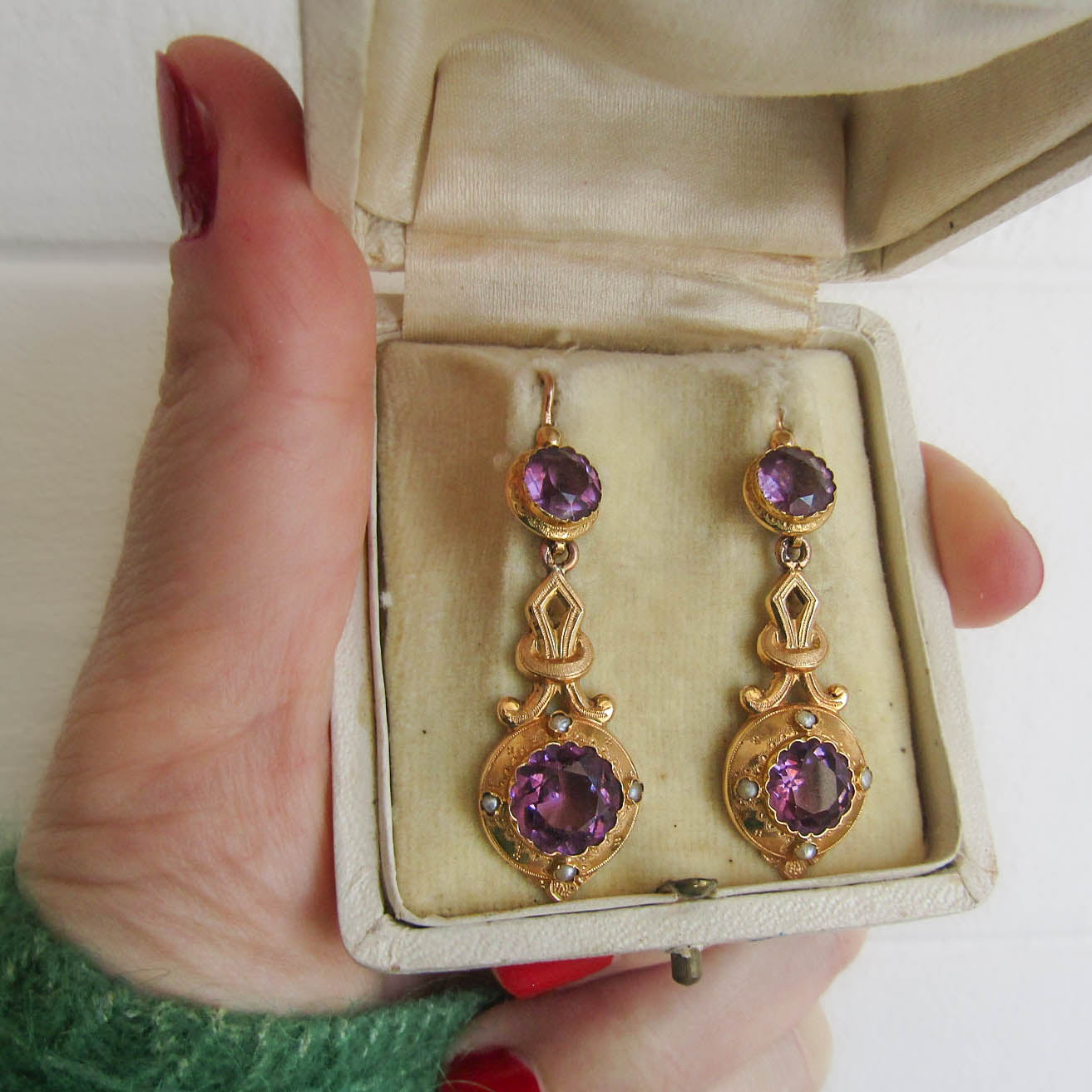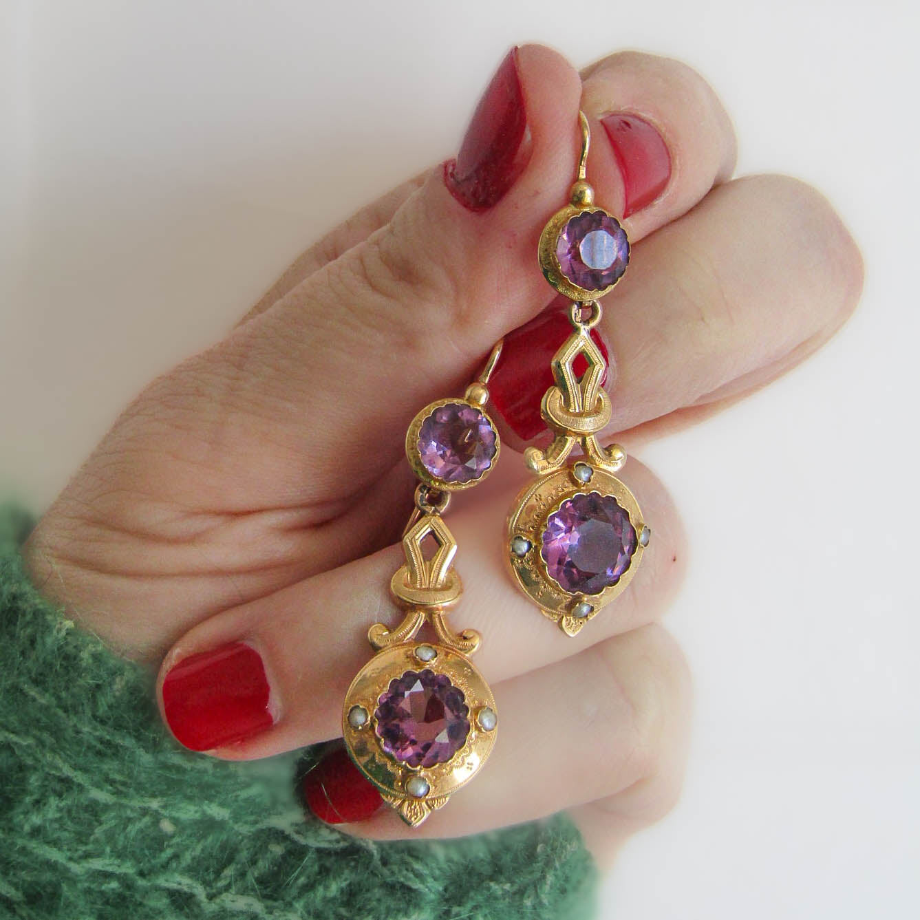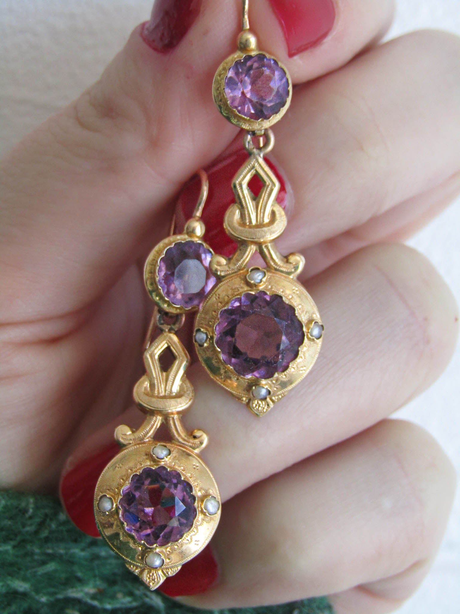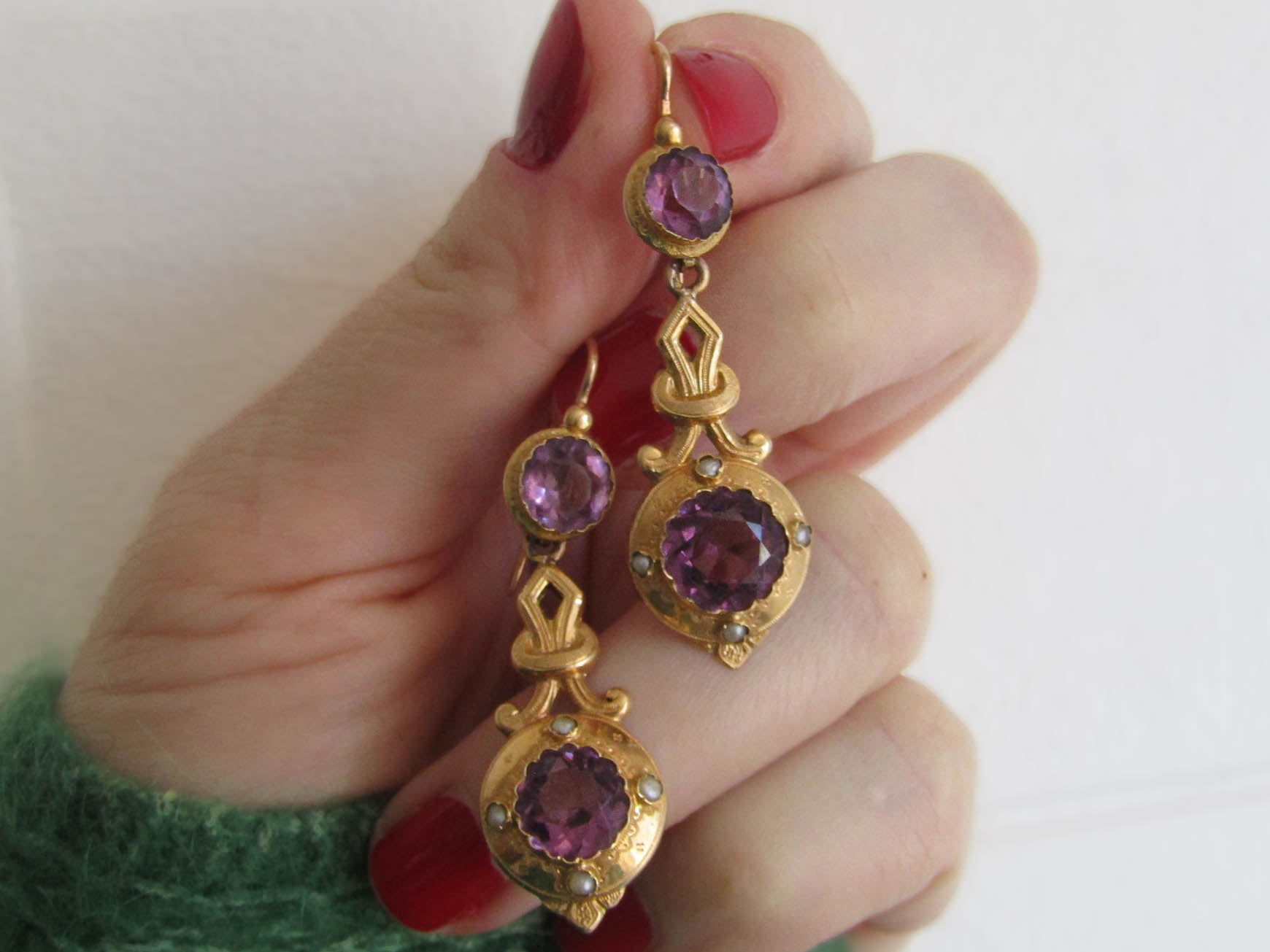 Antique Napoleon III French Amethyst Paste Etruscan Revival Earrings c. 1880