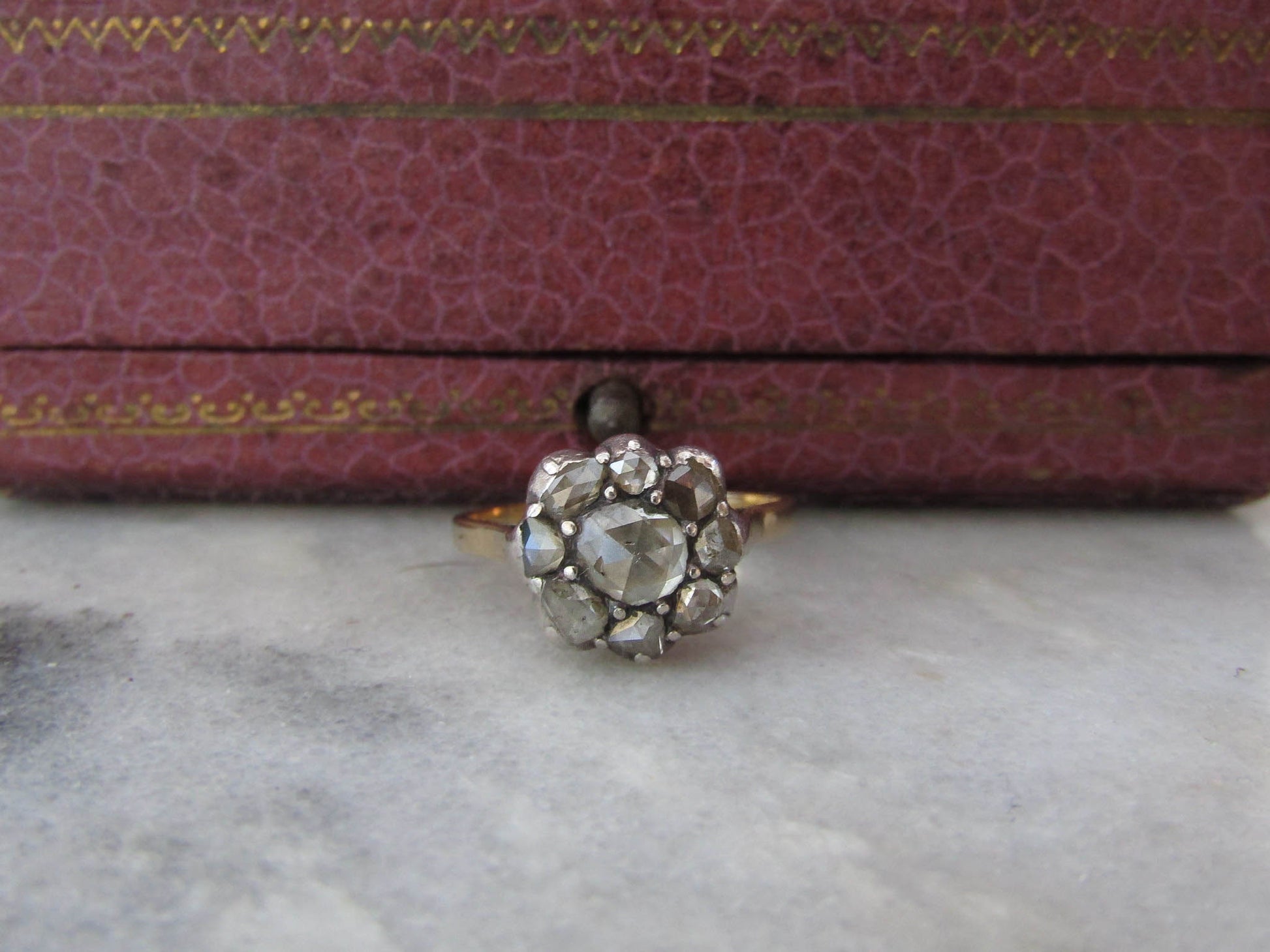 This unique, chunky ring features rose cut diamonds in an antique daisy cluster style. The diamonds are foiled to reflect light and securely set with cut down collets. The central rose cut diamond measures approximately 5 mm across and is surrounded by eight smaller rose cut diamonds measuring around 2.5-3.5 mm across. The diamonds were cut by an experienced lapidary to sparkle under candlelight and are filled with character.