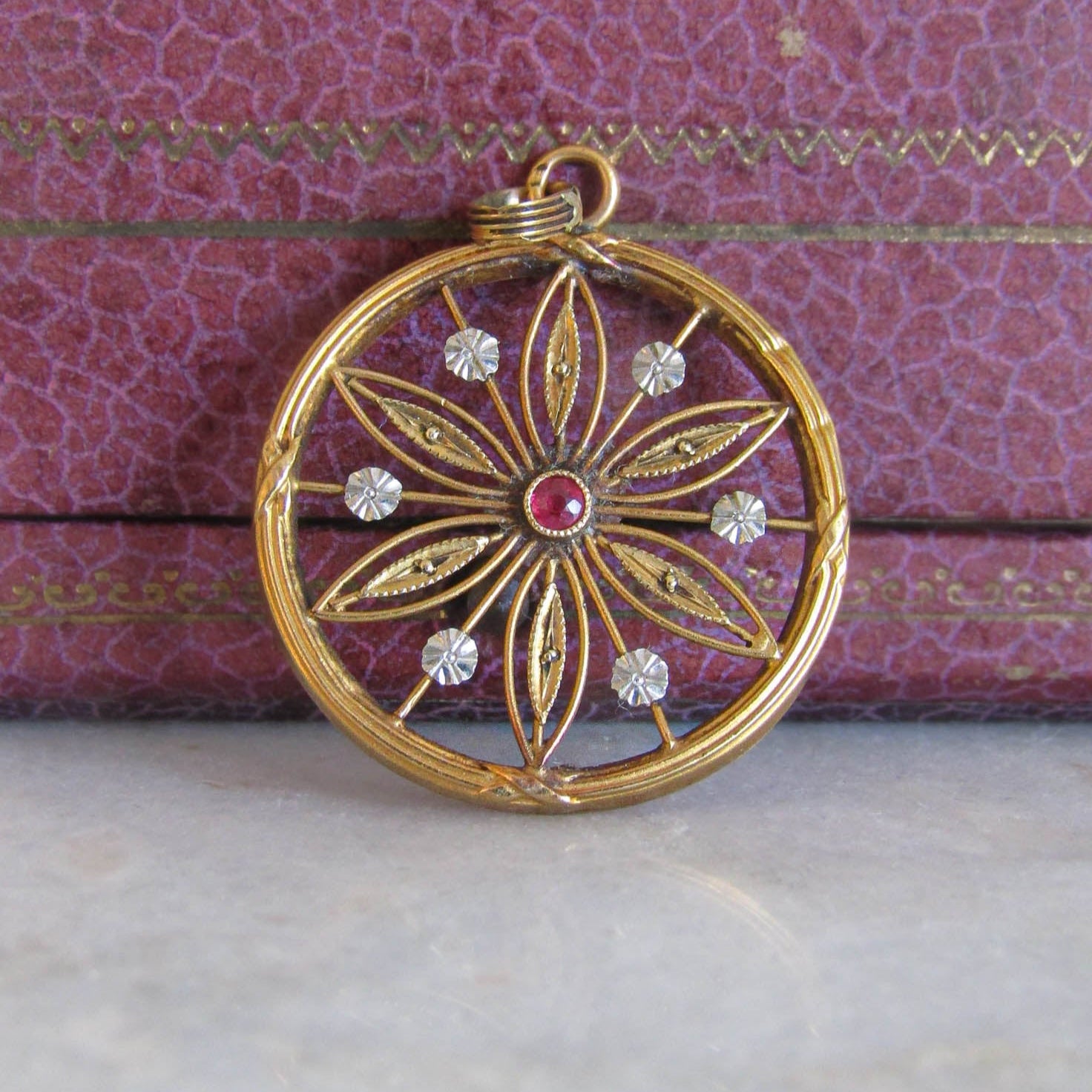 There's something so special about early 20th century jewelry. Whether it's the beautifully curved lines, the delicately worked details, or the bright sparkle of the gems, there is always something unique to give a 'coup de coeur'. This round pendant features a reed and crosshatch frame which surrounds a lovely symmetrical flower. In the middle lies a synthetic mixed cut ruby which measures approximately .25 cm and weighs roughly .05 ct. The white gold accents lend a nice touch of contrast, typical of the era.