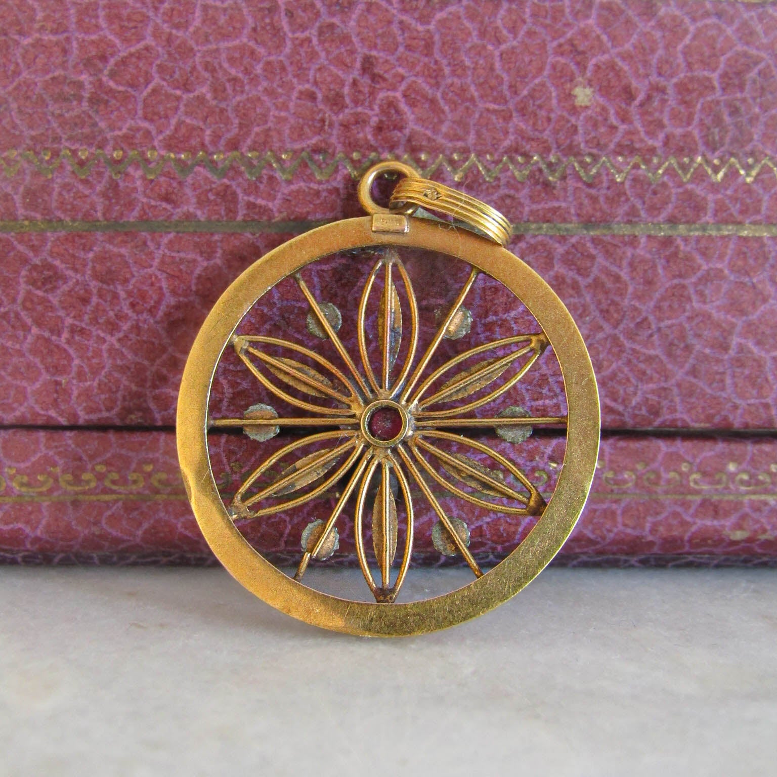 Antique Round Edwardian Floral Synthetic Ruby Pendant in 18K Solid Gold c. 1900