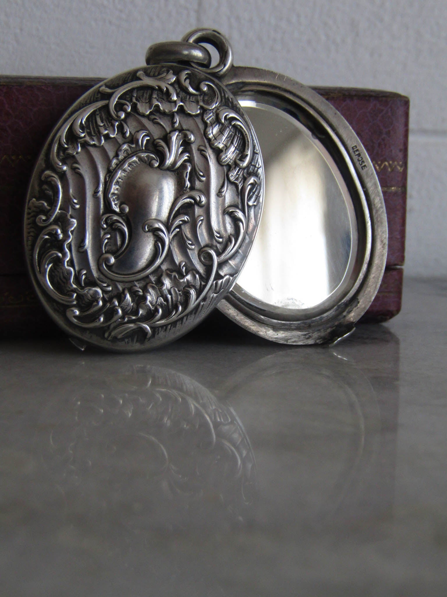The mirror is in good vintage condition with patches of de-silvering and cloudiness to one mirror. The sliding mechanism glides effortlessly and closes securely. The locket is hallmarked with the remnants of a boar's head and maker's mark, visible in the last photo.