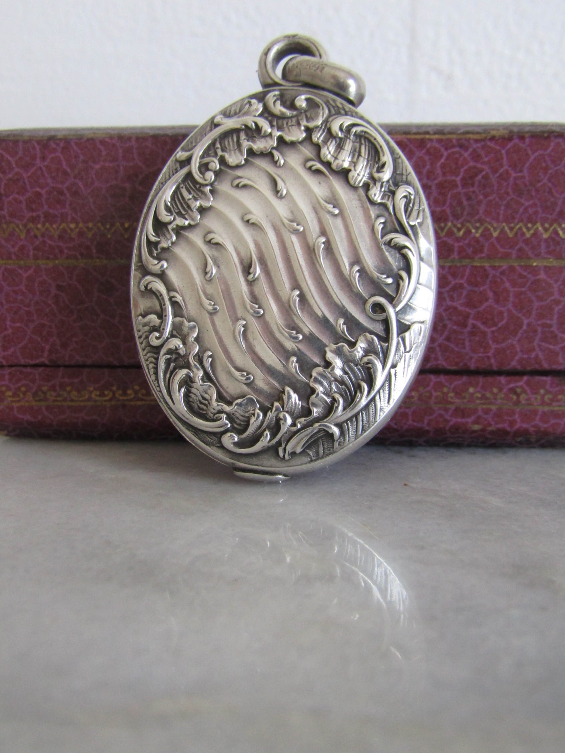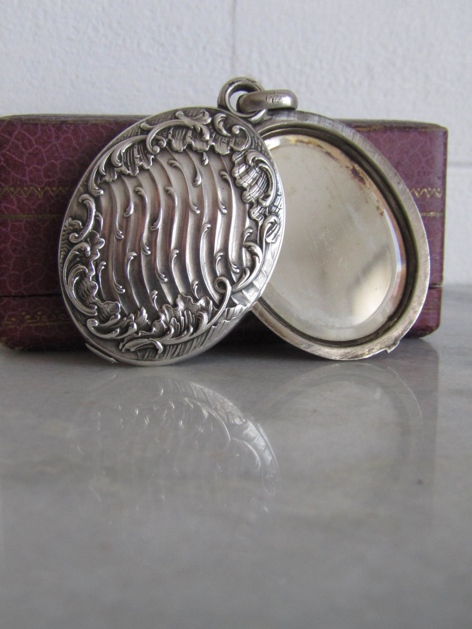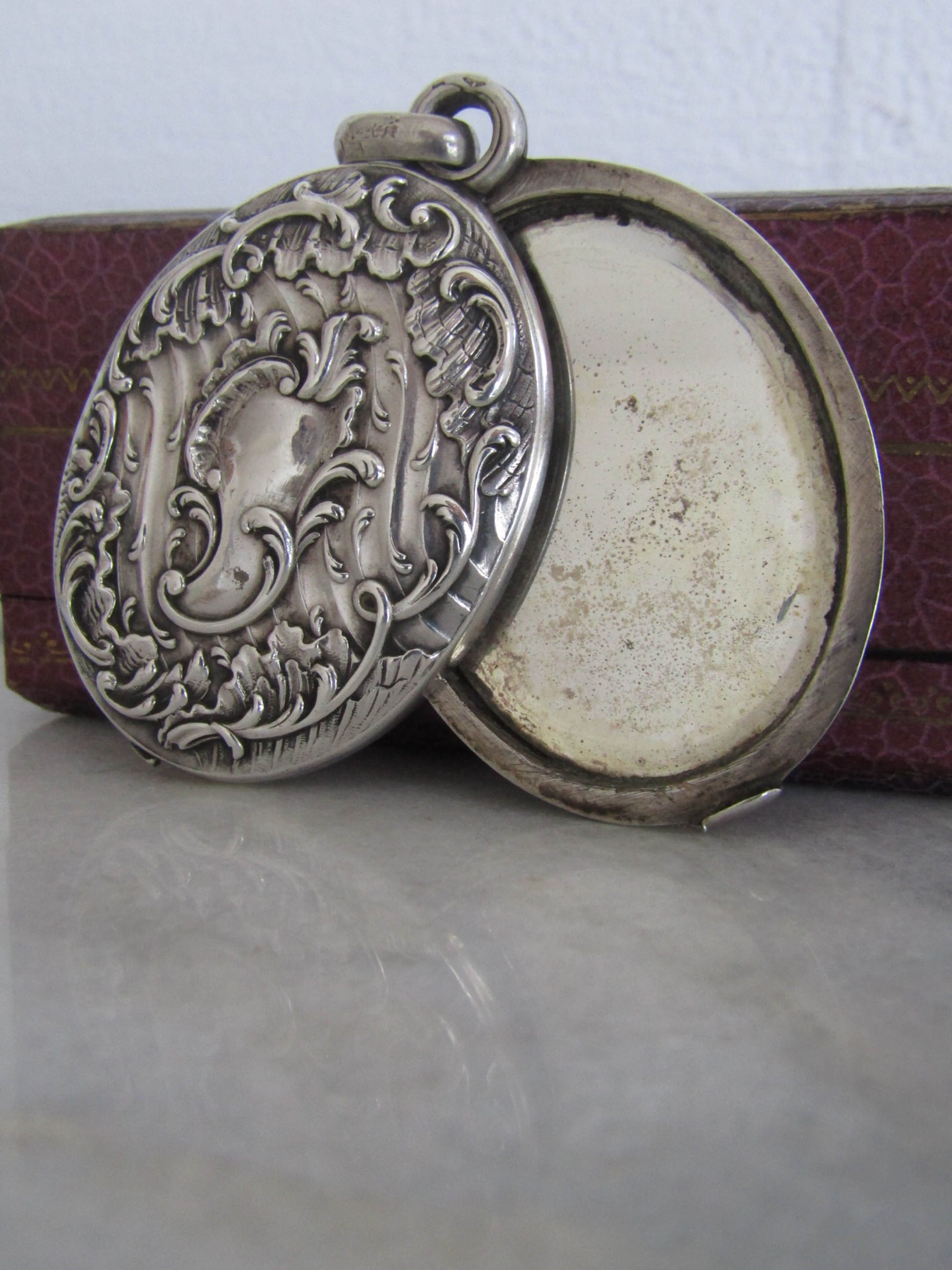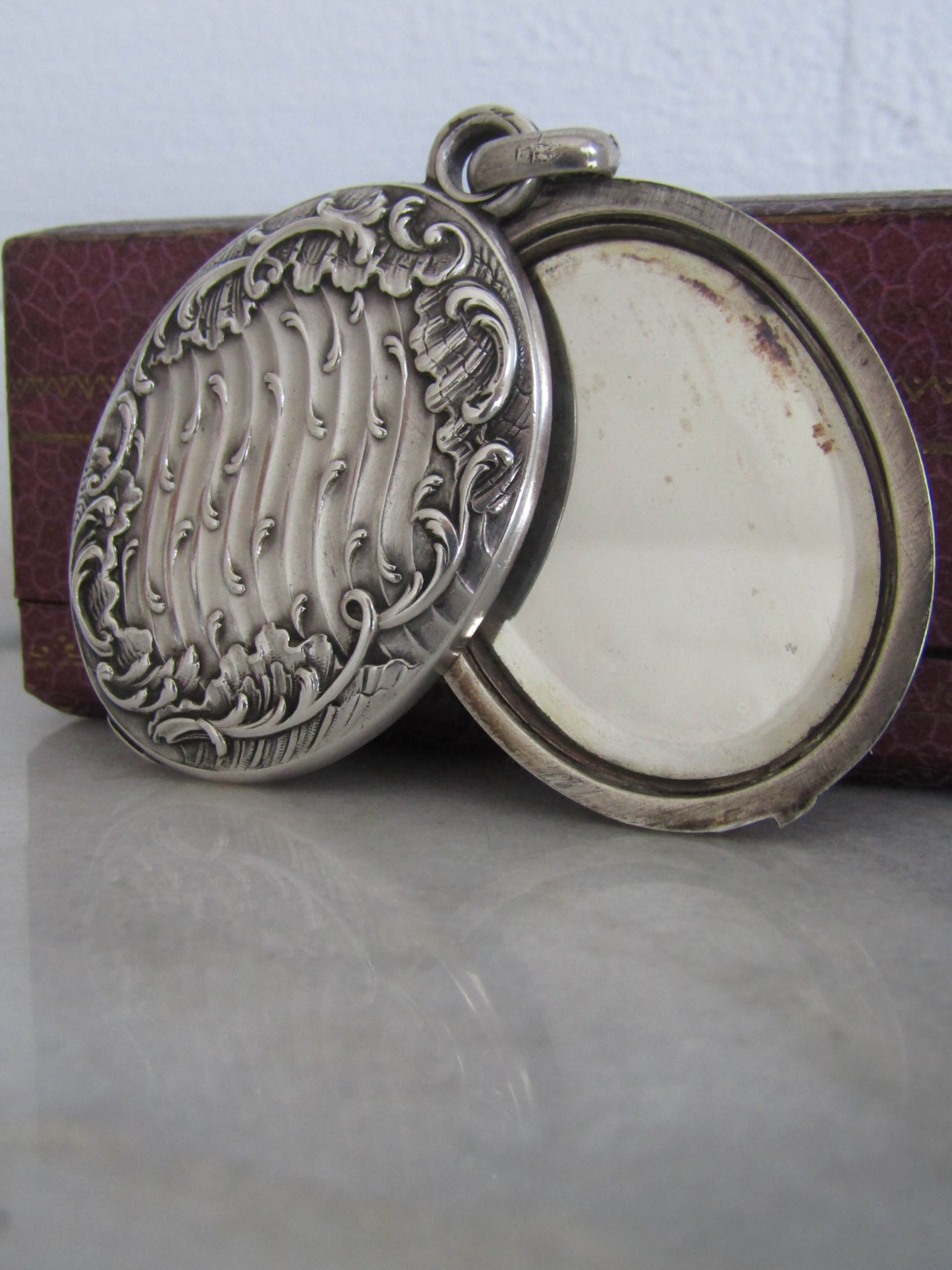 The mirror is in good vintage condition with patches of de-silvering and cloudiness to one mirror. The sliding mechanism glides effortlessly and closes securely. The locket is hallmarked with the remnants of a boar's head and maker's mark, visible in the last photo.