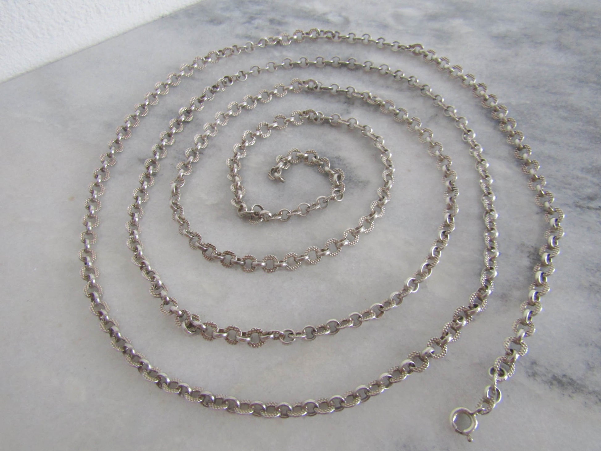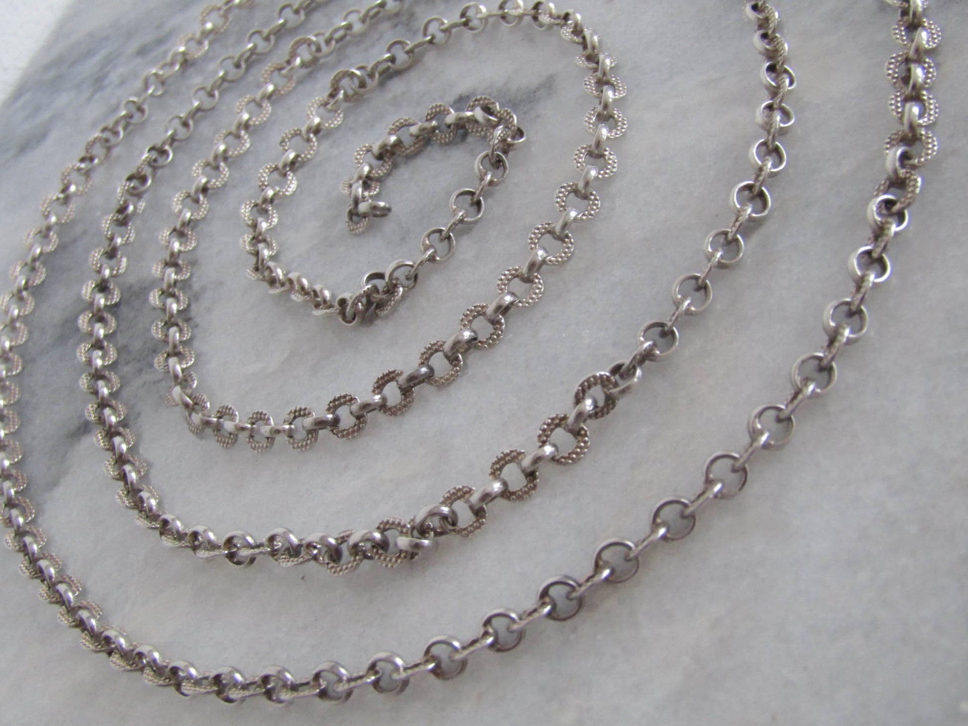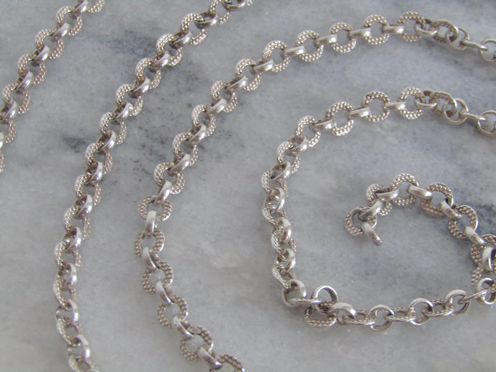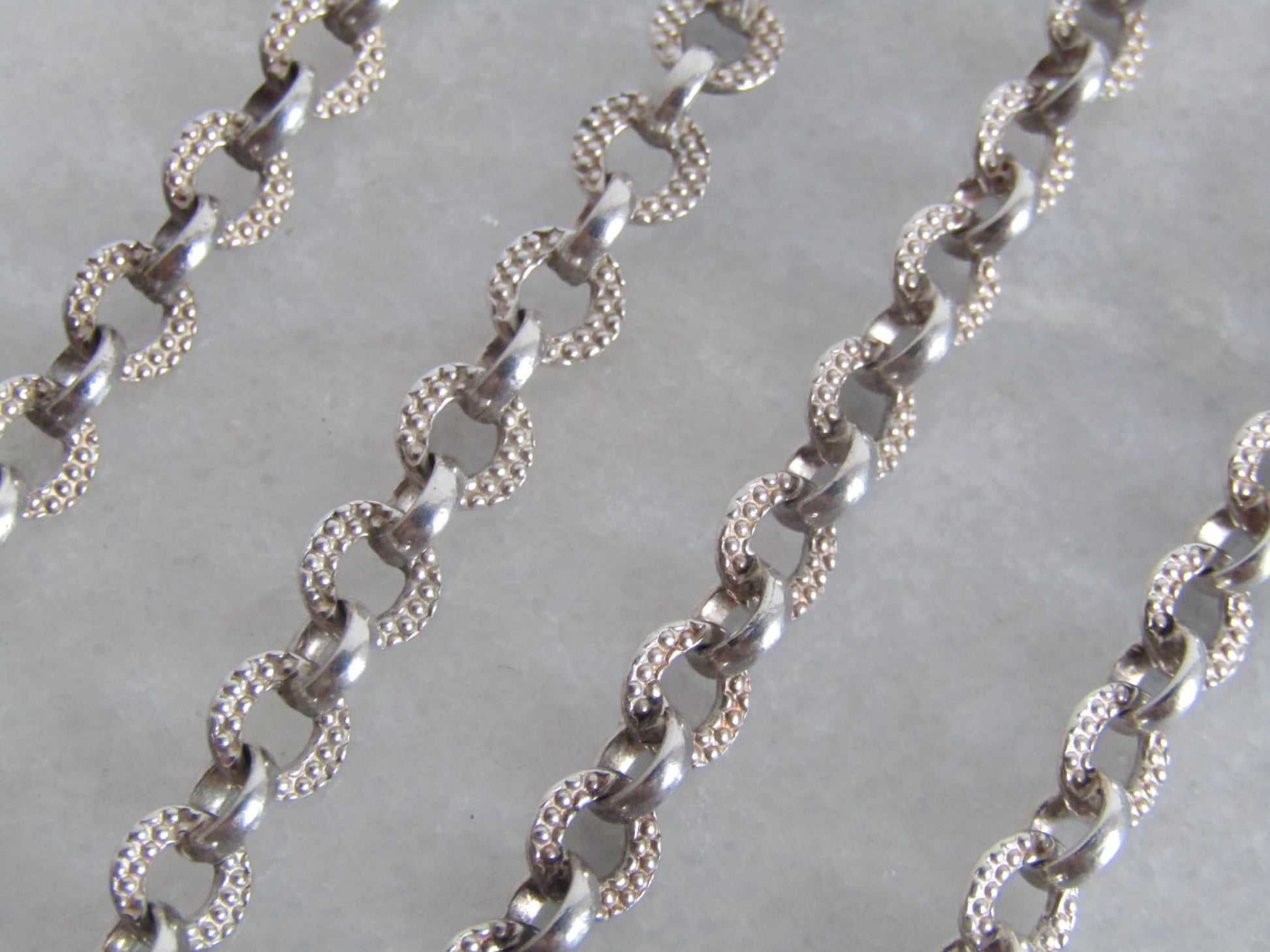 This absolutely stunning silver filigree chain is the work of a talented silversmith. Featuring thick and heavy textured rolo links which have been joined together, the chain can be worn doubled or tripled and is a versatile length. Textured links showcase the amount of work and craftsmanship that went into each individual link and the mastership to put it all together. The links are in excellent condition and the necklace is not but has been tested for at least 800 minimum silver. At it's full length it measures 124 cm or 48.8 inches.