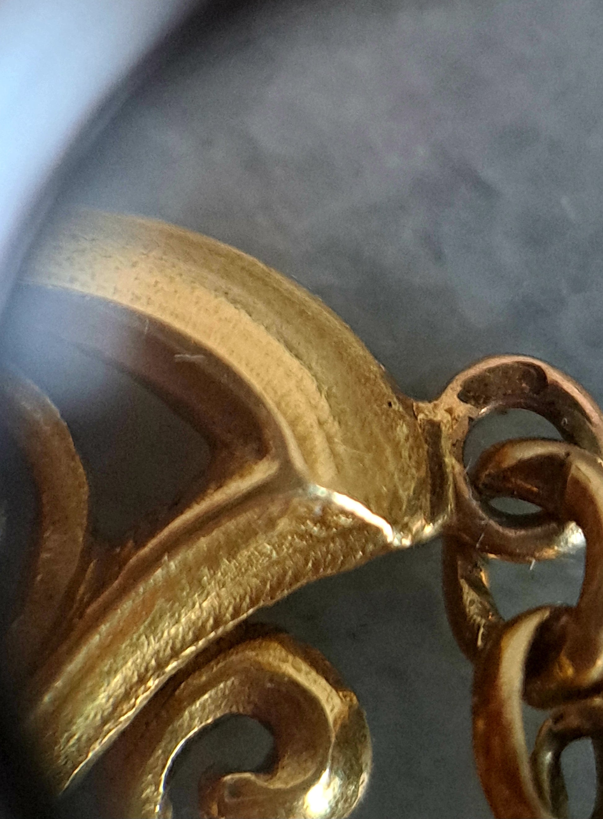 The clasp is a replacement with good tension and alignment but a slightly yellower color since it hasn't had a chance to develop the same lovely butter, old gold patina as the rest of the chain. The link are strong and in good condition but you will need to avoid any sudden tugs.