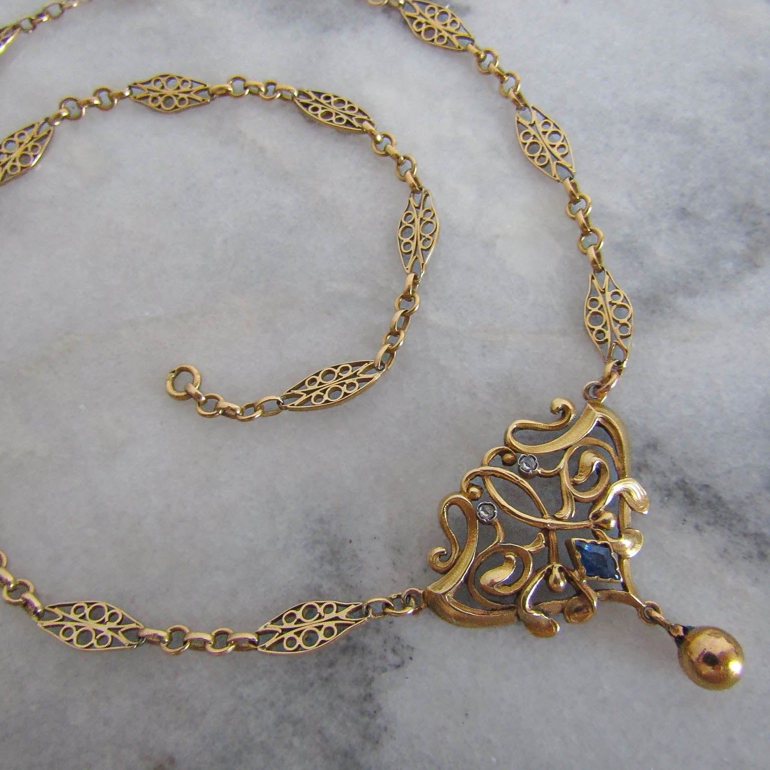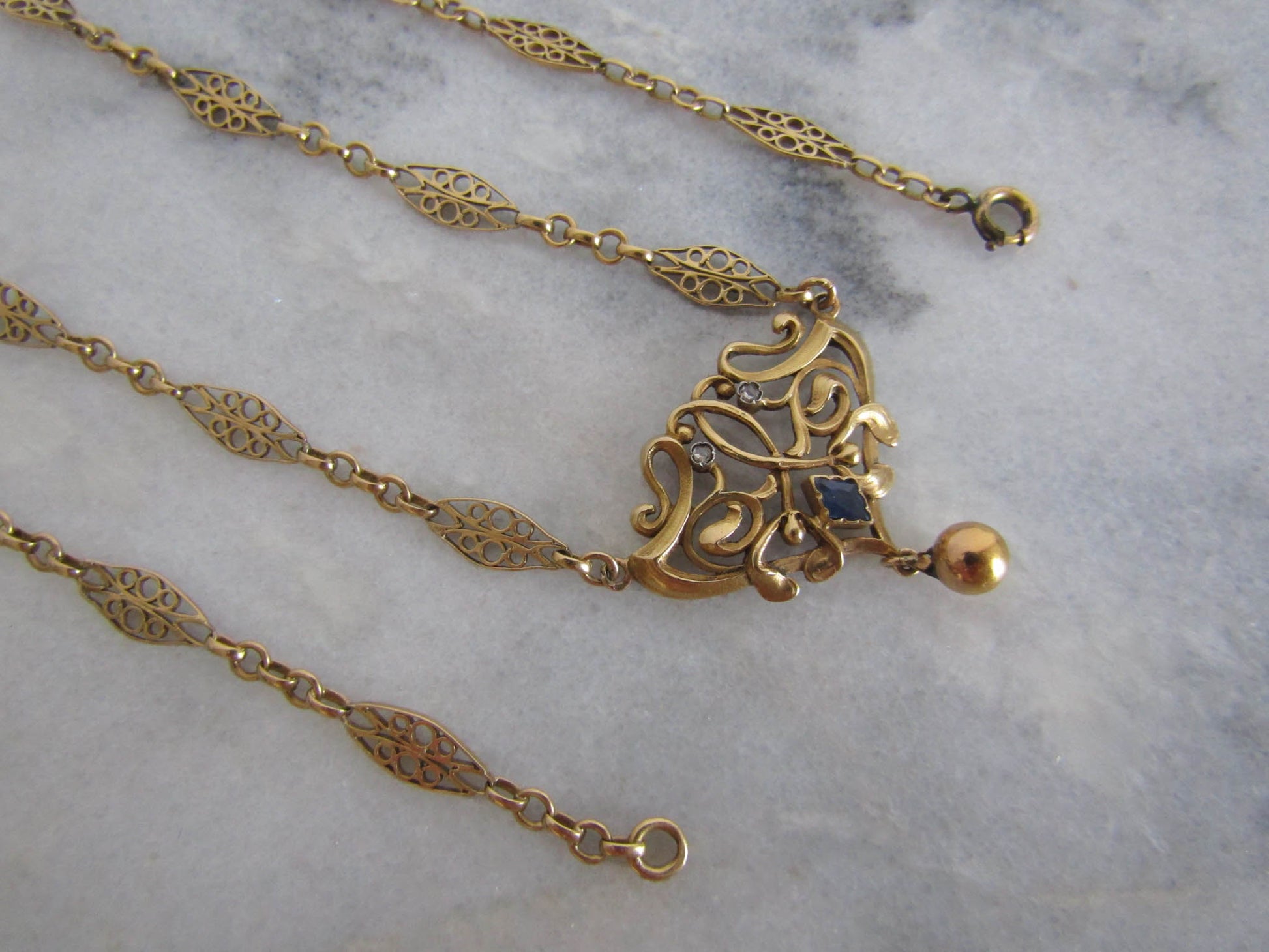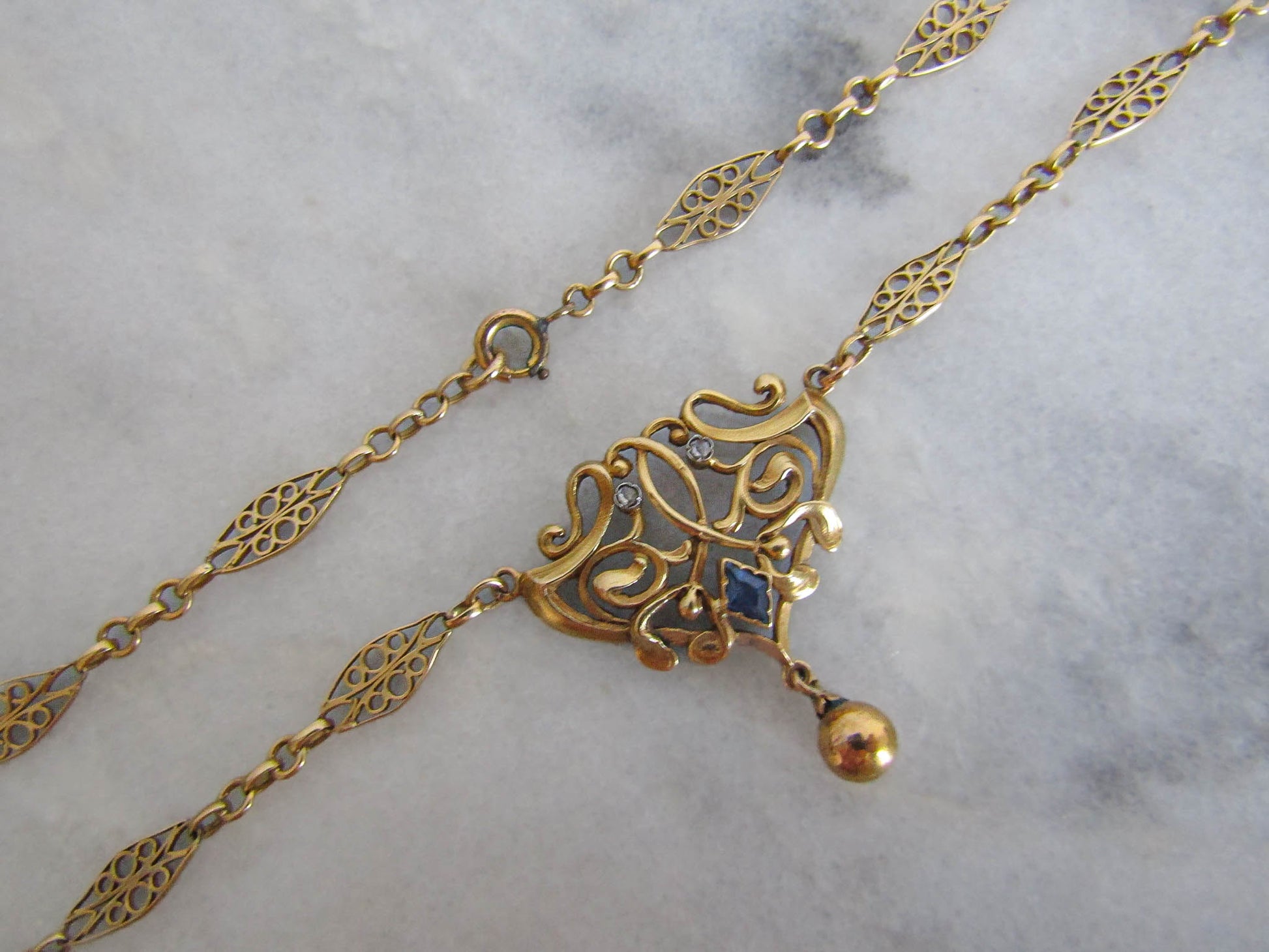 Beautiful and delicate, this pendant necklace holds a sculpted design of curved lines and mistletoe, embedded with two small rose cut diamonds and centered with a synthetic sapphire. Crafted around the turn of the century, it is a gorgeous example of the French Art Nouveau movement. The central pendant is connected to a chain of flat navette links with interior filigree work. Together the chain and pendant make a unique and rare combination that is sure to be a showstopping piece for any occasion.