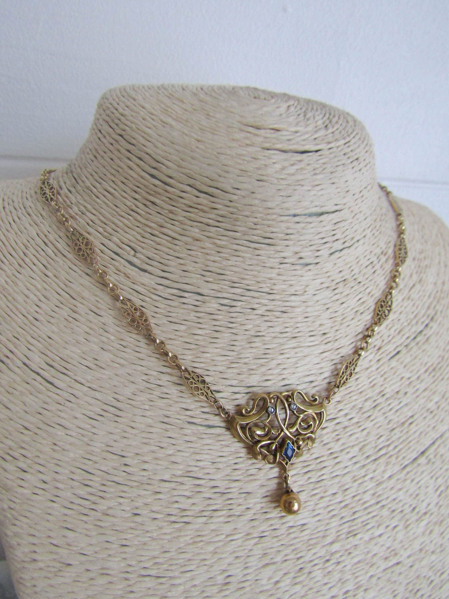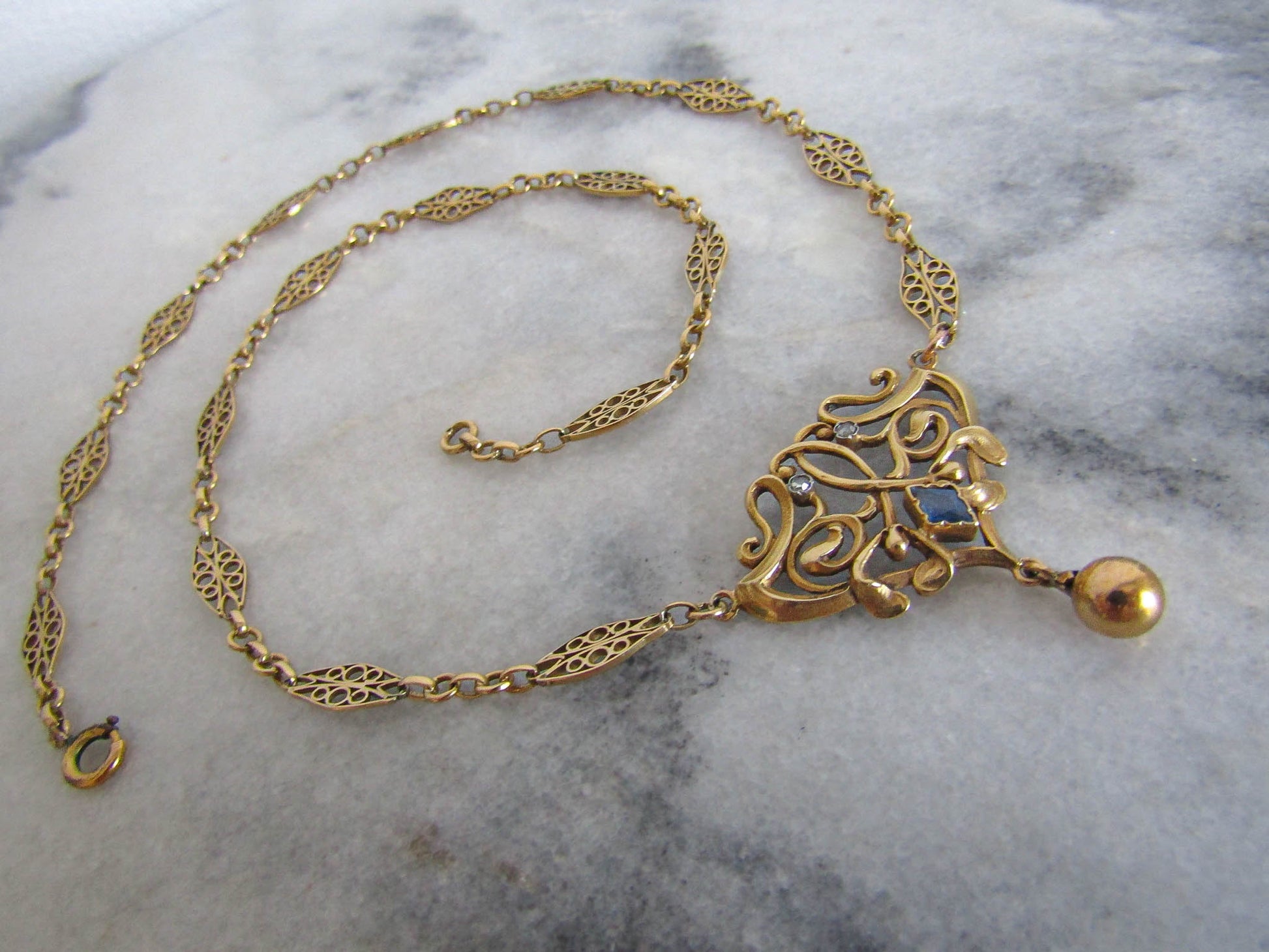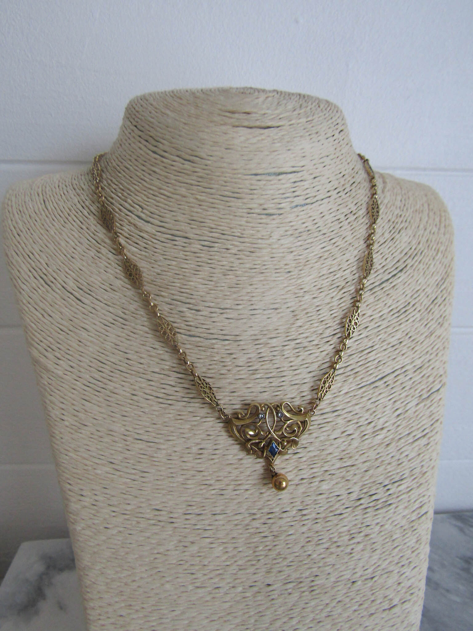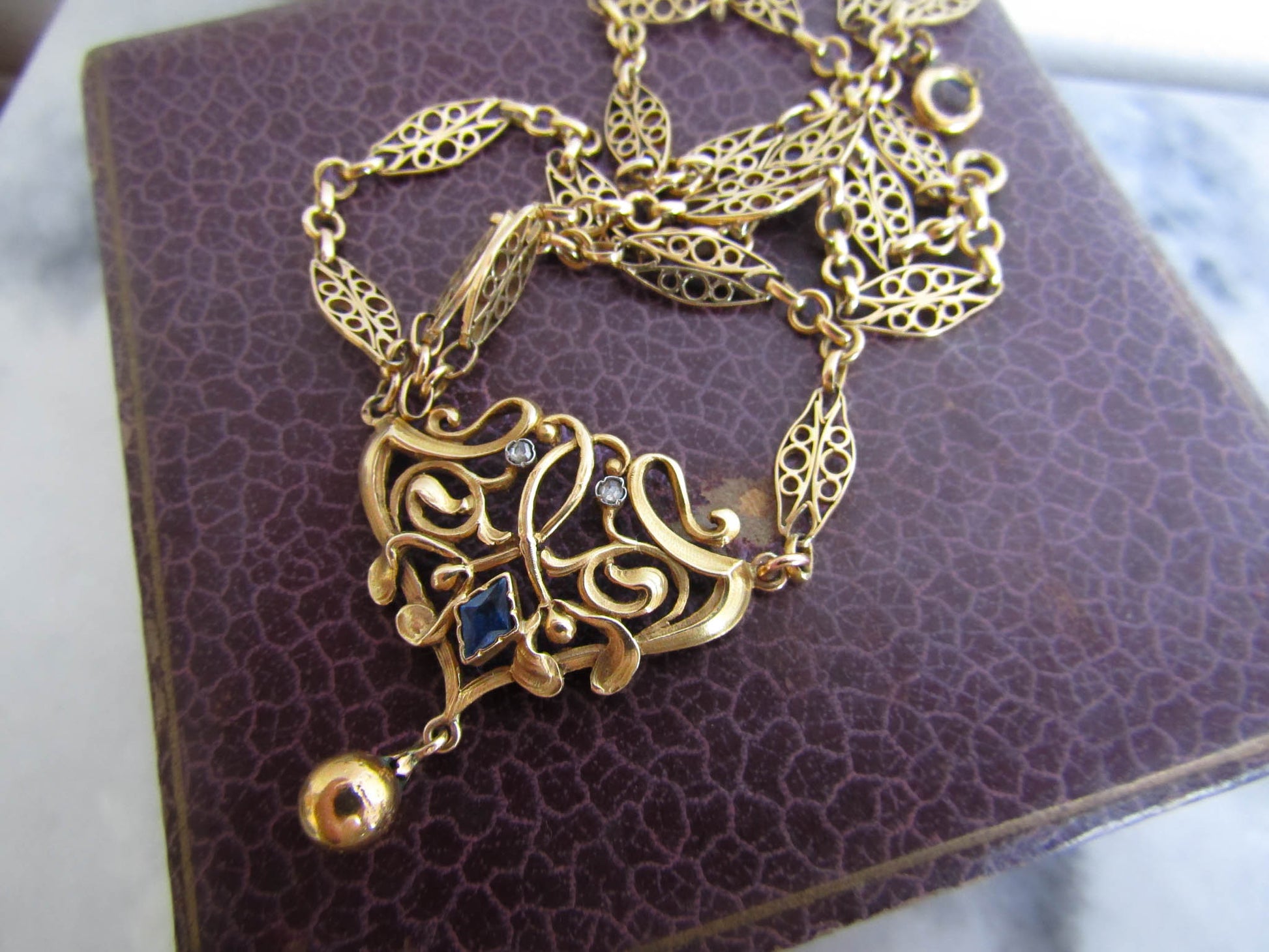 Beautiful and delicate, this pendant necklace holds a sculpted design of curved lines and mistletoe, embedded with two small rose cut diamonds and centered with a synthetic sapphire. Crafted around the turn of the century, it is a gorgeous example of the French Art Nouveau movement. The central pendant is connected to a chain of flat navette links with interior filigree work. Together the chain and pendant make a unique and rare combination that is sure to be a showstopping piece for any occasion.