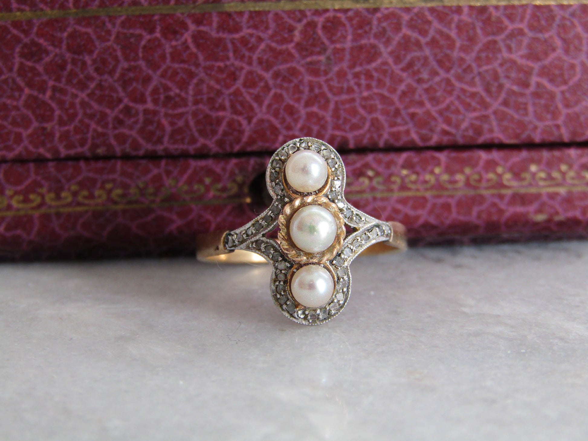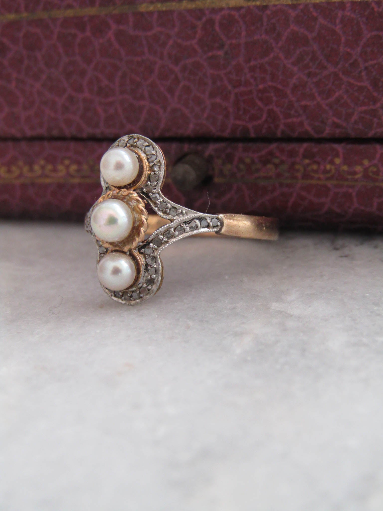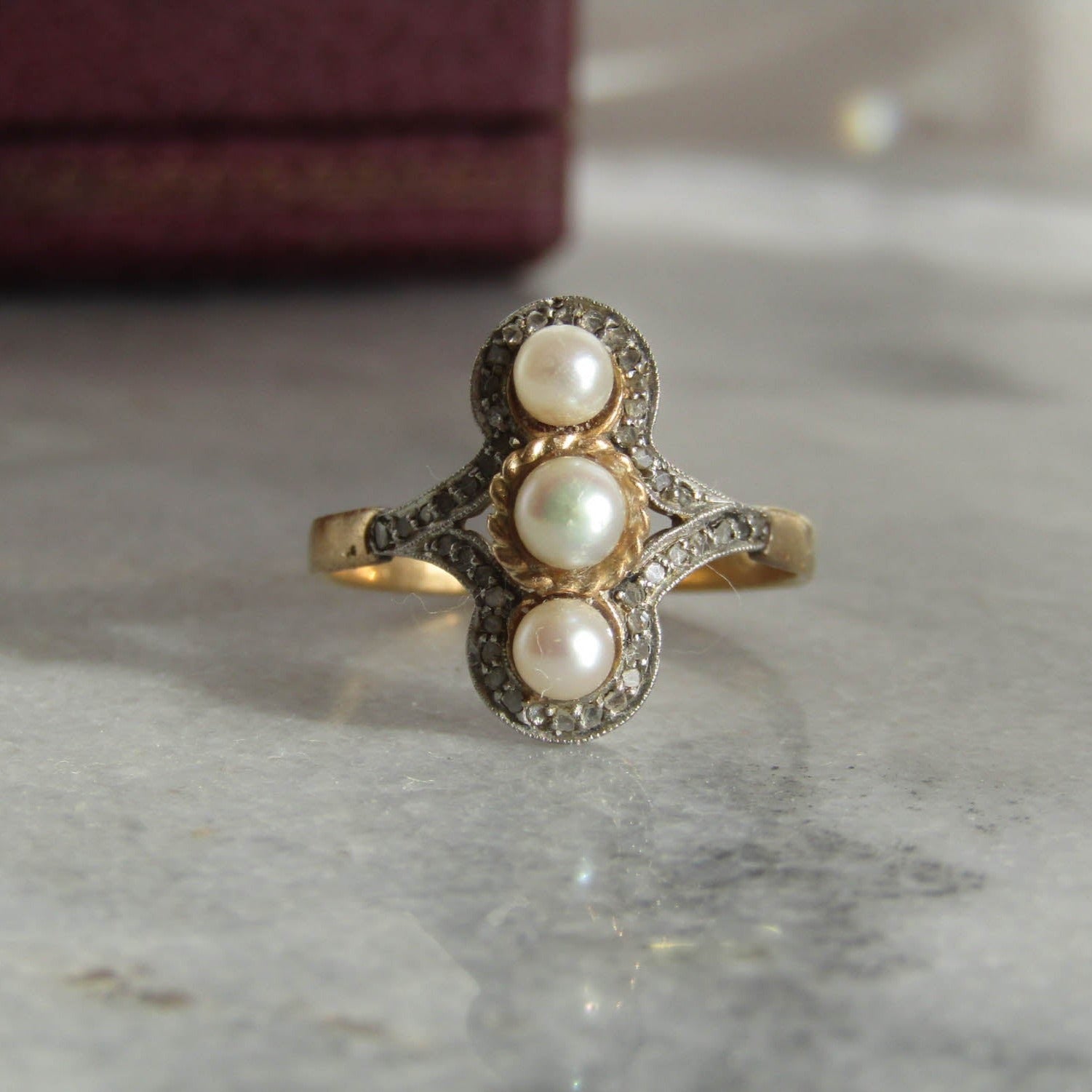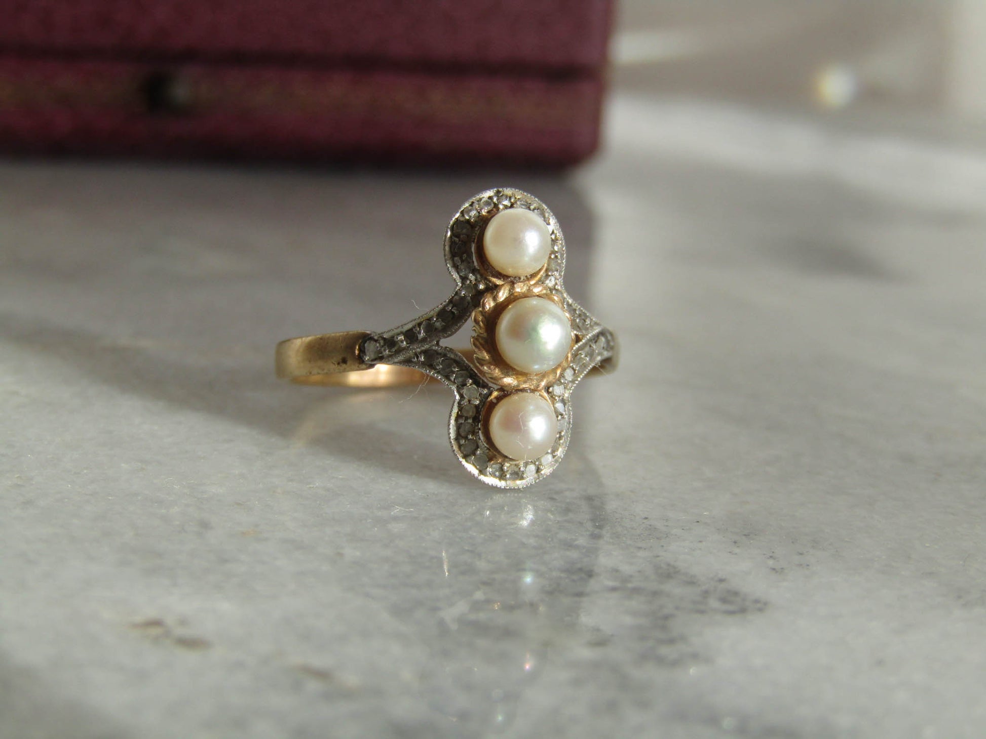 This sweet beauty was most probably used an an engagement ring as the interior band is engraved with a date that has been worn with time. It features a rich, buttery yellow gold band with a platinum head inlaid with diamond chips and three large pearls. As the ring was crafted around the turn of the century, it is highly likely that the pearls are natural as the ring predates the manufacture of cultured pearls. It has a sought after trilogy shield design which was very "of the era" and difficult to find nowadays. The ring itself is a beautiful reminder of a time gone by and love that persists through the ages. It is obvious that it was a cherished piece as the band is well worn, standing as a testament to its importance to the wearer. The hallmark is no longer visible on the band but the ring tests as 18k gold by touch stone and the head tests as platinum, typical of the era and standard for French jewelry.